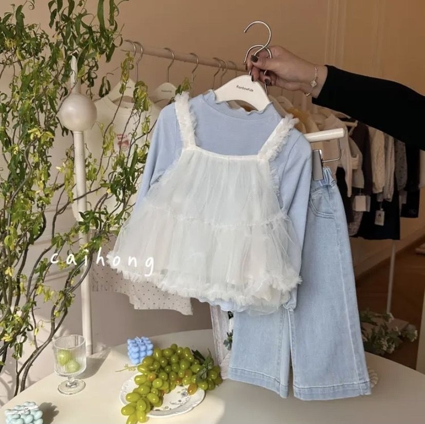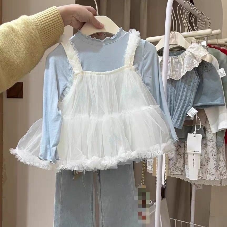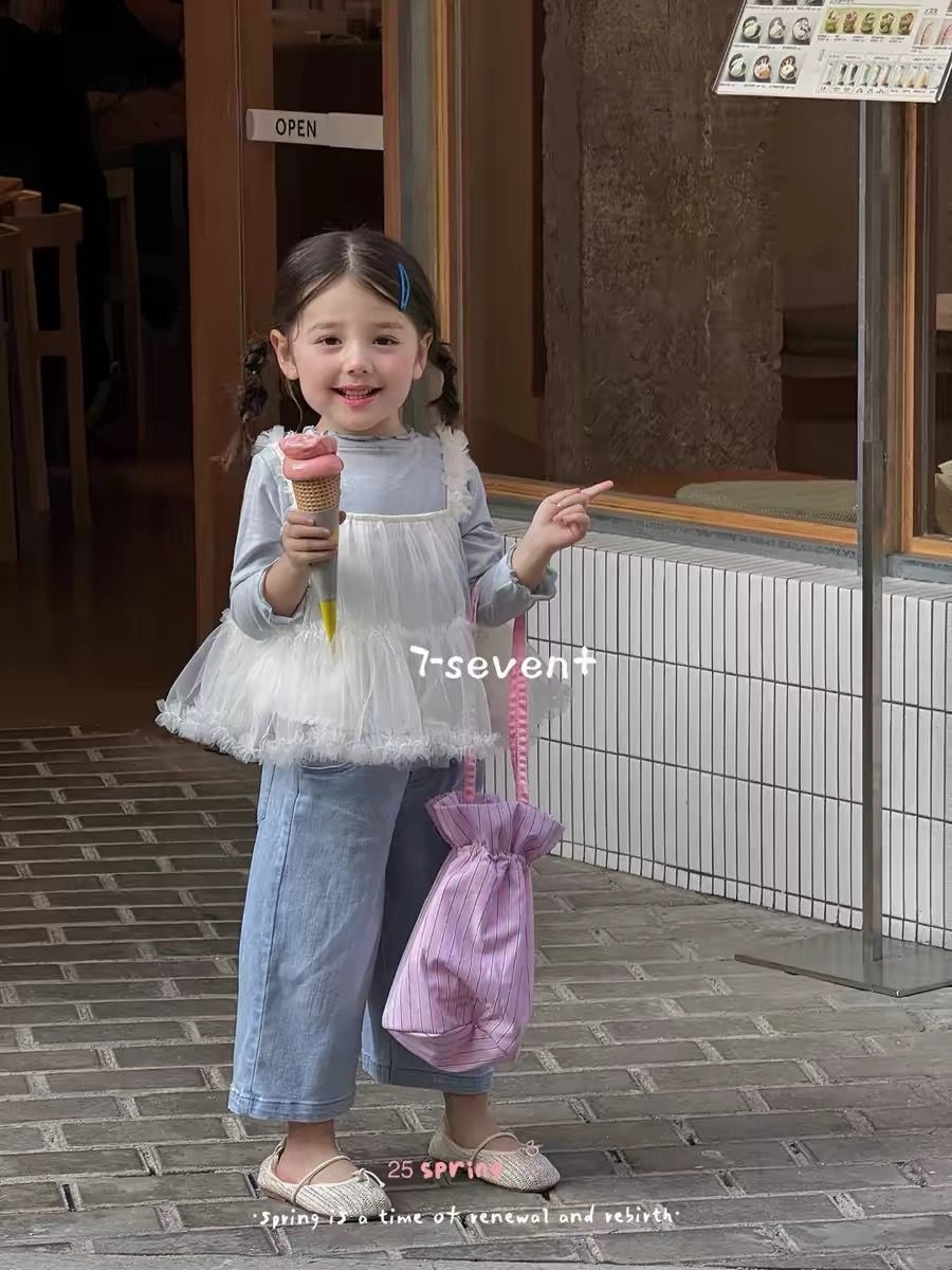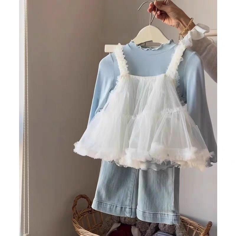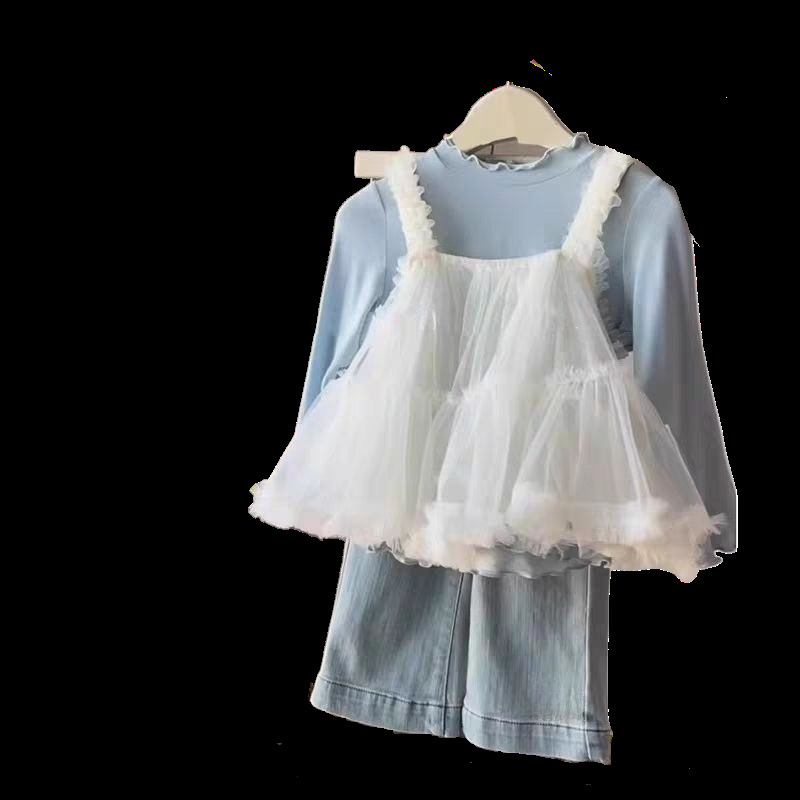 여아복 세트 2025 봄 신상 한국 스타일 여아 메쉬 멜빵 레깅스 청바지 3종 세트 한국 스타일 캐주얼스토어 가기