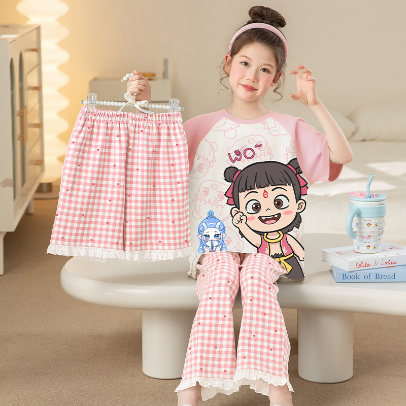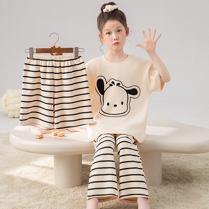 소녀 잠옷 여름 어린이 100% 면 반팔 바지 어린 소녀 큰 어린이 3 피스 세트 아기 홈 옷