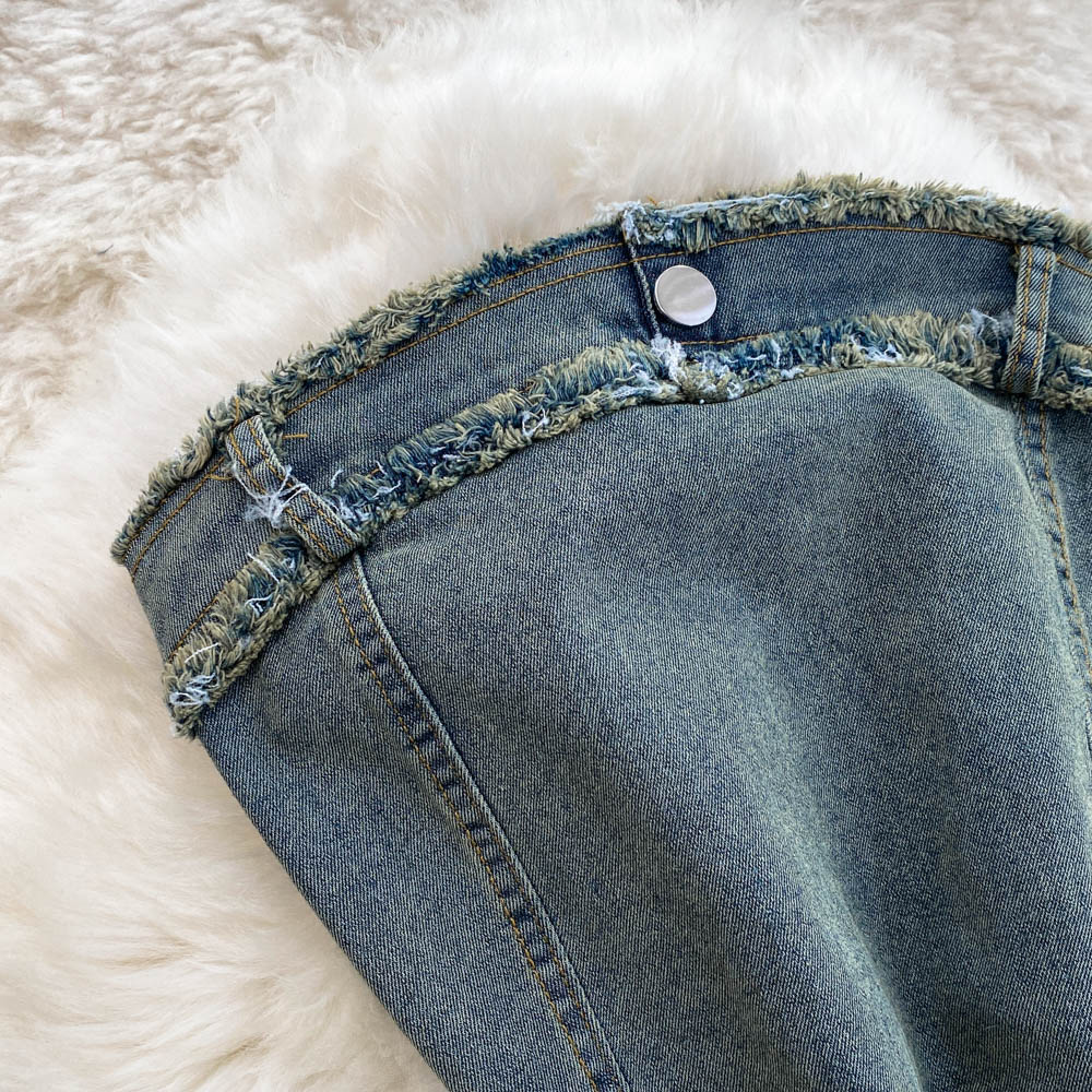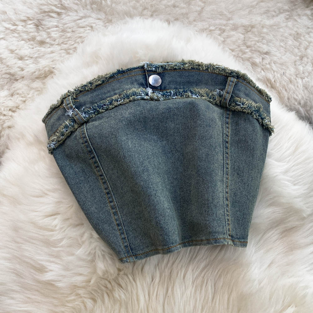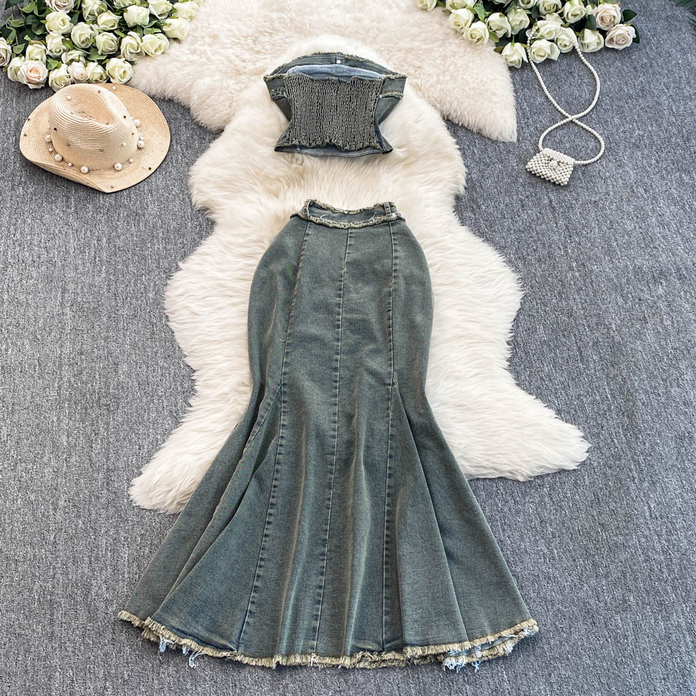 2025 새로운 여성복 녹 데님 튜브 탑 일치하는 인터넷 기념 거울 고등학교 긴 원피스 투피스 세트스토어 가기