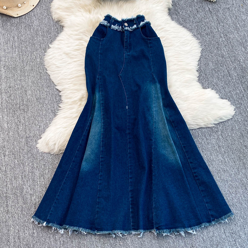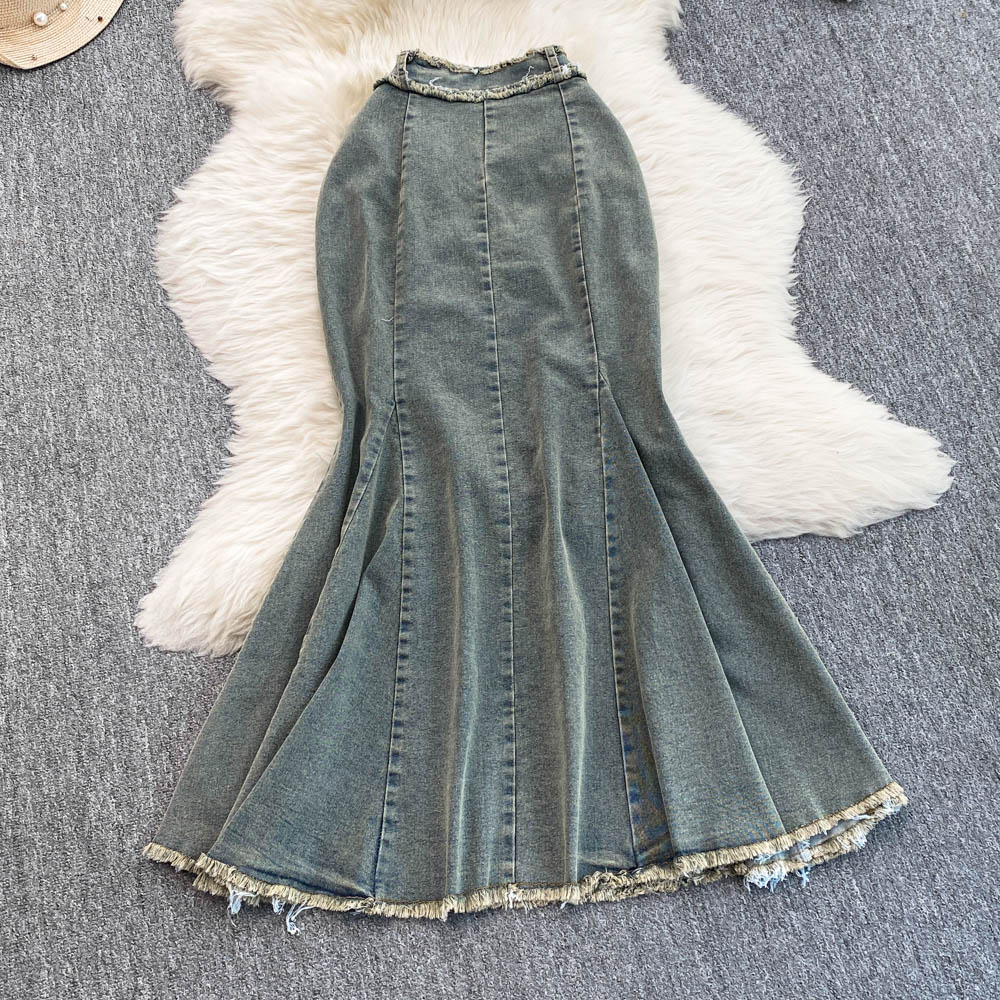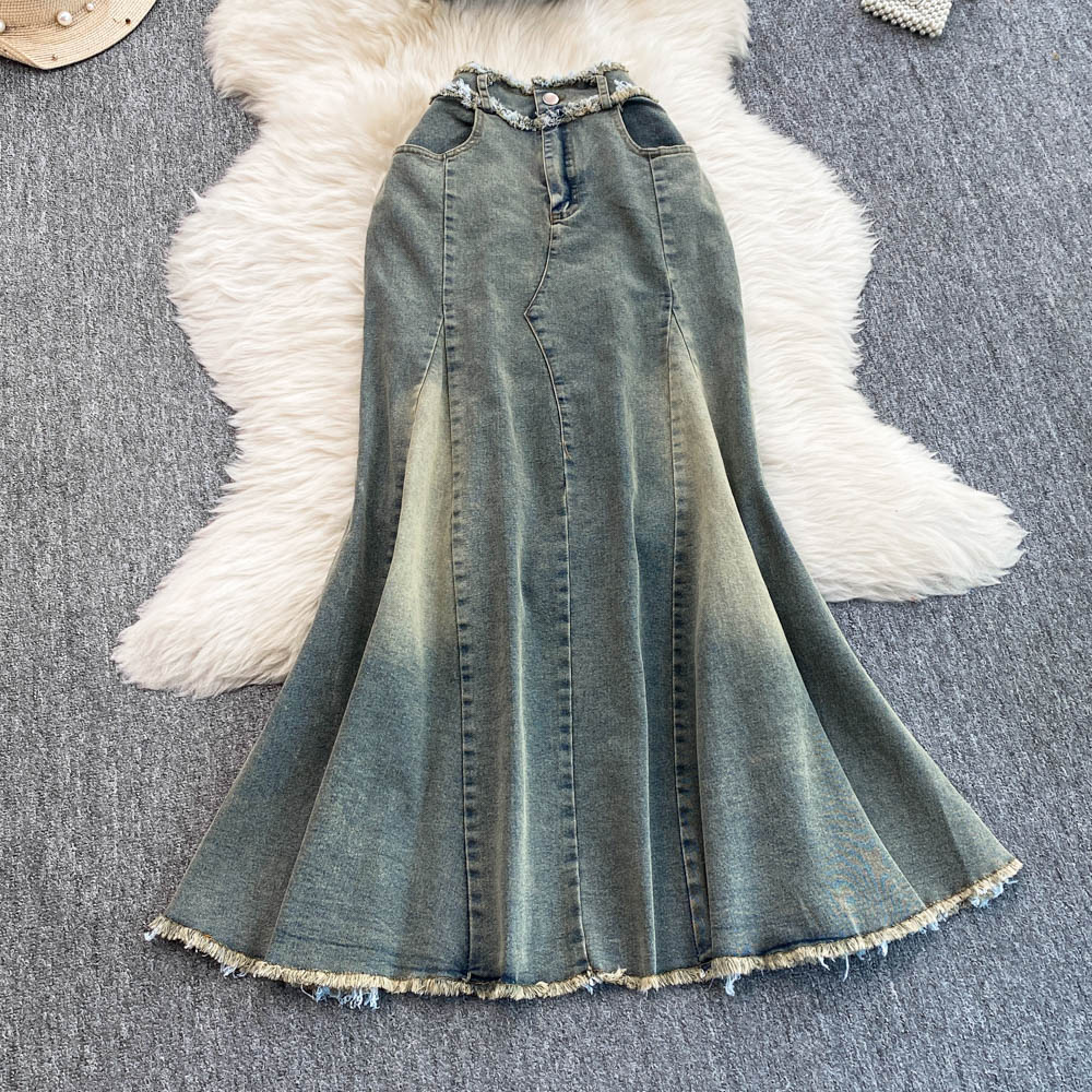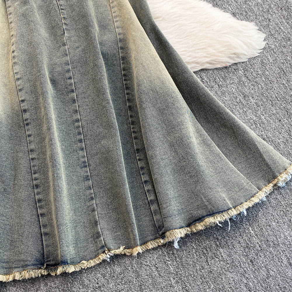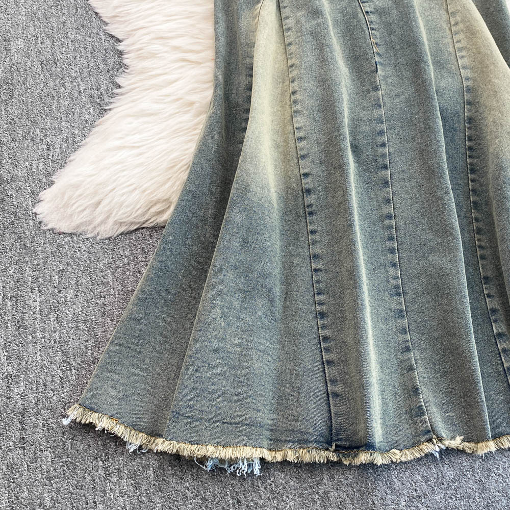 2025 새로운 여성복 녹 데님 튜브 탑 일치하는 인터넷 기념 거울 고등학교 긴 원피스 투피스 세트