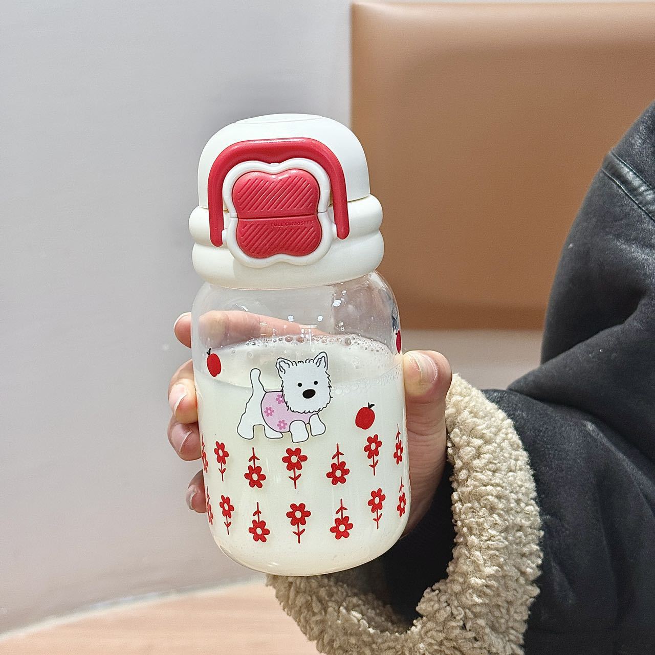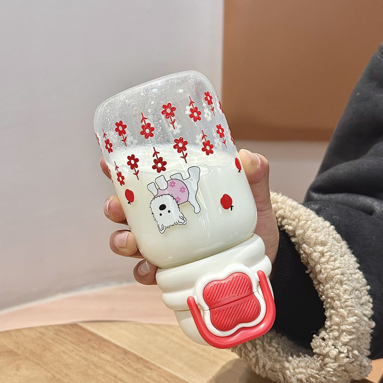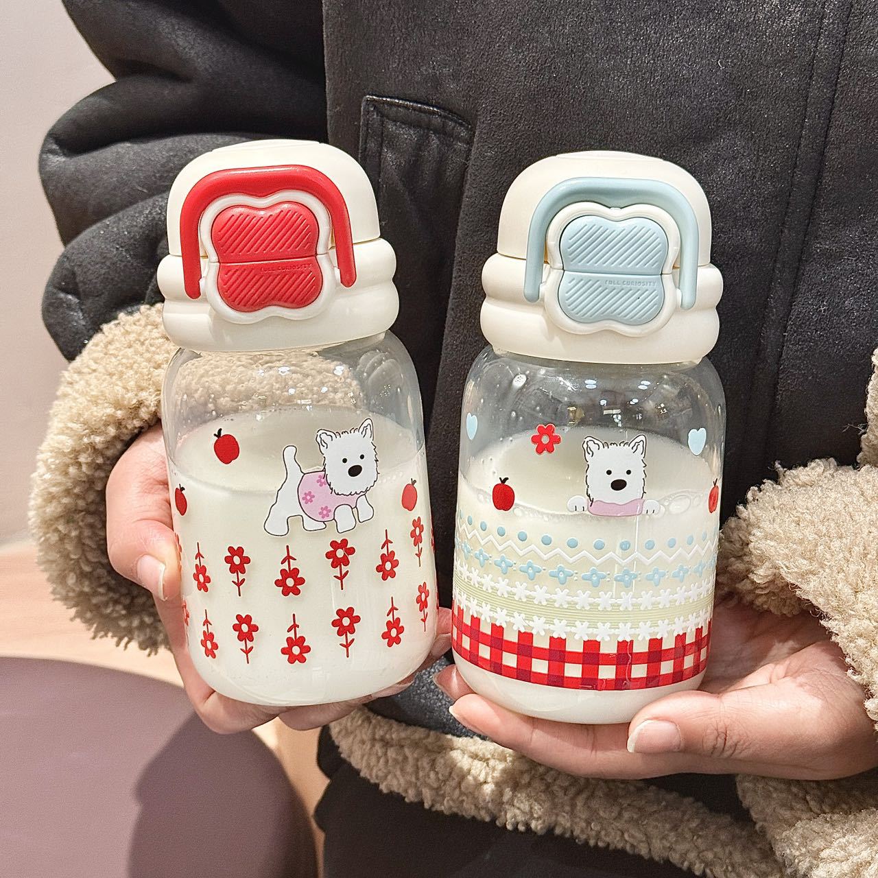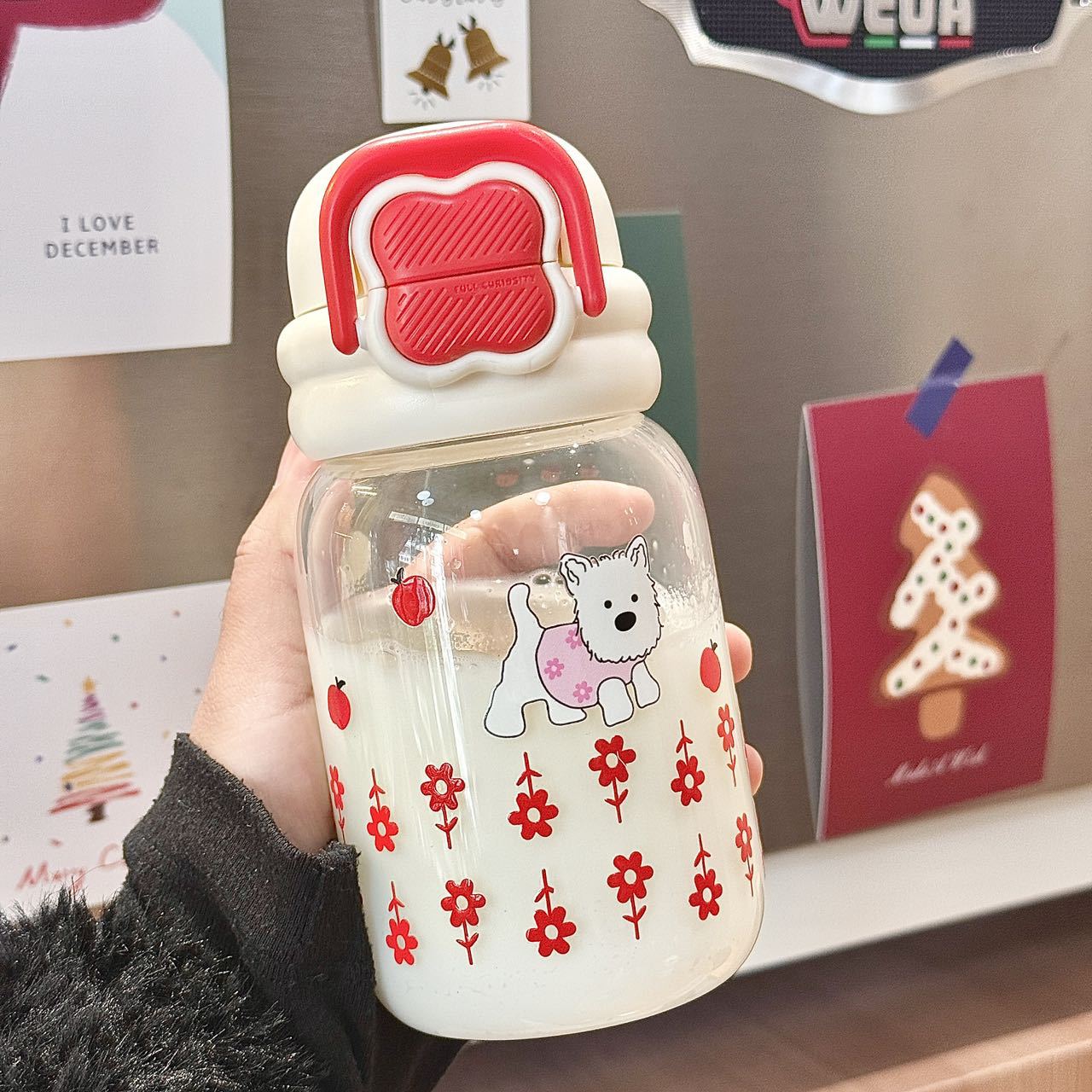 귀여운 더블 음료 만화 새로운 물 컵 유리 휴대용 컵 강아지 인터넷 축하 높은 붕규산 우유 분말 선물