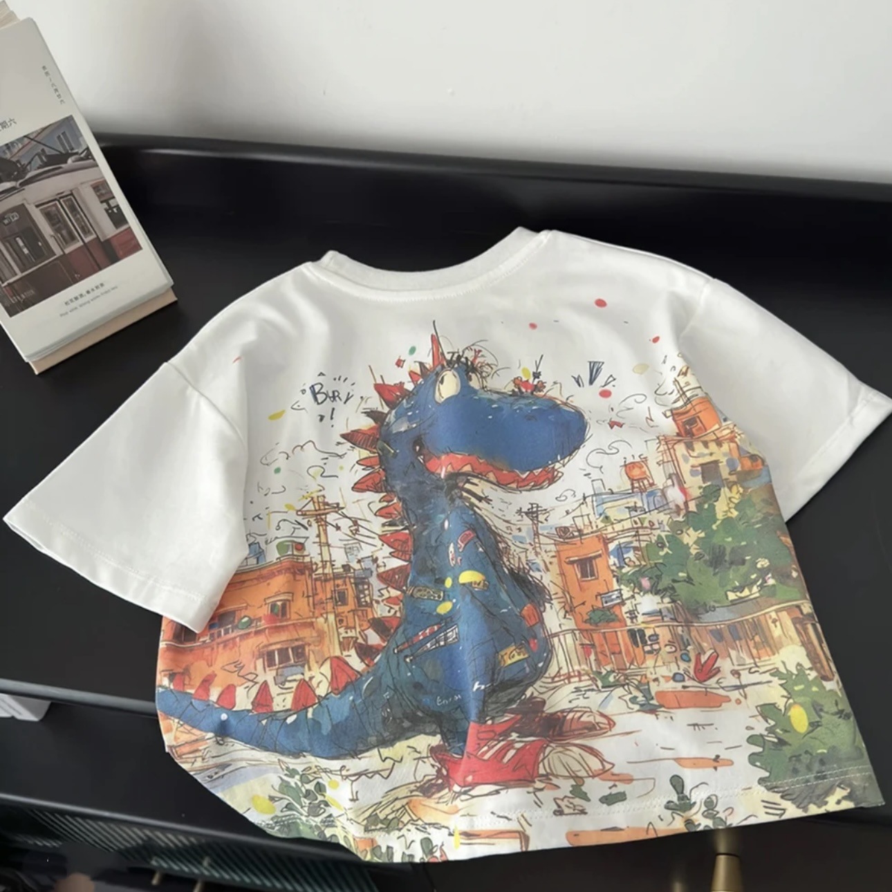새로운 어린이 여름 캐주얼 라운드 넥 디지털 인쇄 공룡 반팔 티셔츠 소년의 유행 외부 면화 탑 착용스토어 가기