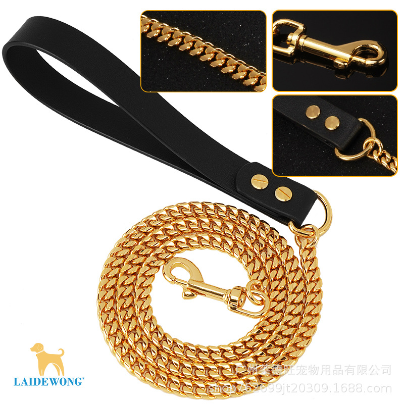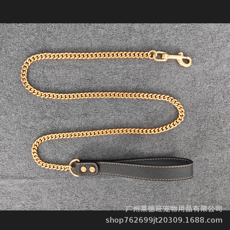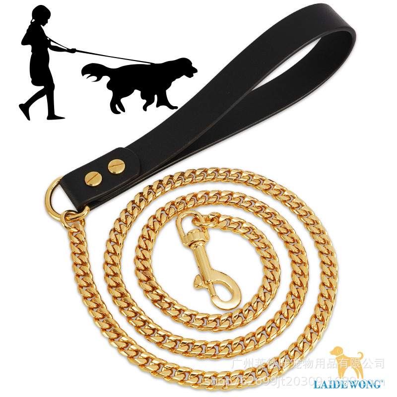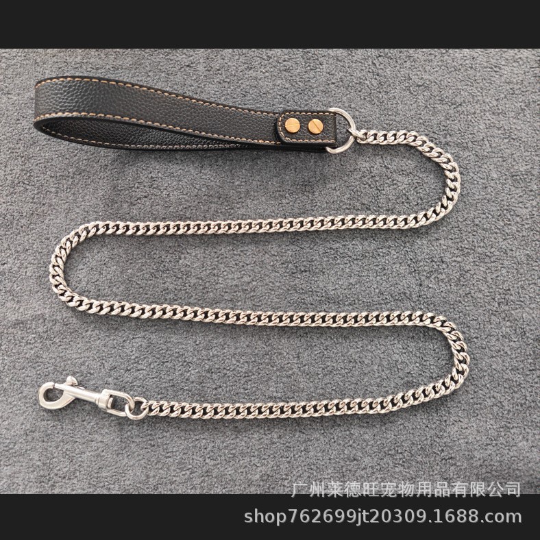 现货10mm不锈钢狗链牵引带皮把手精抛光加密古巴链宠物牵引跨境热销