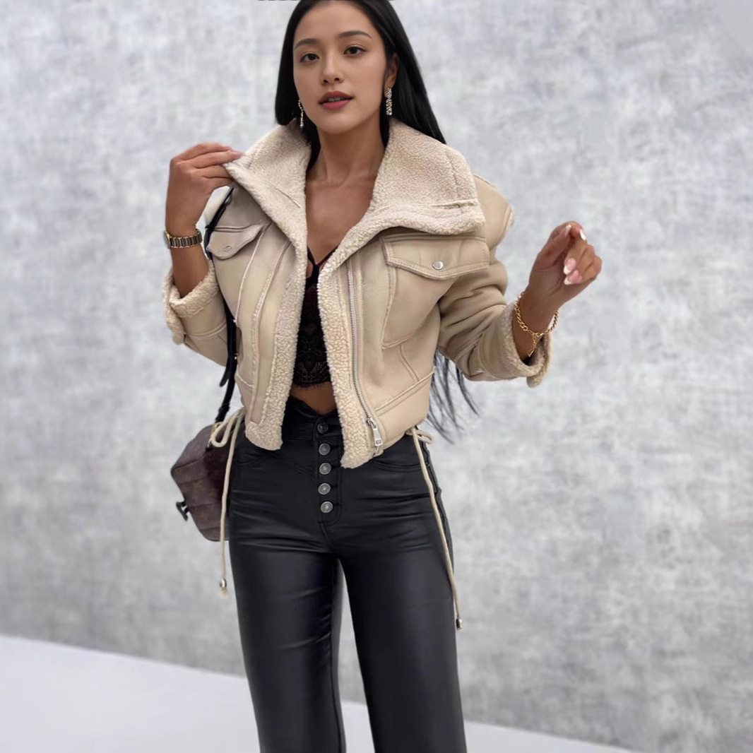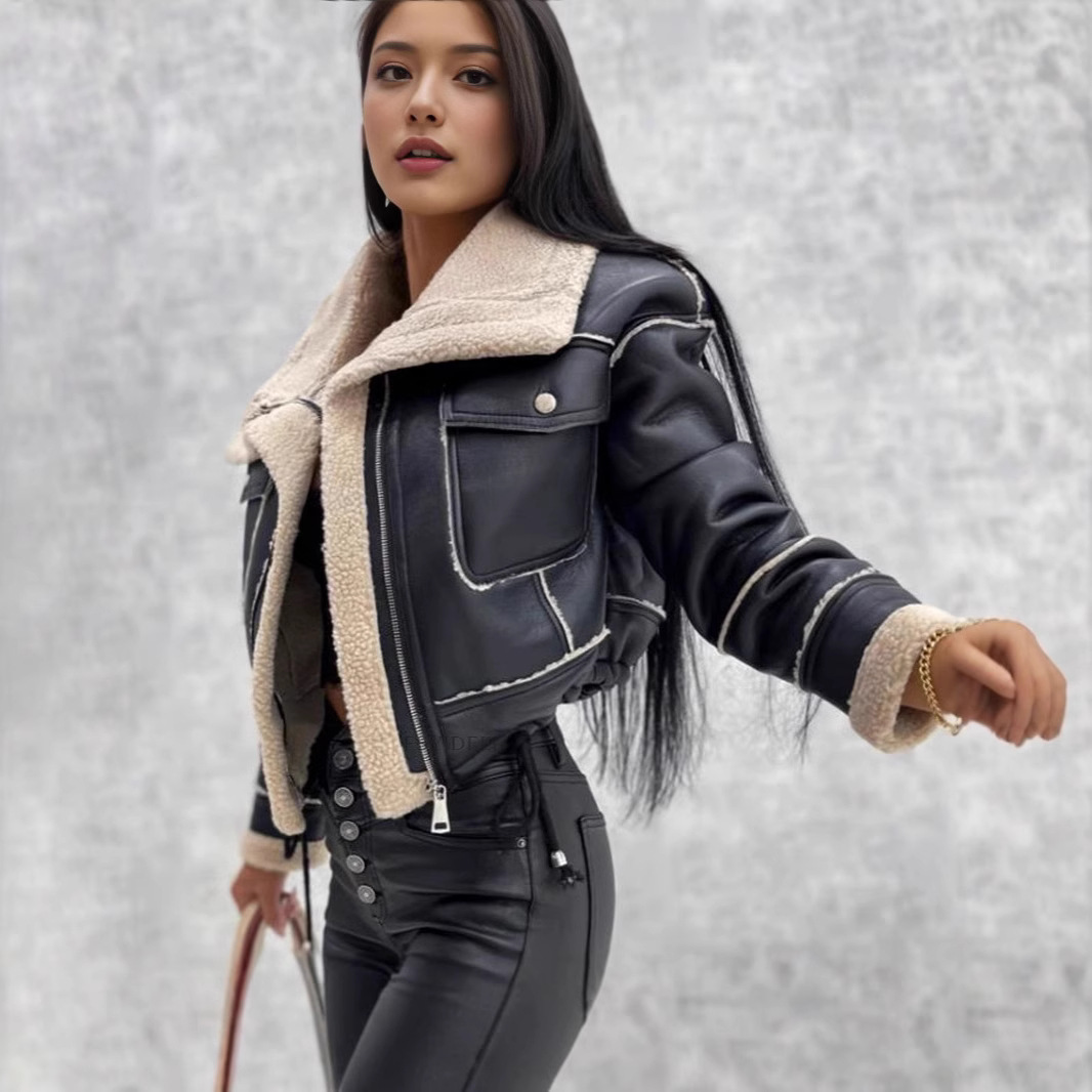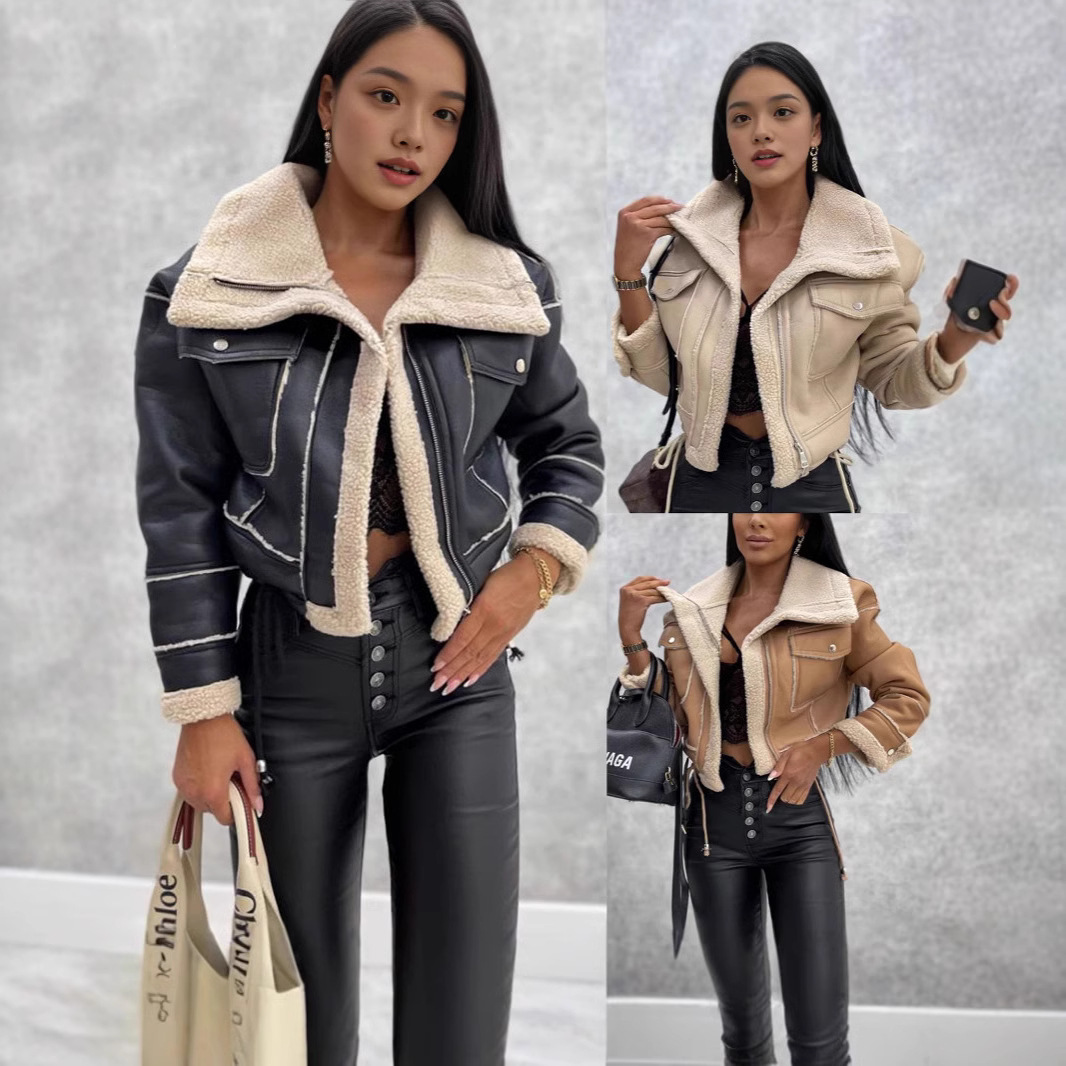 유럽과 미국의 여성 코트 가을 겨울 양고기 양모 짧은 여성용 코트 지퍼 자동차 스타일 PU 가죽 자켓