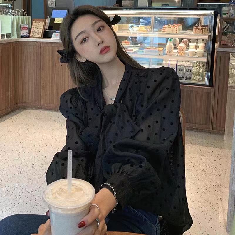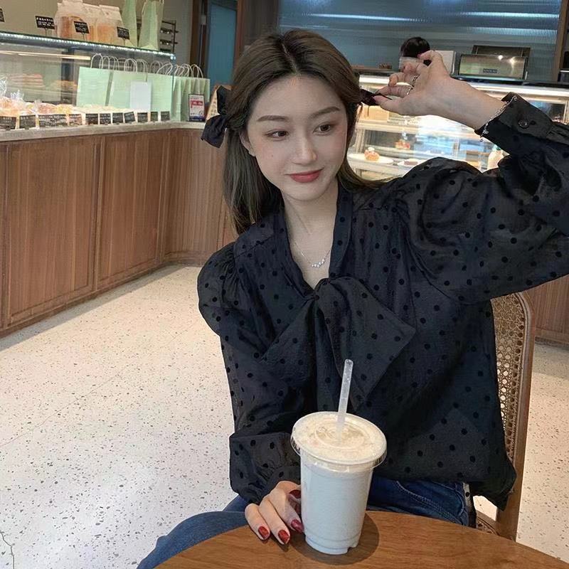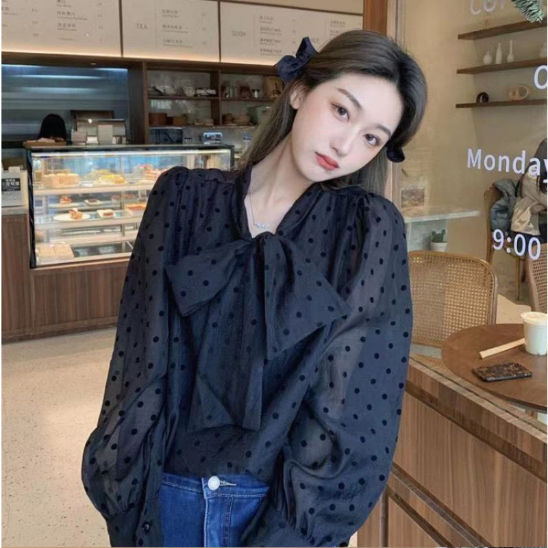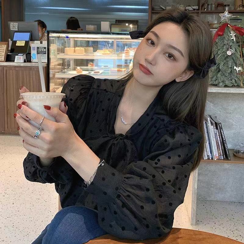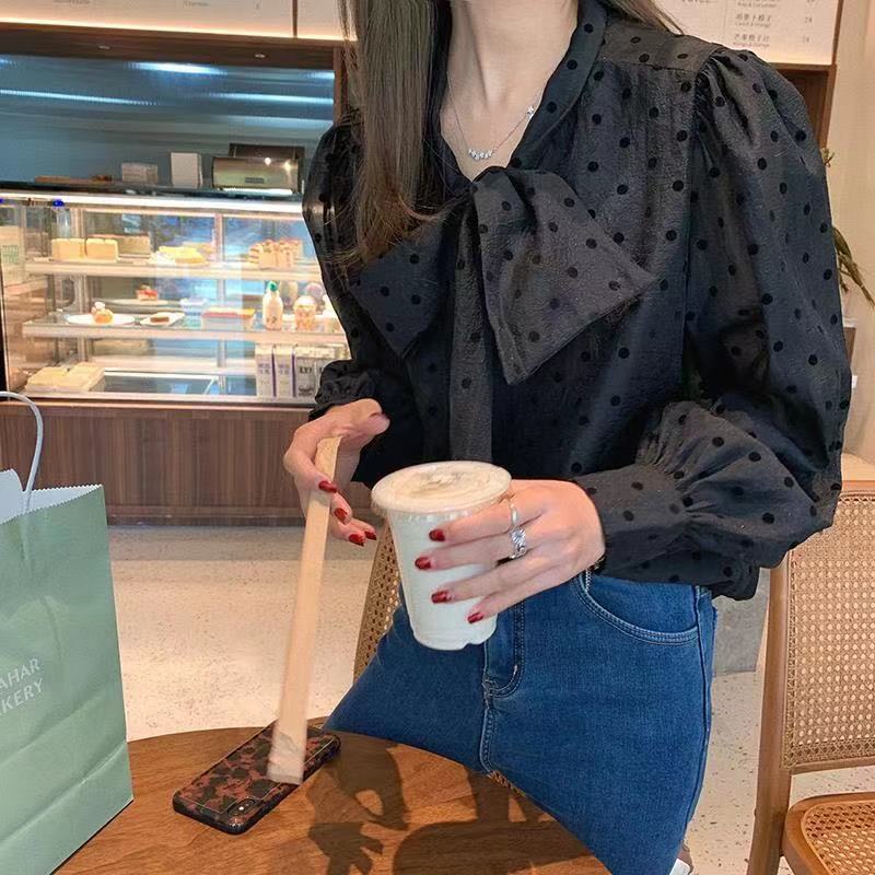 폴로 도트 셔츠 여성용 프랑스 스타일 부드러운 스타일 봄 2025 새로운 도착 활 레이스 업 퍼프 슬리브 우아한 긴팔 탑스토어 가기
