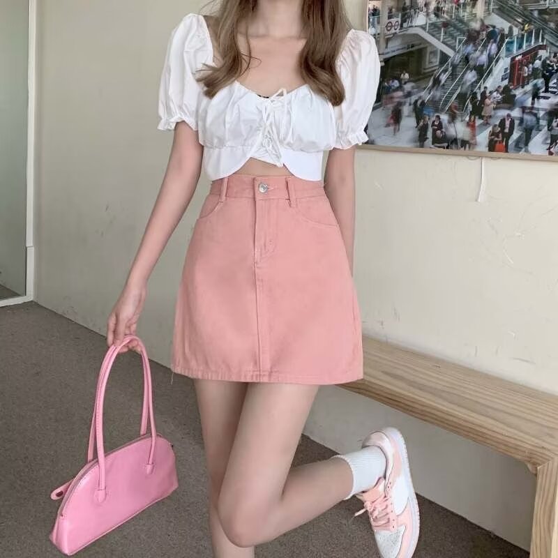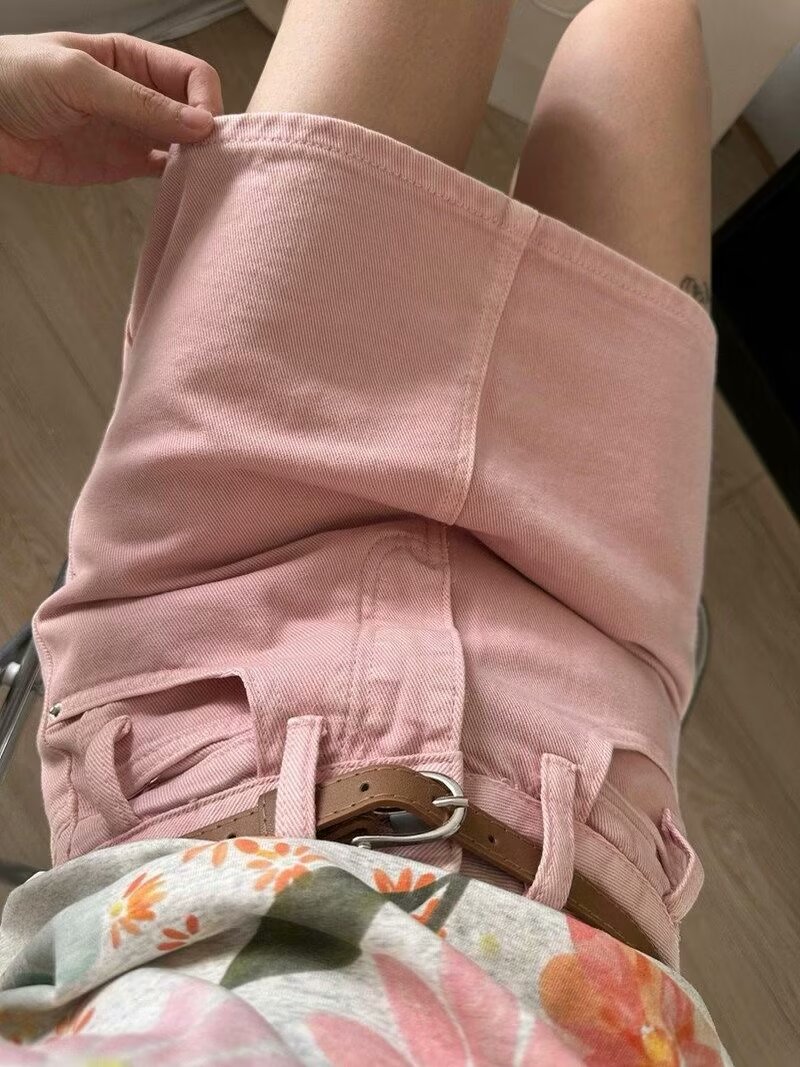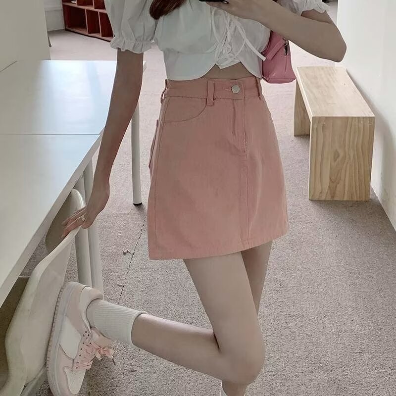 데님 짧은 치마 여자 여름 뜨거운 소녀 높은 허리 슬림 A 라인 하프 스커트 올 매치 힙합 스커트 트렌디 데님 스커트 핑크
