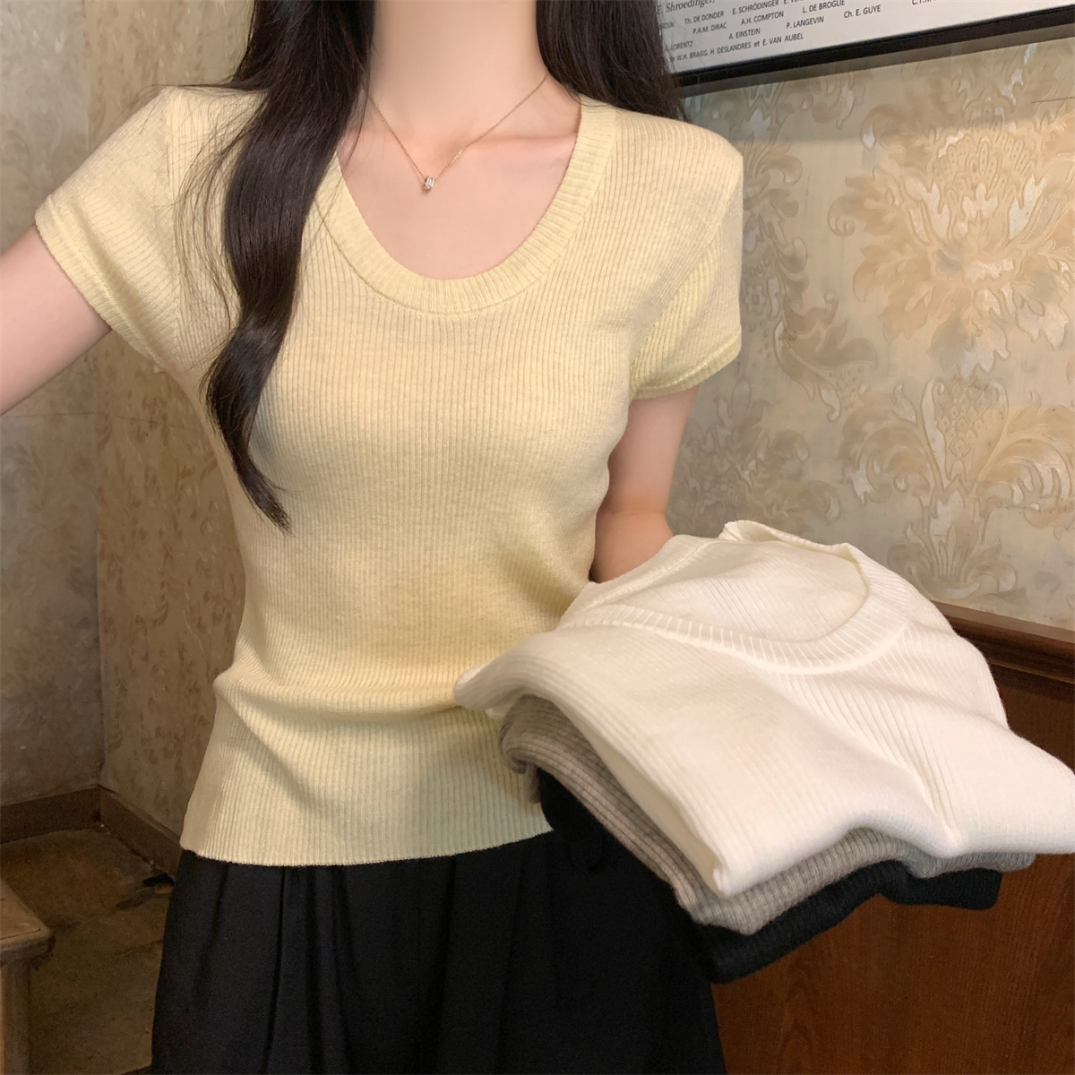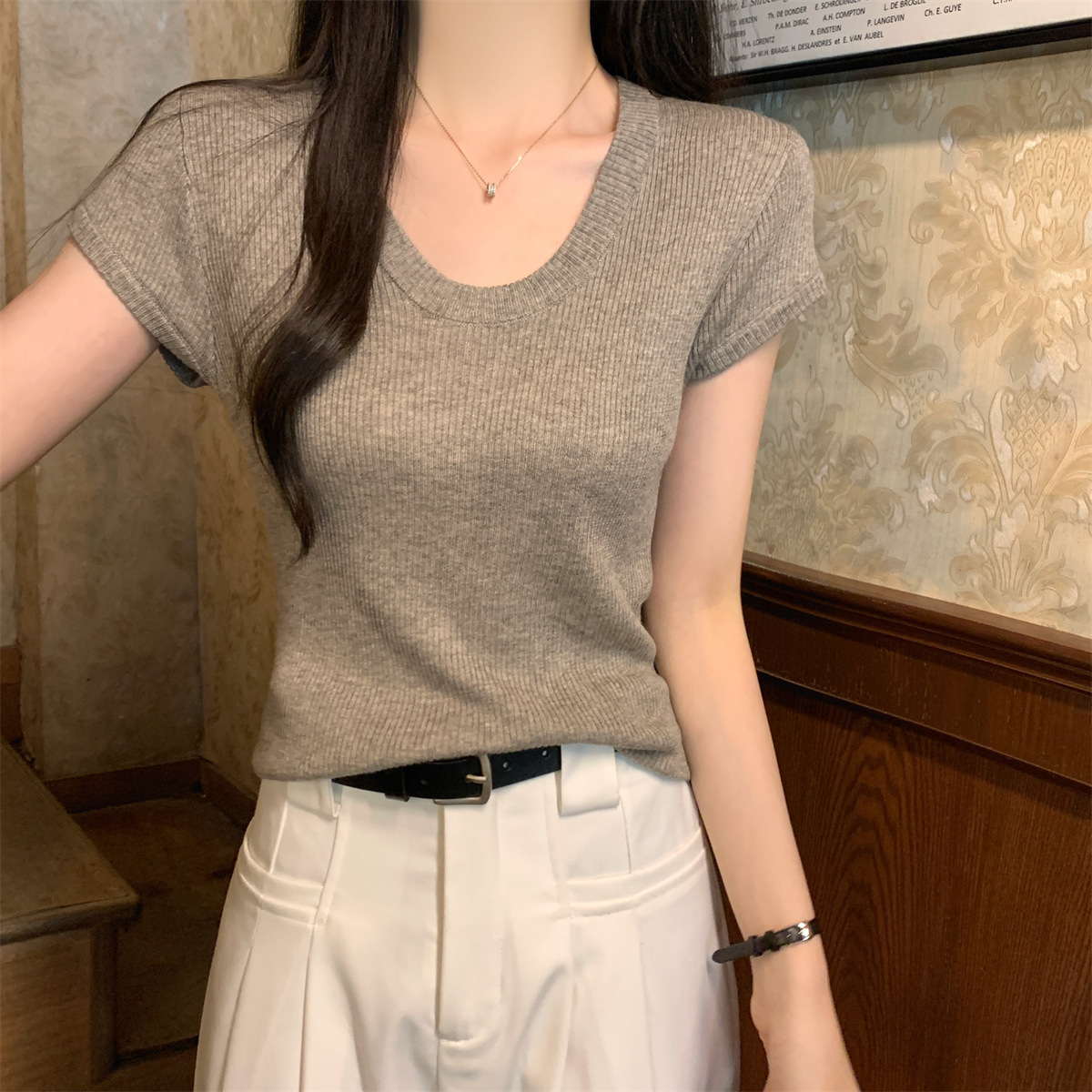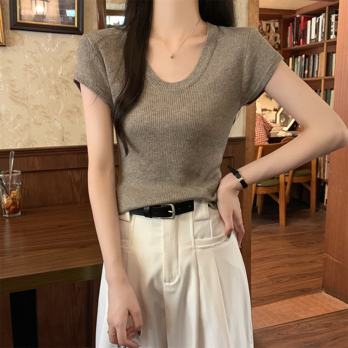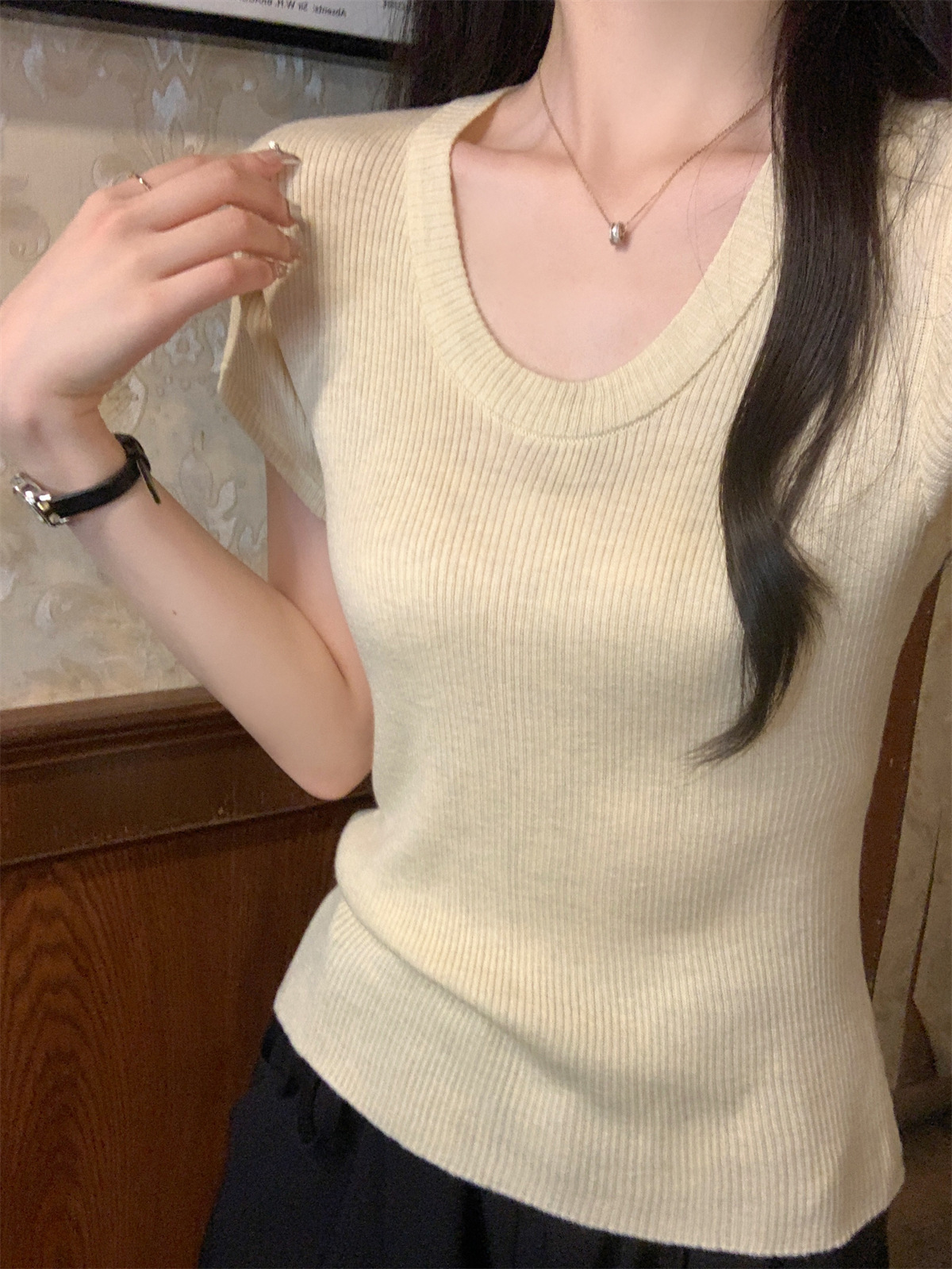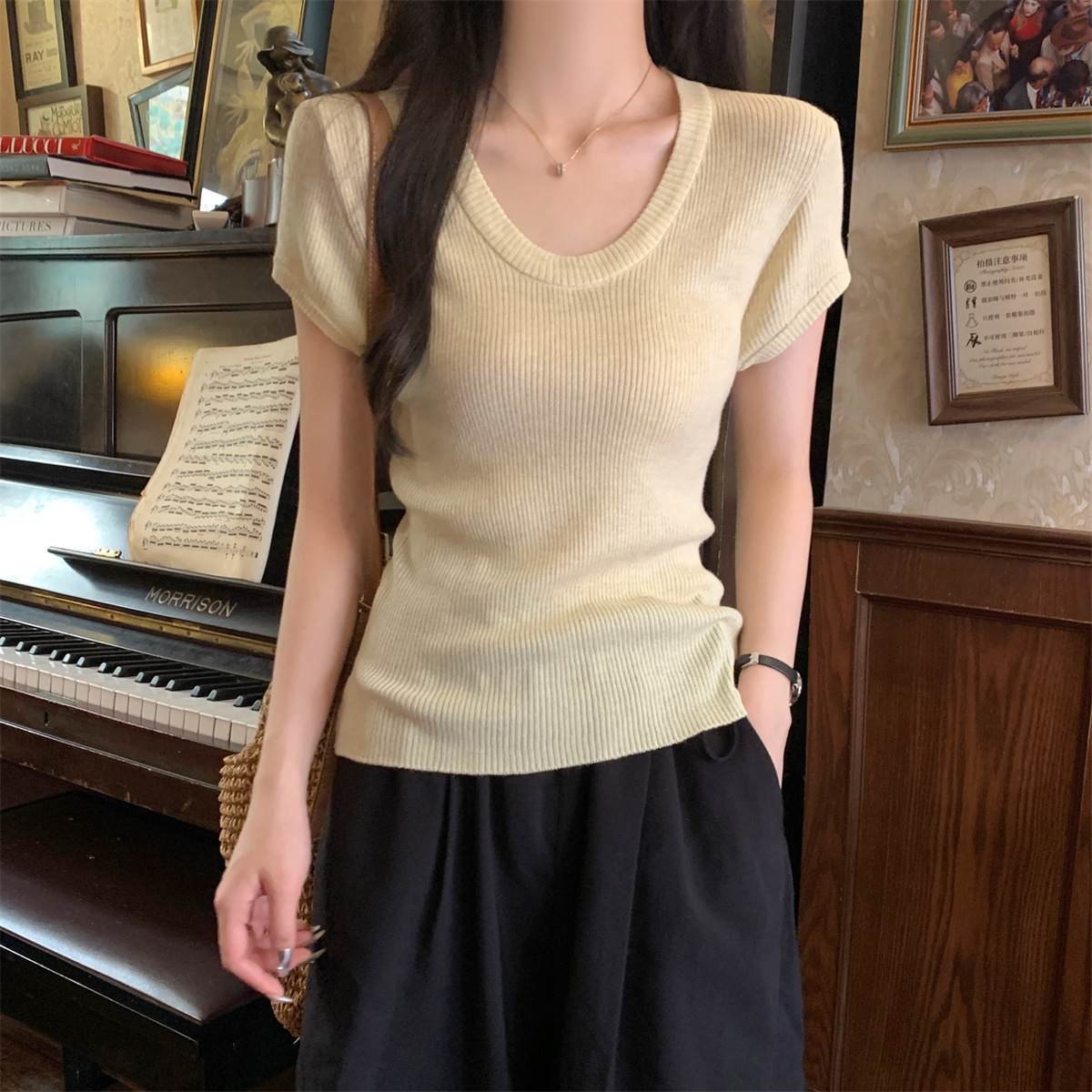 2026년 여름 한국 스타일 우아한 U넥 슬림핏 심플하고 다용도로 활용 가능한 6울 니트 반팔 티셔츠 여성 상의스토어 가기