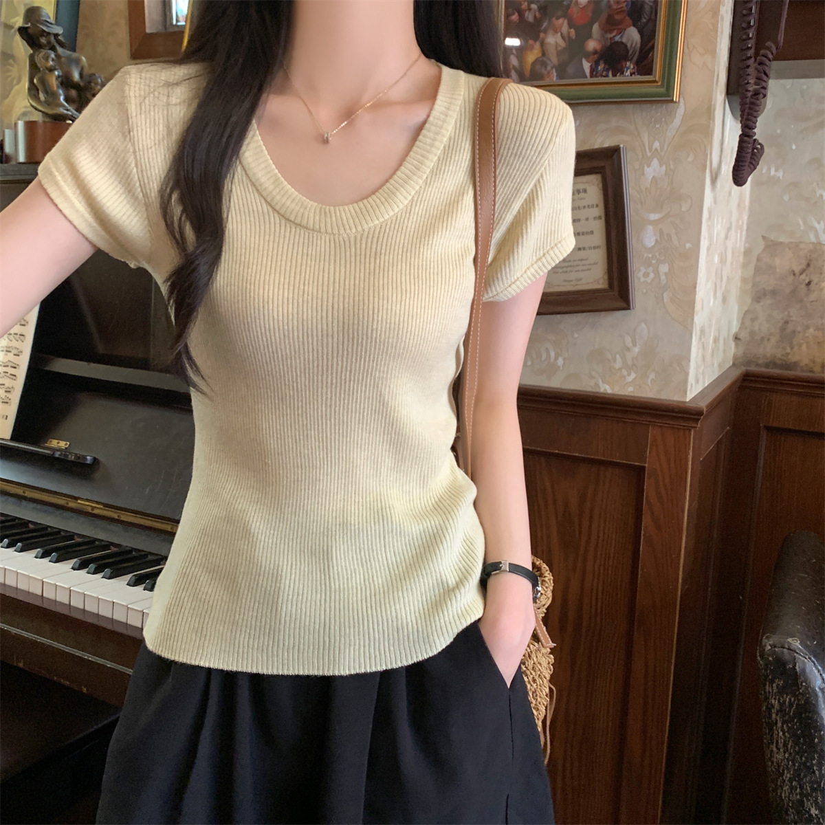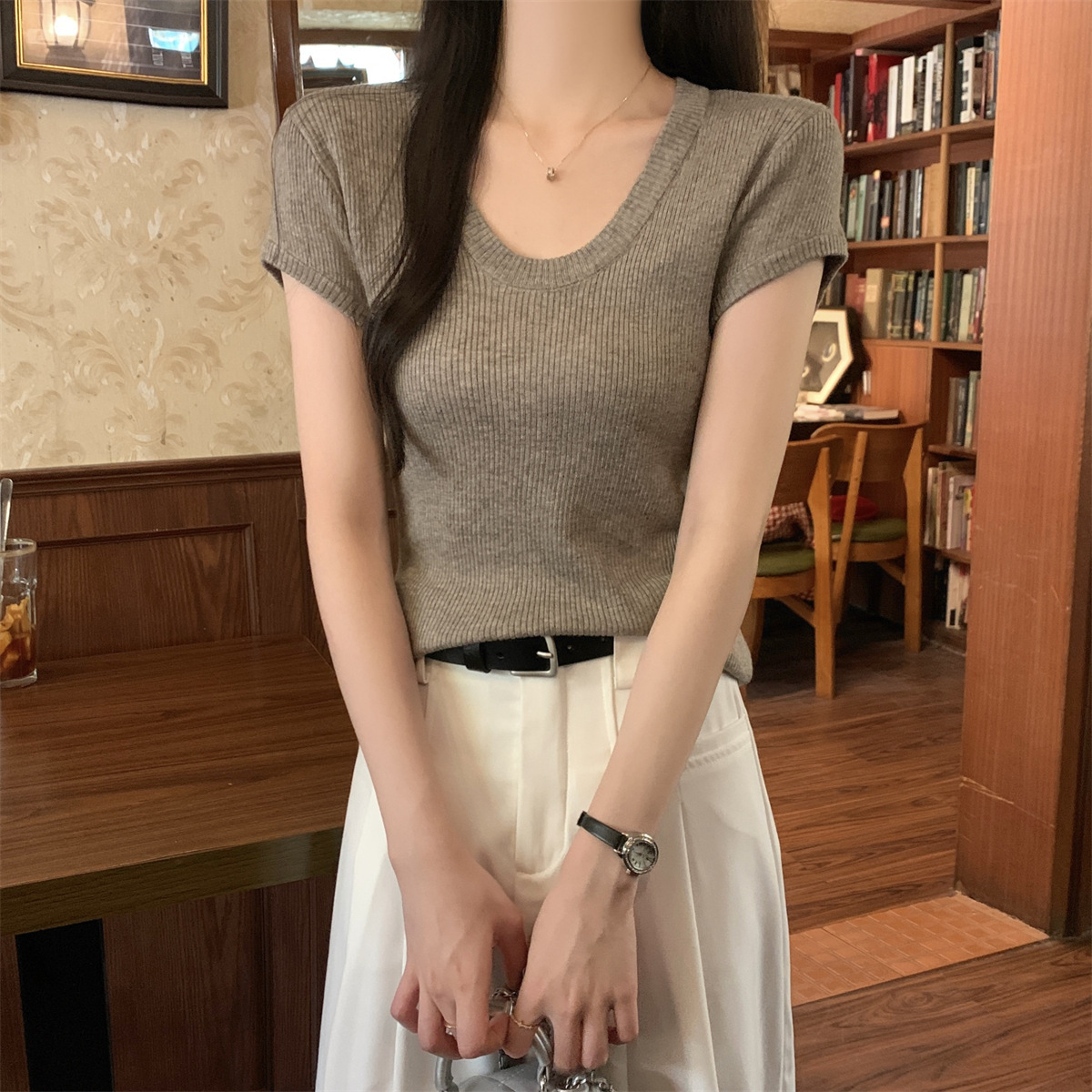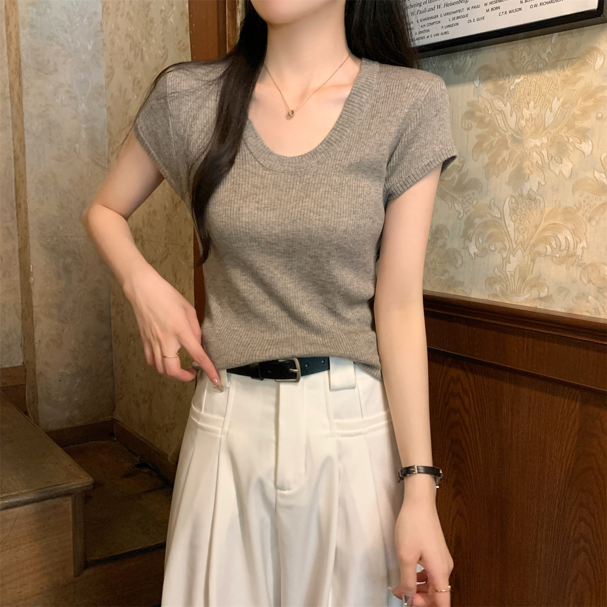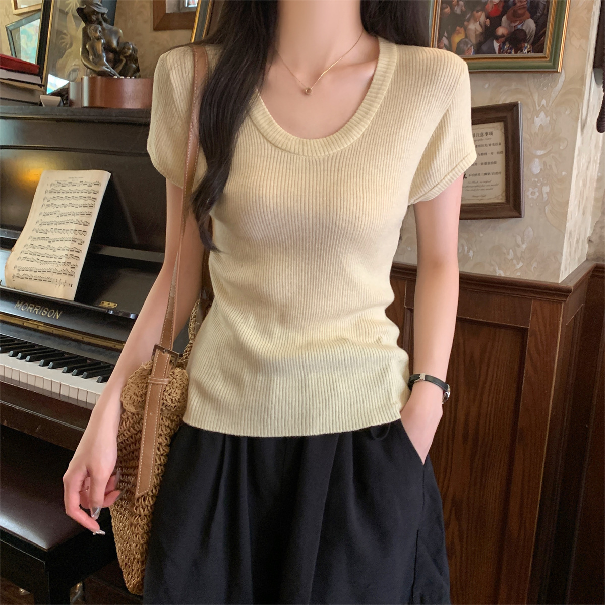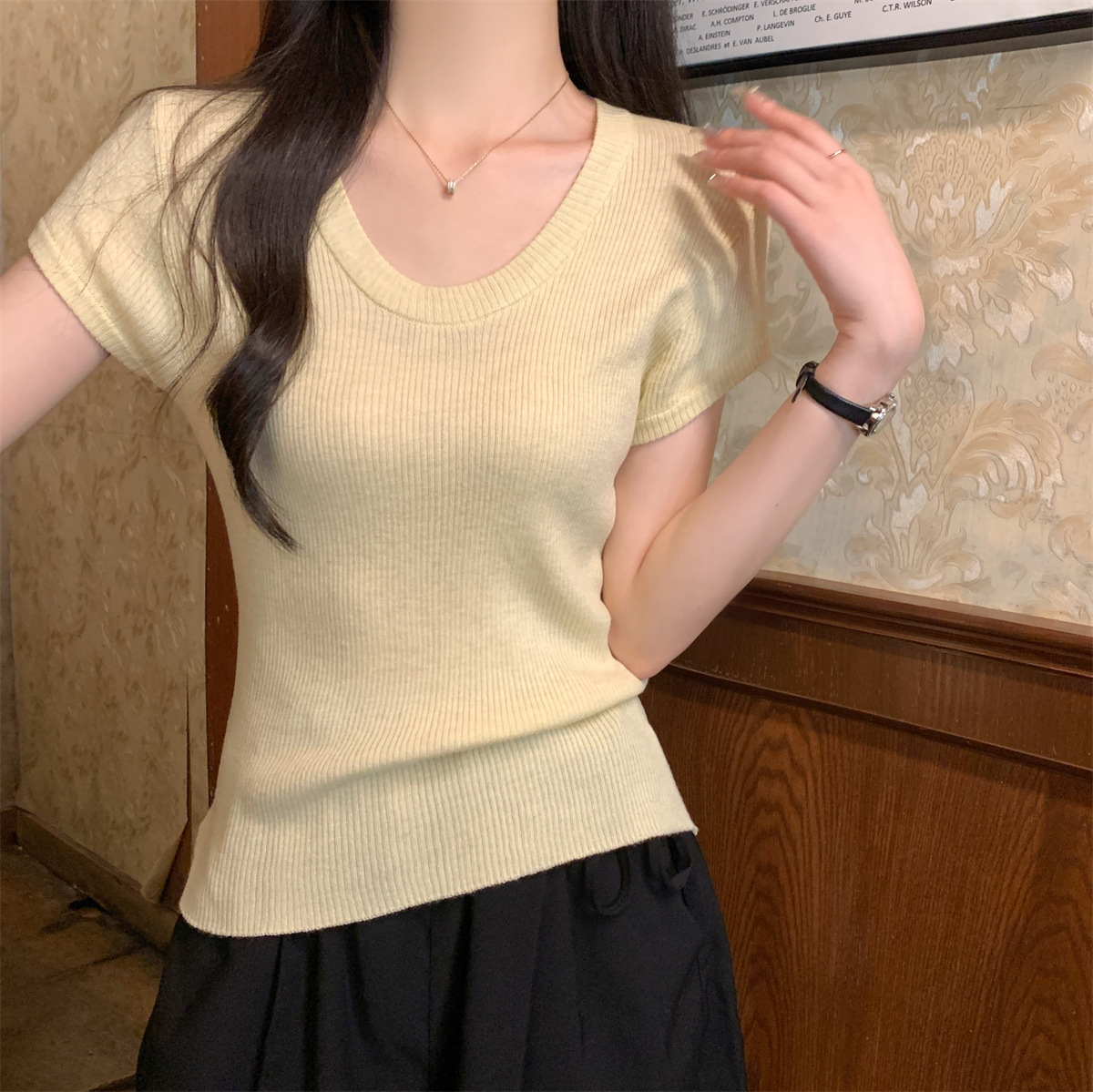 2026년 여름 한국 스타일 우아한 U넥 슬림핏 심플하고 다용도로 활용 가능한 6울 니트 반팔 티셔츠 여성 상의스토어 가기