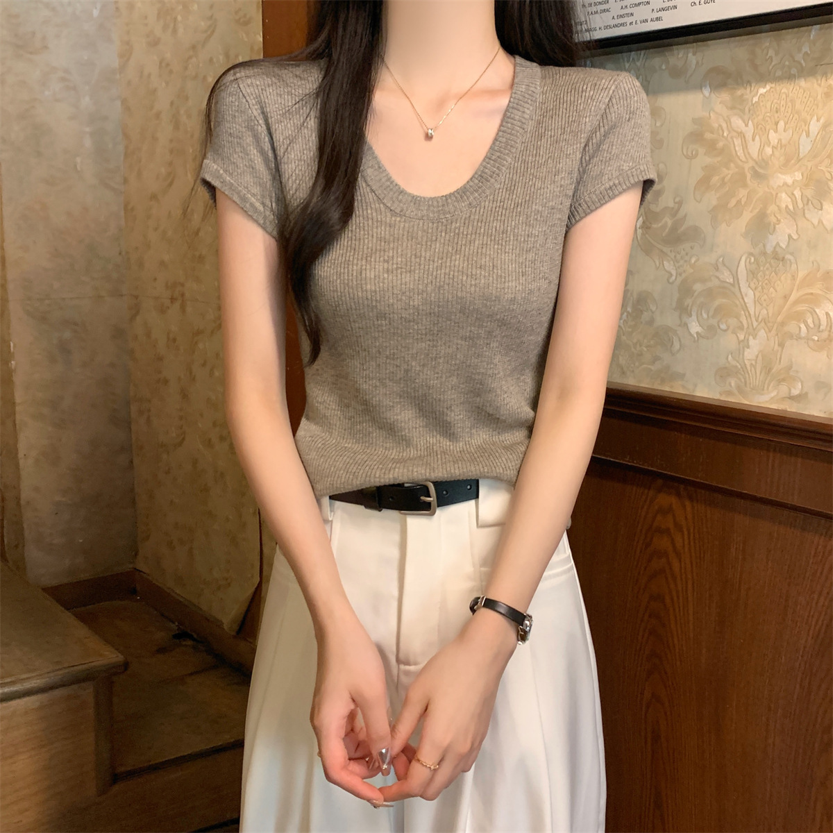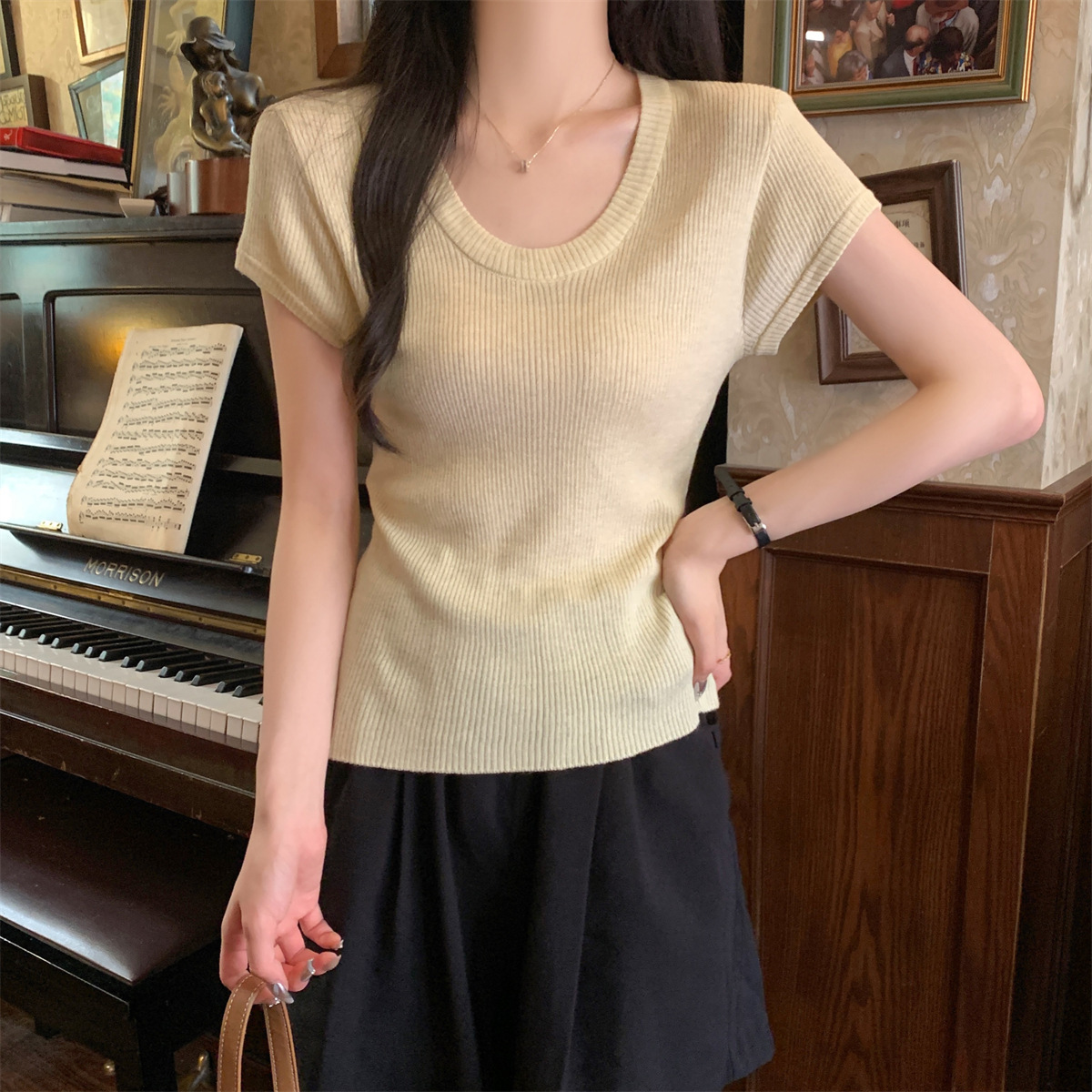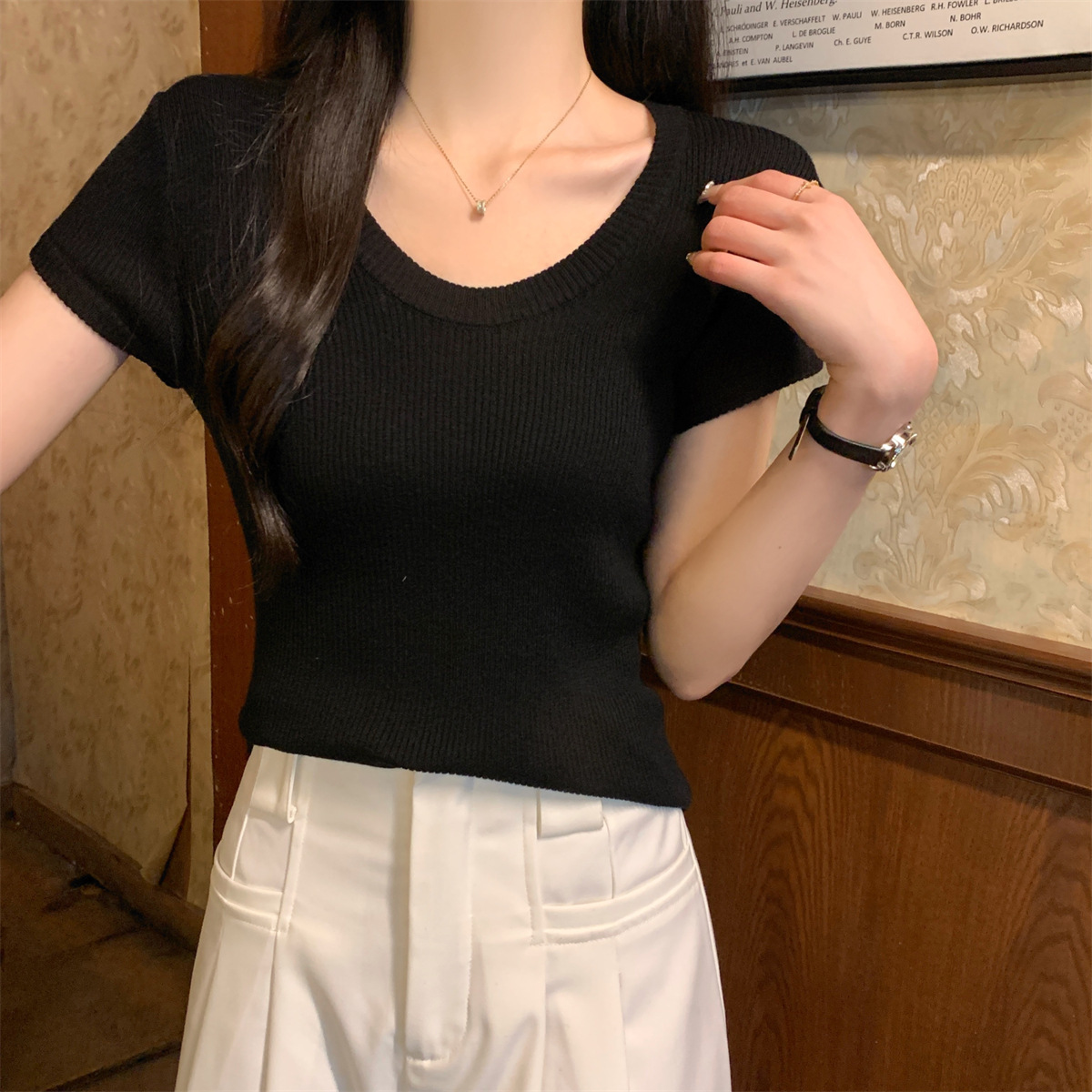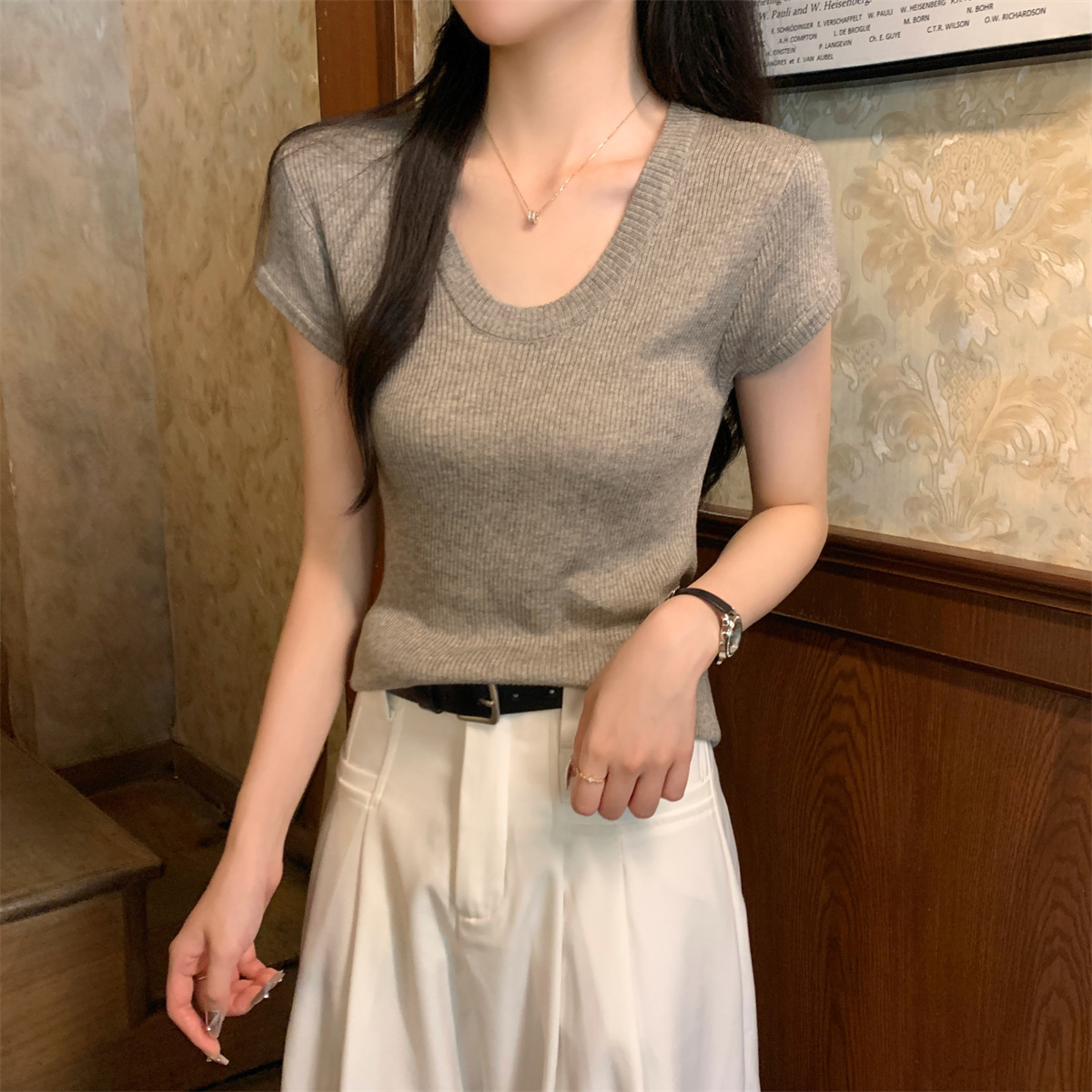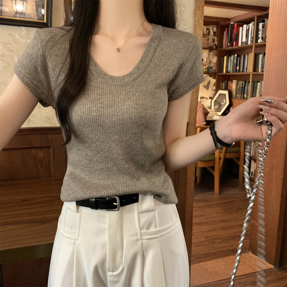 2026년 여름 한국 스타일 우아한 U넥 슬림핏 심플하고 다용도로 활용 가능한 6울 니트 반팔 티셔츠 여성 상의스토어 가기