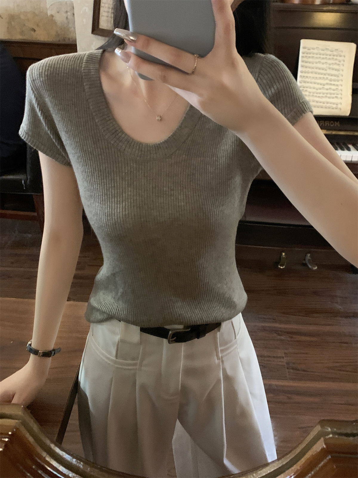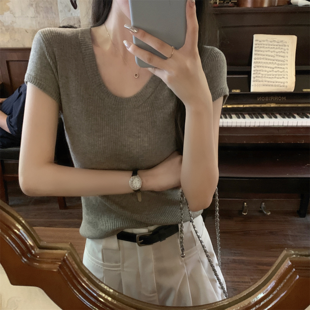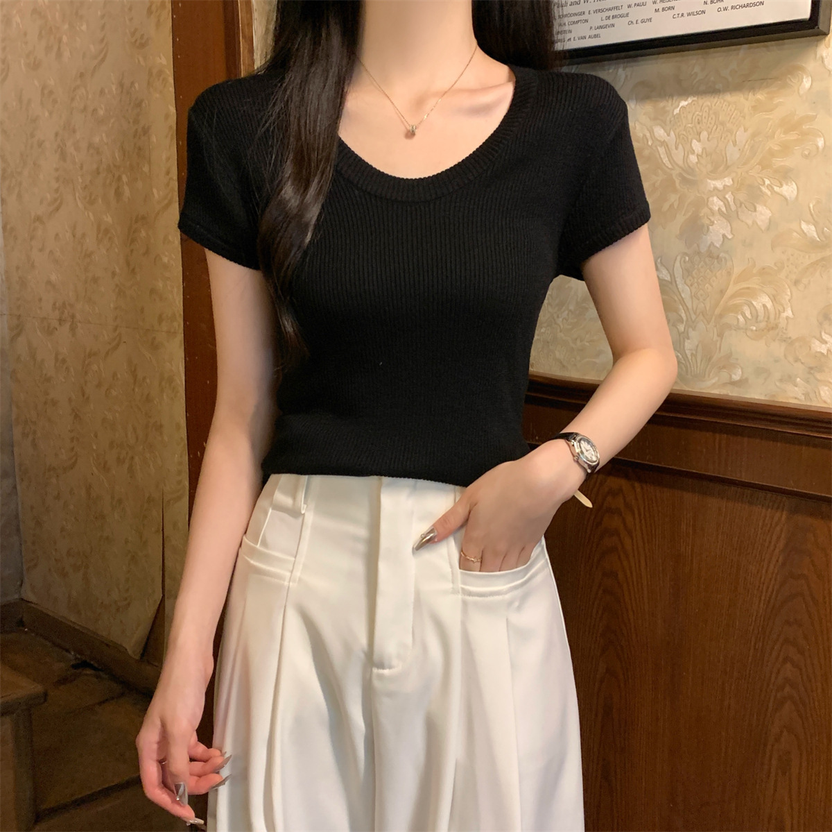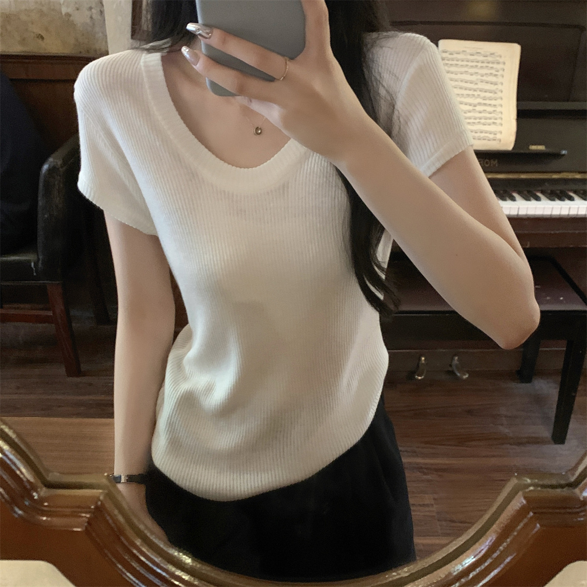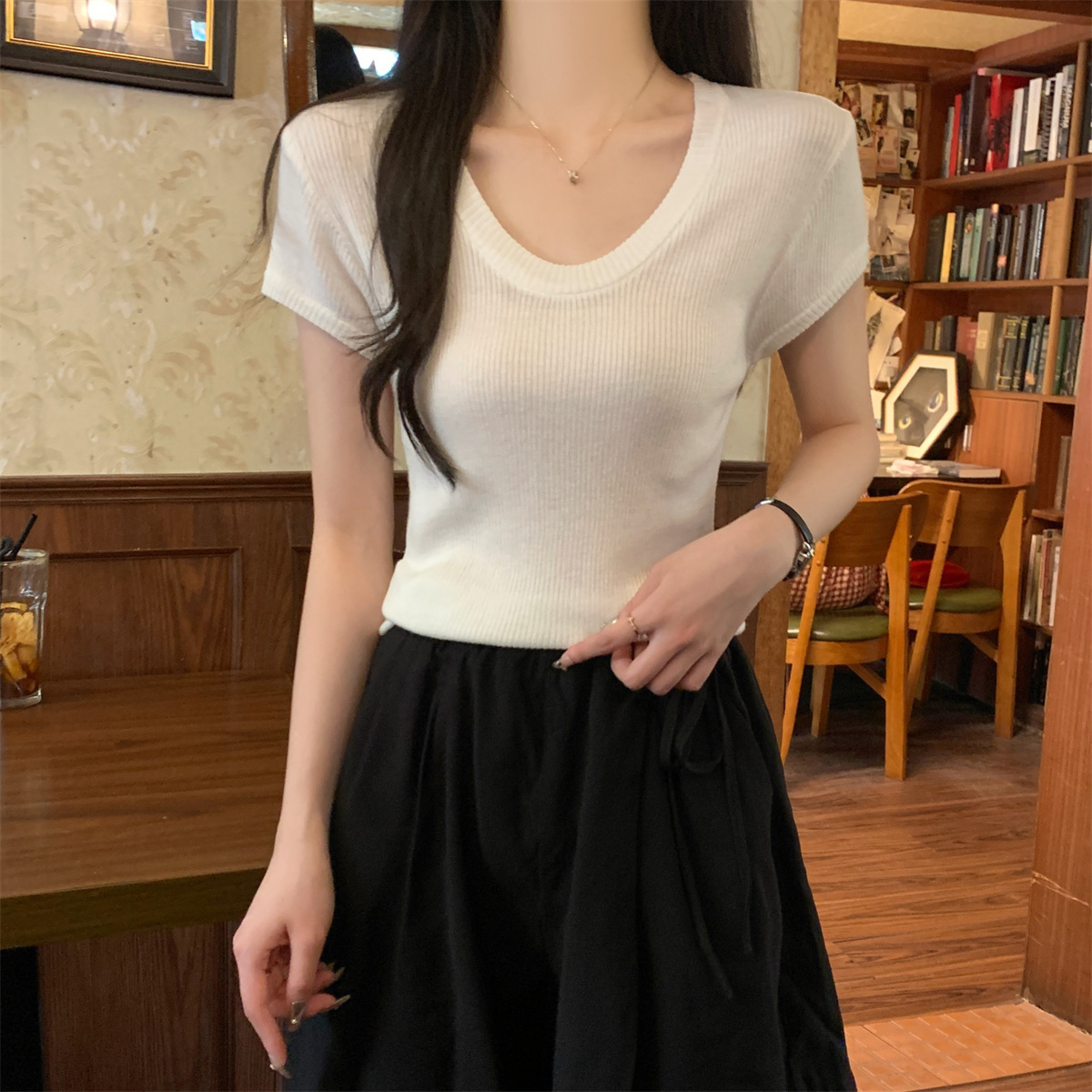 2026년 여름 한국 스타일 우아한 U넥 슬림핏 심플하고 다용도로 활용 가능한 6울 니트 반팔 티셔츠 여성 상의스토어 가기