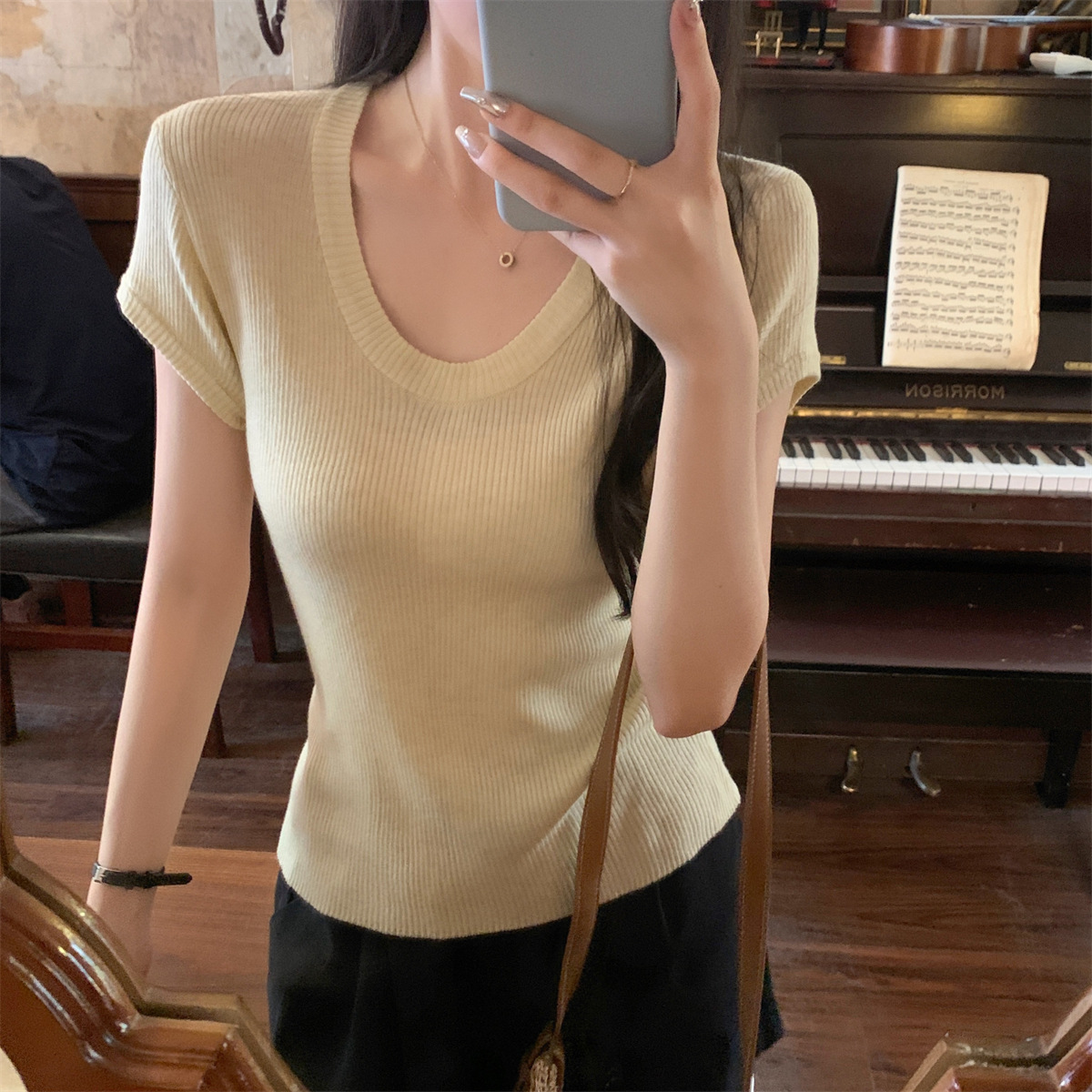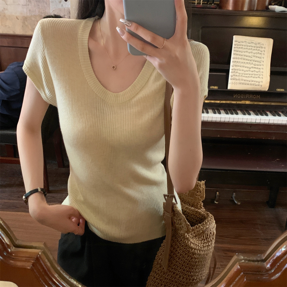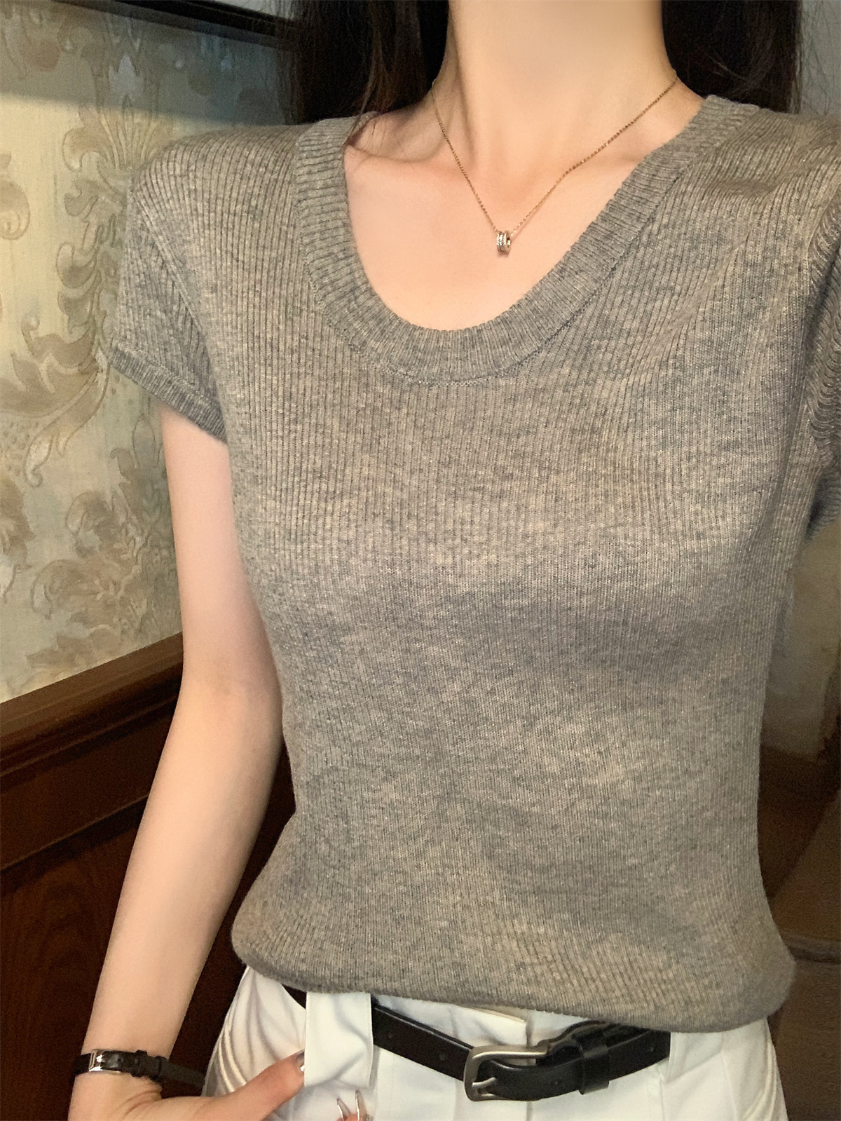 2026년 여름 한국 스타일 우아한 U넥 슬림핏 심플하고 다용도로 활용 가능한 6울 니트 반팔 티셔츠 여성 상의