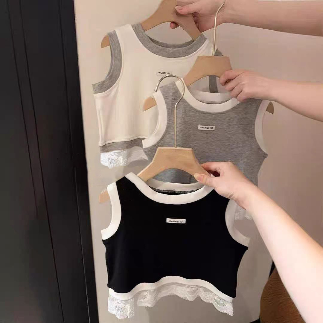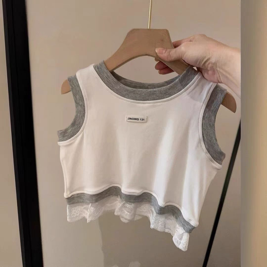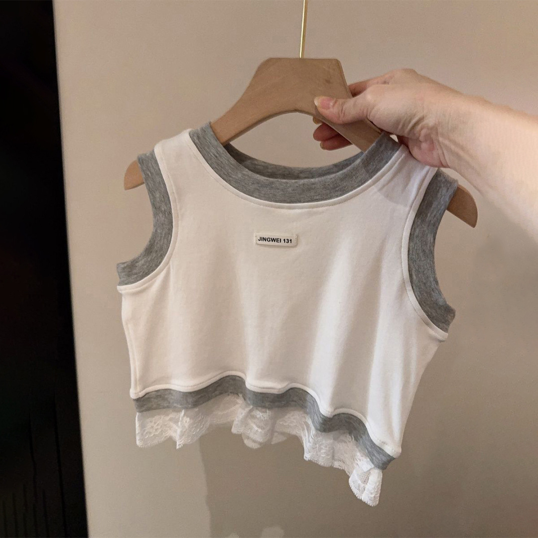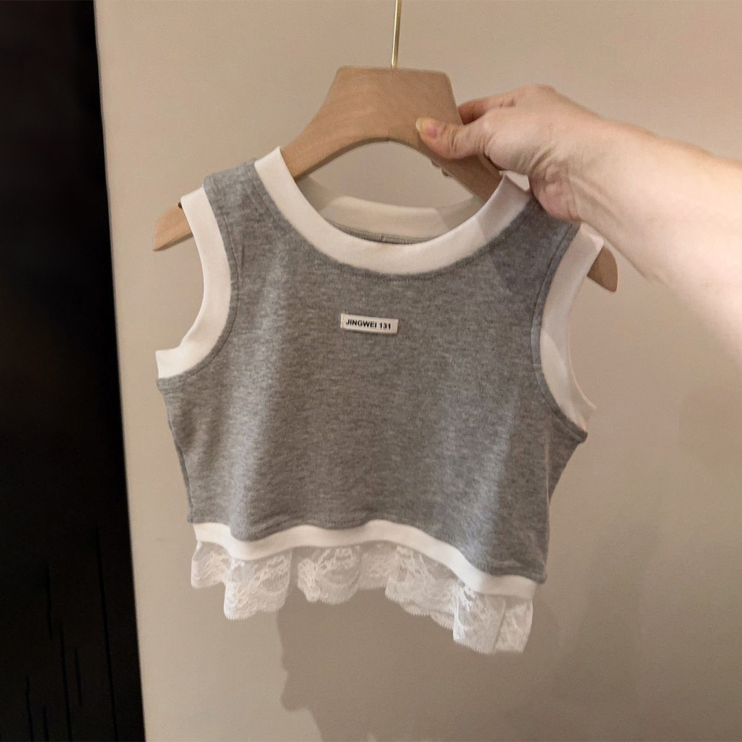 한국 아동복 소녀 레이스 조끼 여름 유행 바느질 캐주얼 어린이 민소매 서양식 스포츠 스타일 타이드 티셔츠