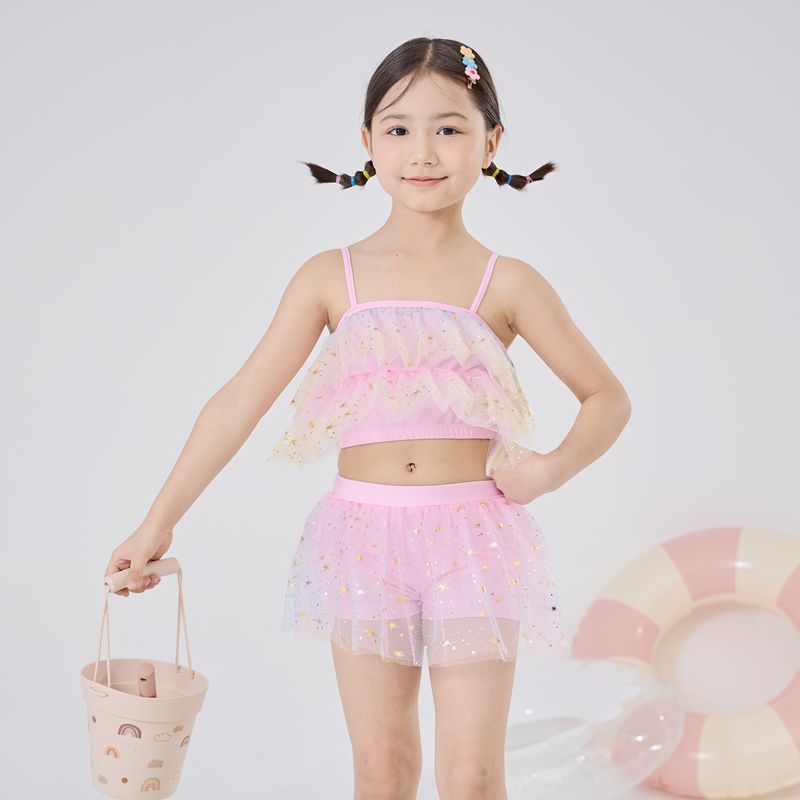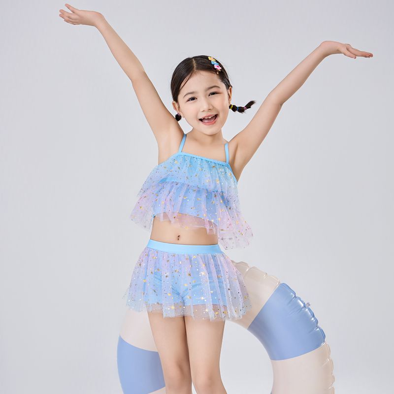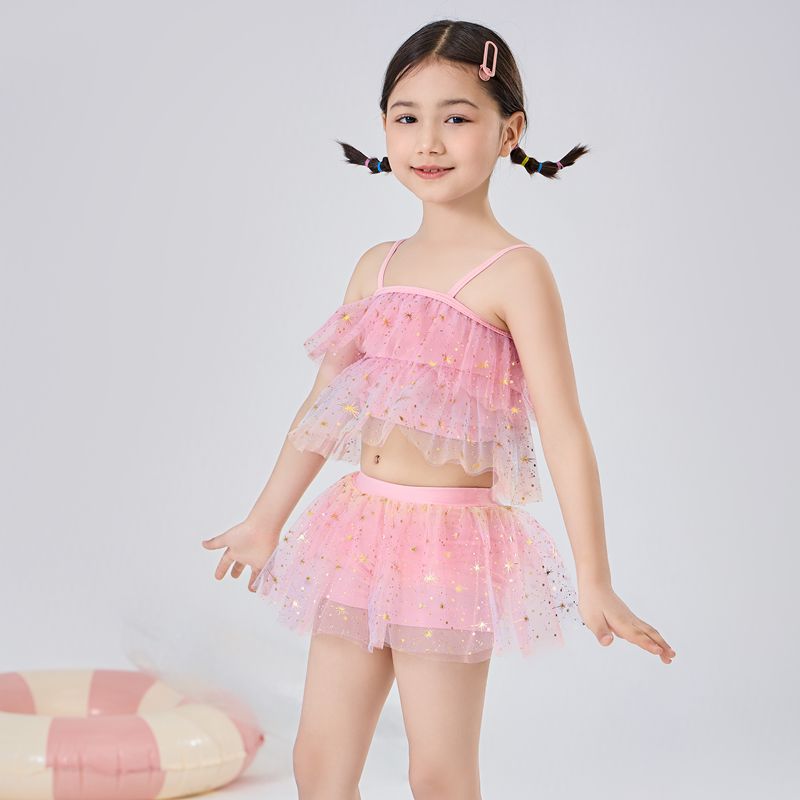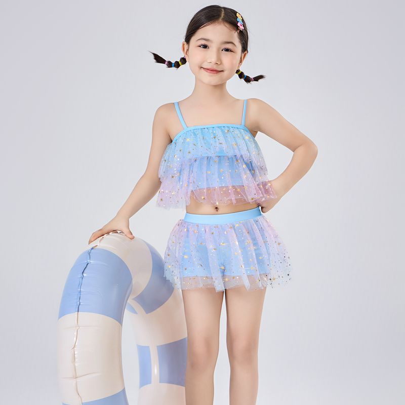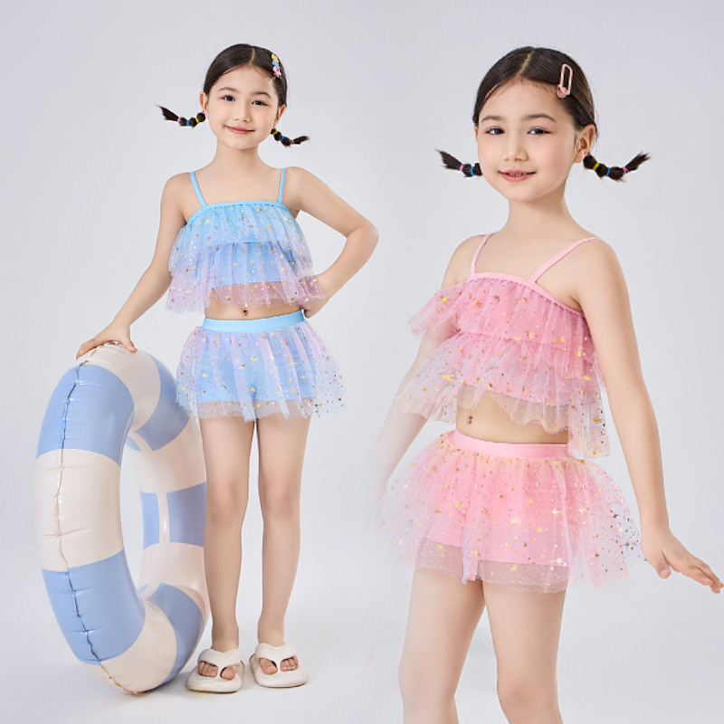 여름 어린이 새로운 비키니 분할 수영복 메쉬 스커트 투피스 세트 큰 어린이 수영복 휴가 공장스토어 가기