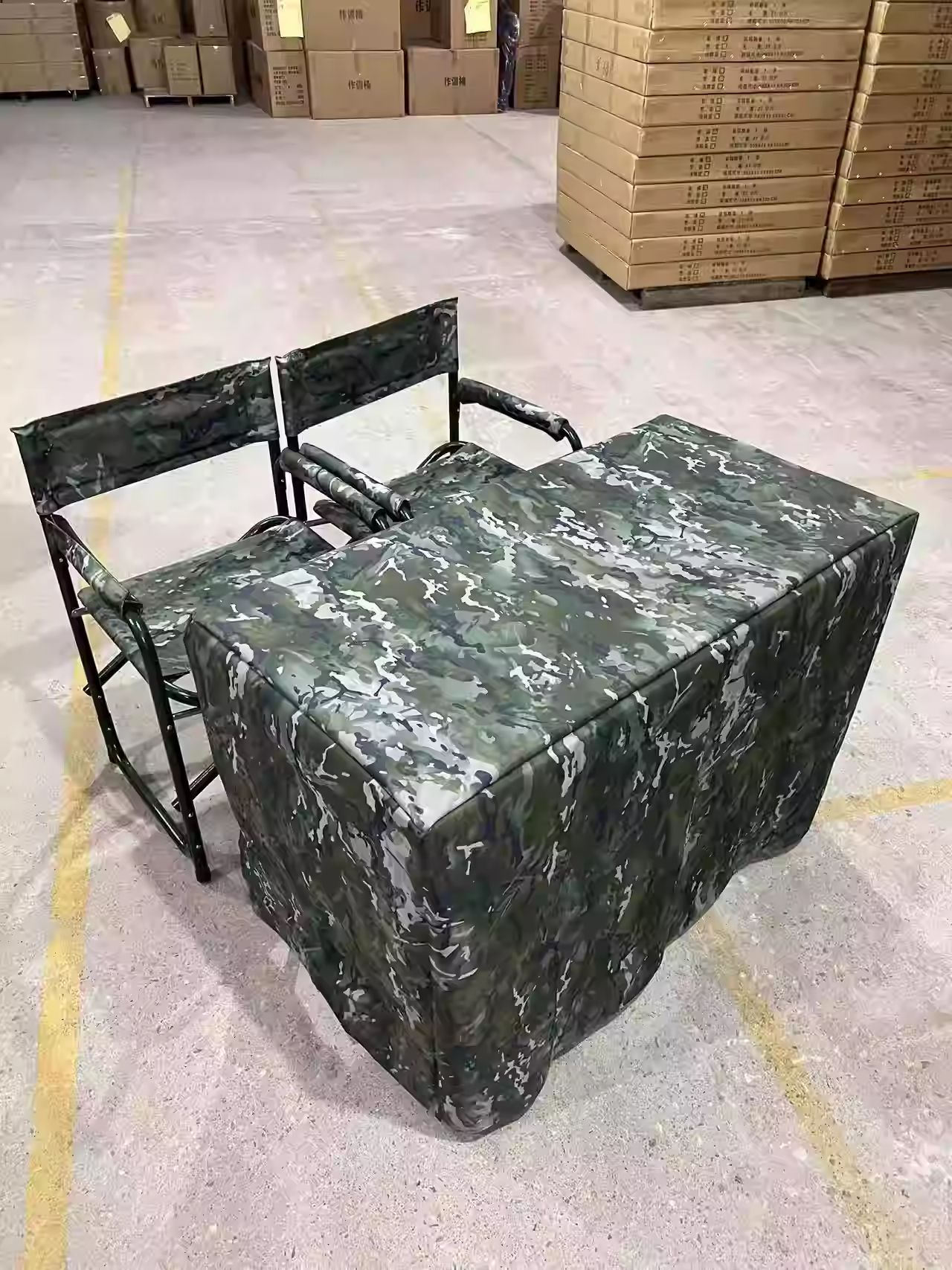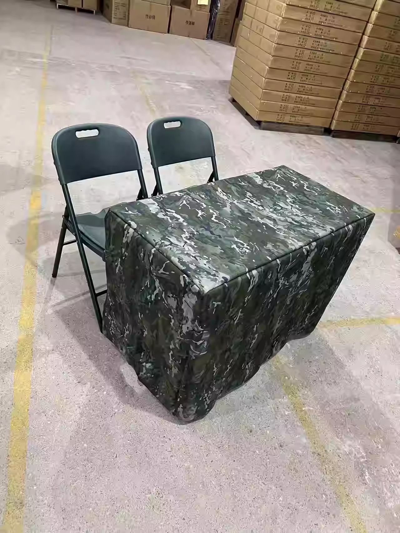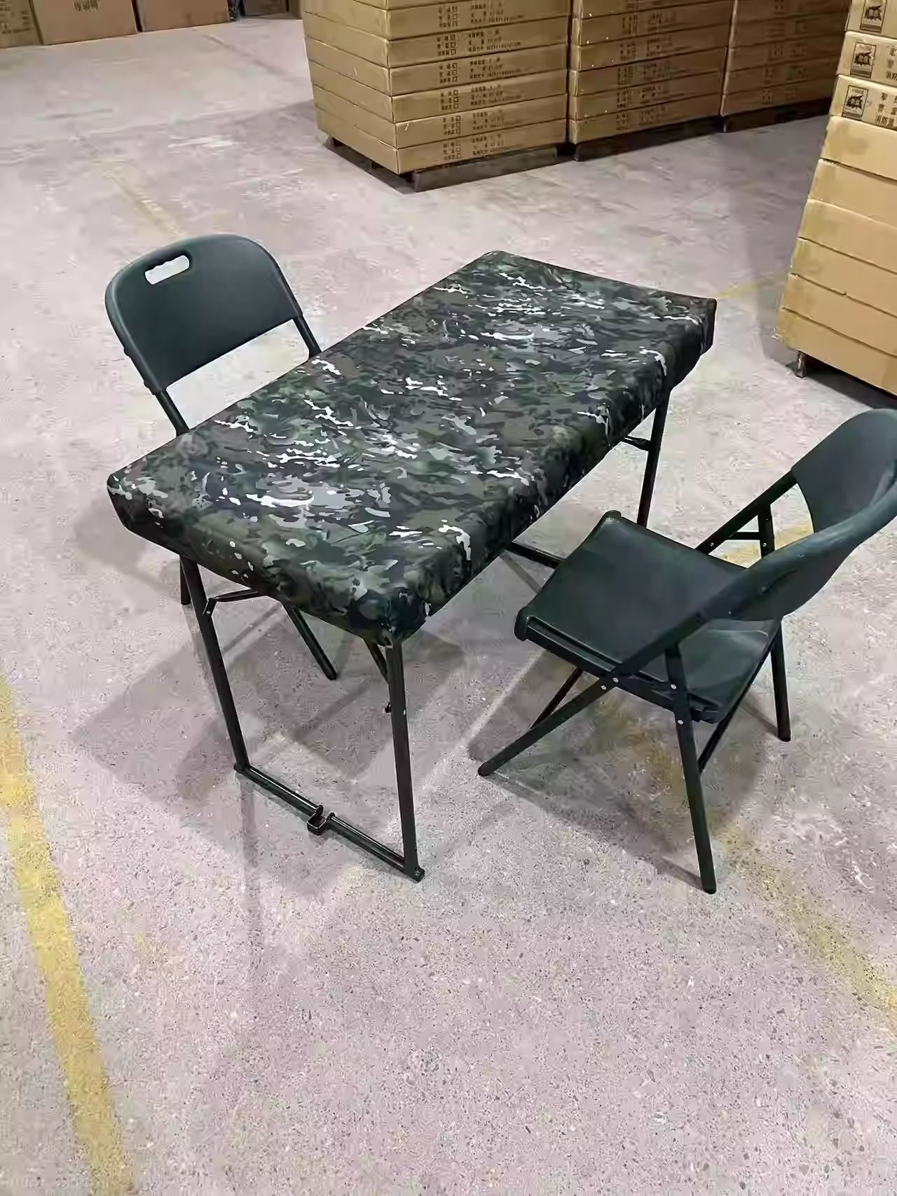 • 테이블 1개와 의자 2개(밀리터리 그린 블로우 성형 의자 + 싱글 테이블 + 반포장 식탁보)