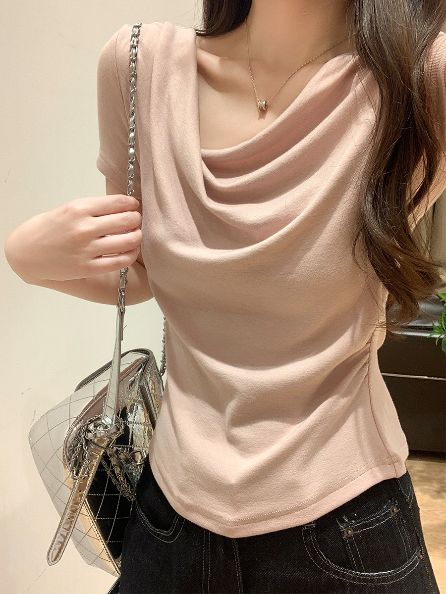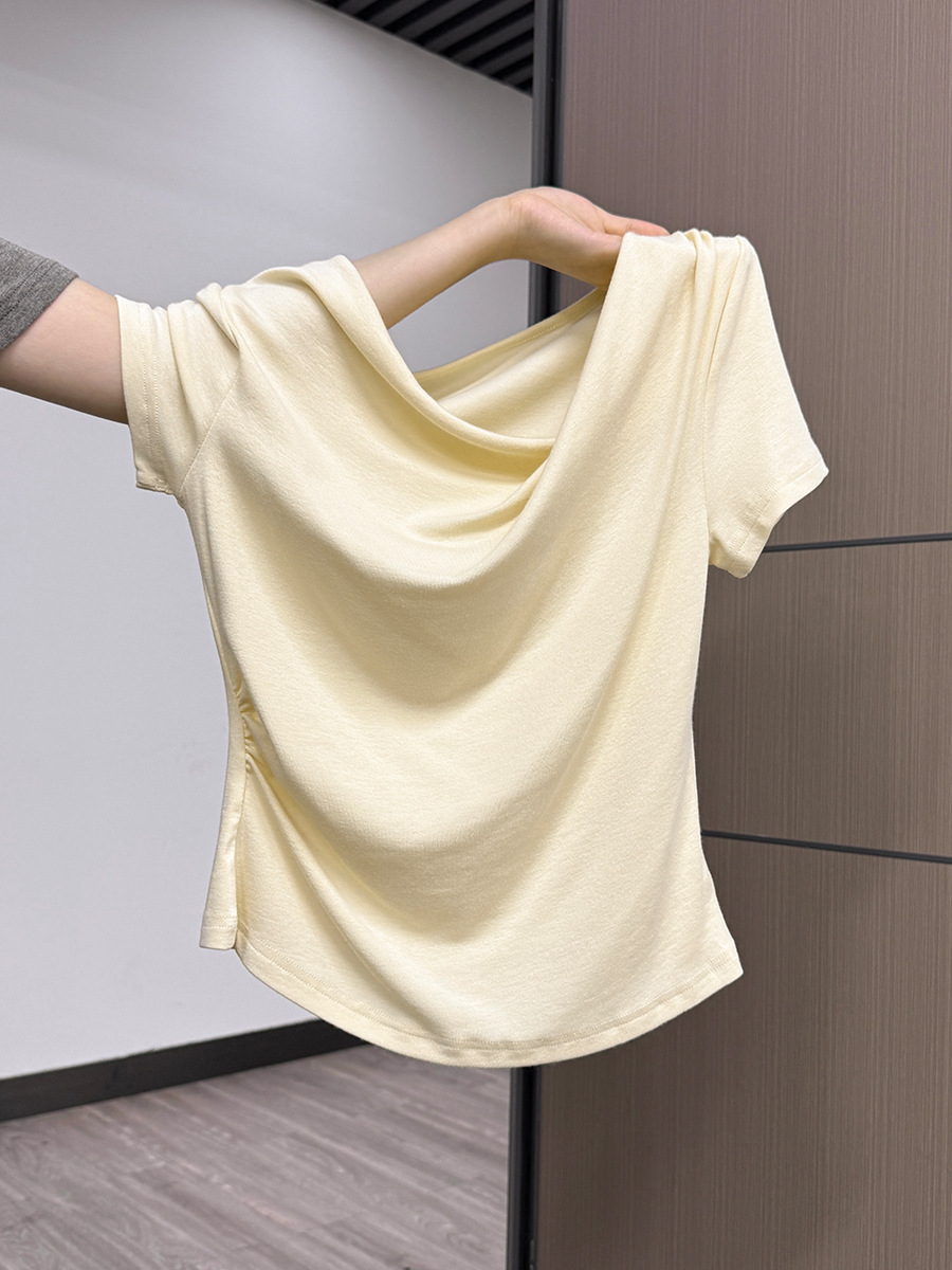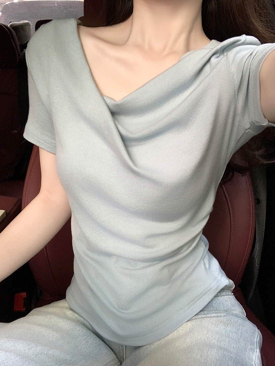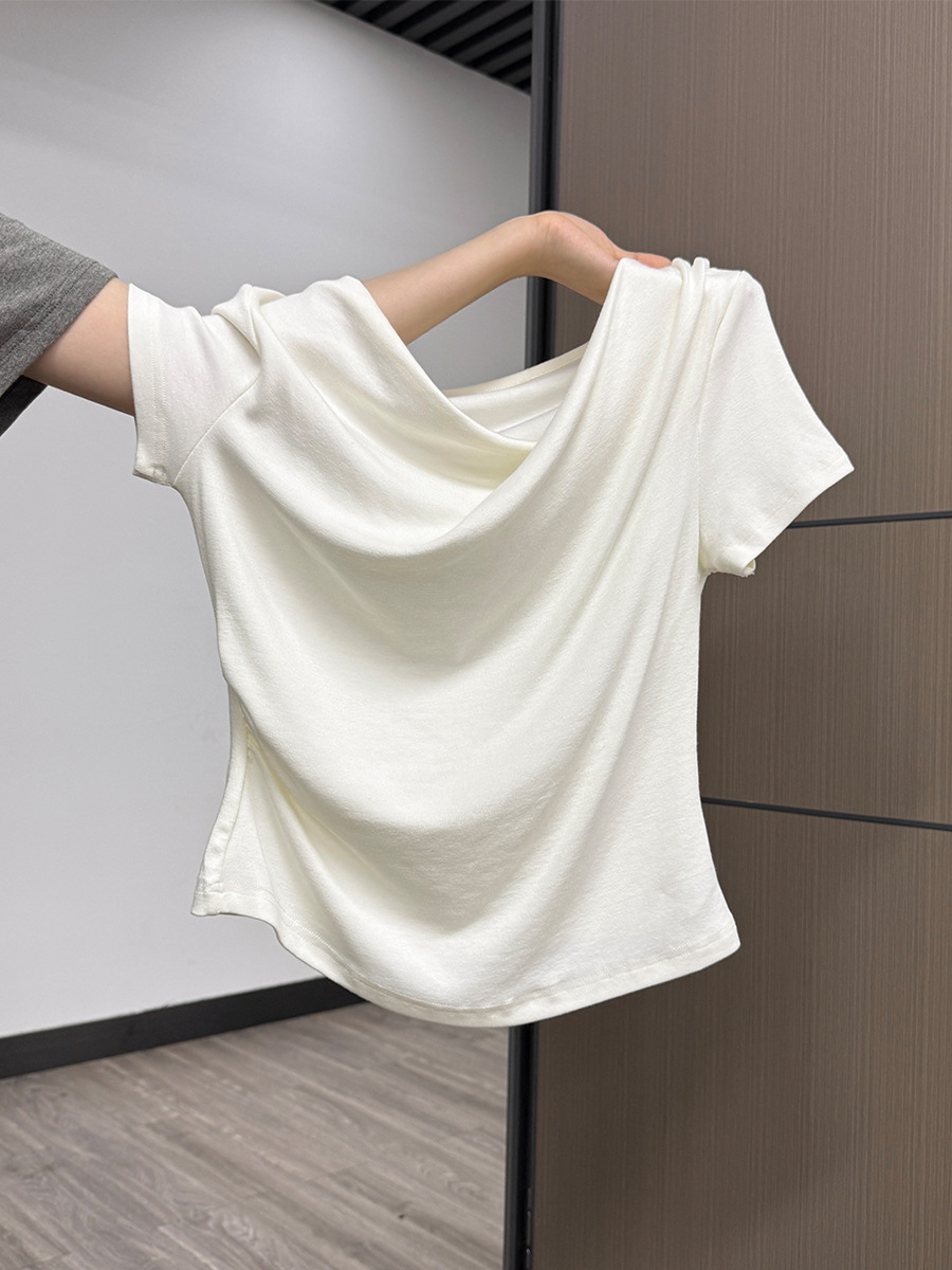 부드러운 주름과 불규칙한 원라인 네크라인이 돋보이는 여성용 오프숄더 반팔 티셔츠, 2026년 여름 신상, 독특한 디자인의 탑