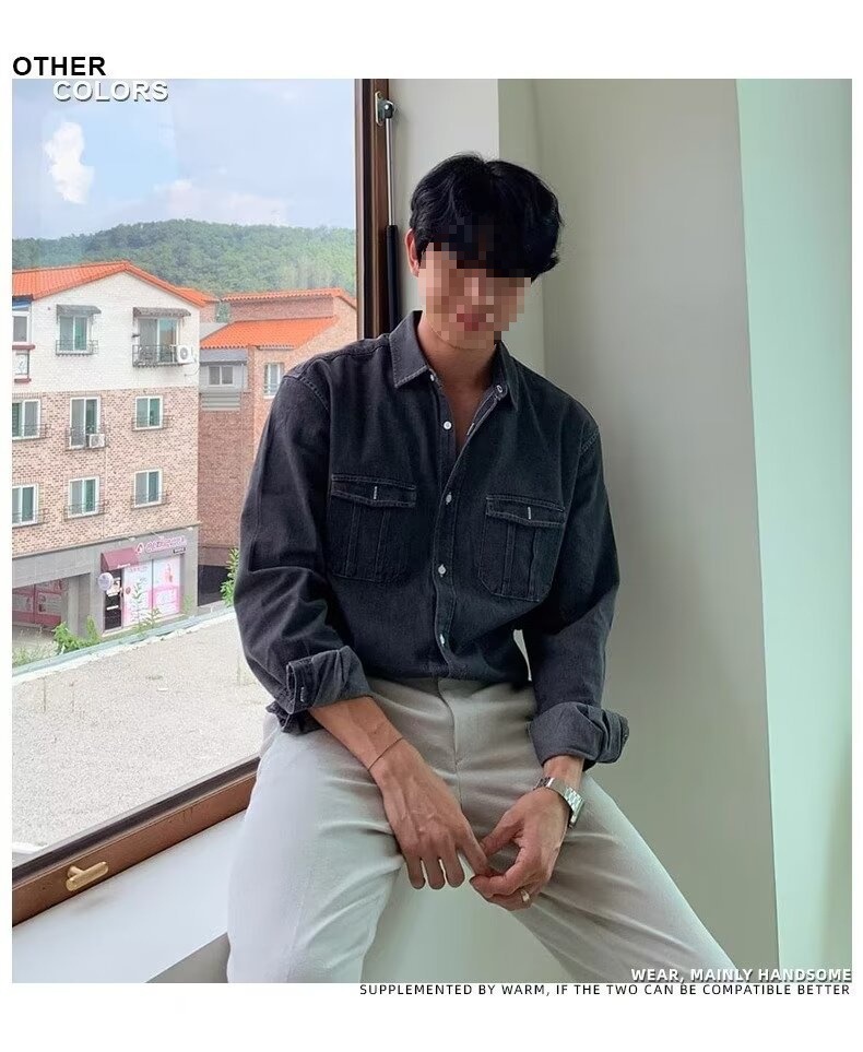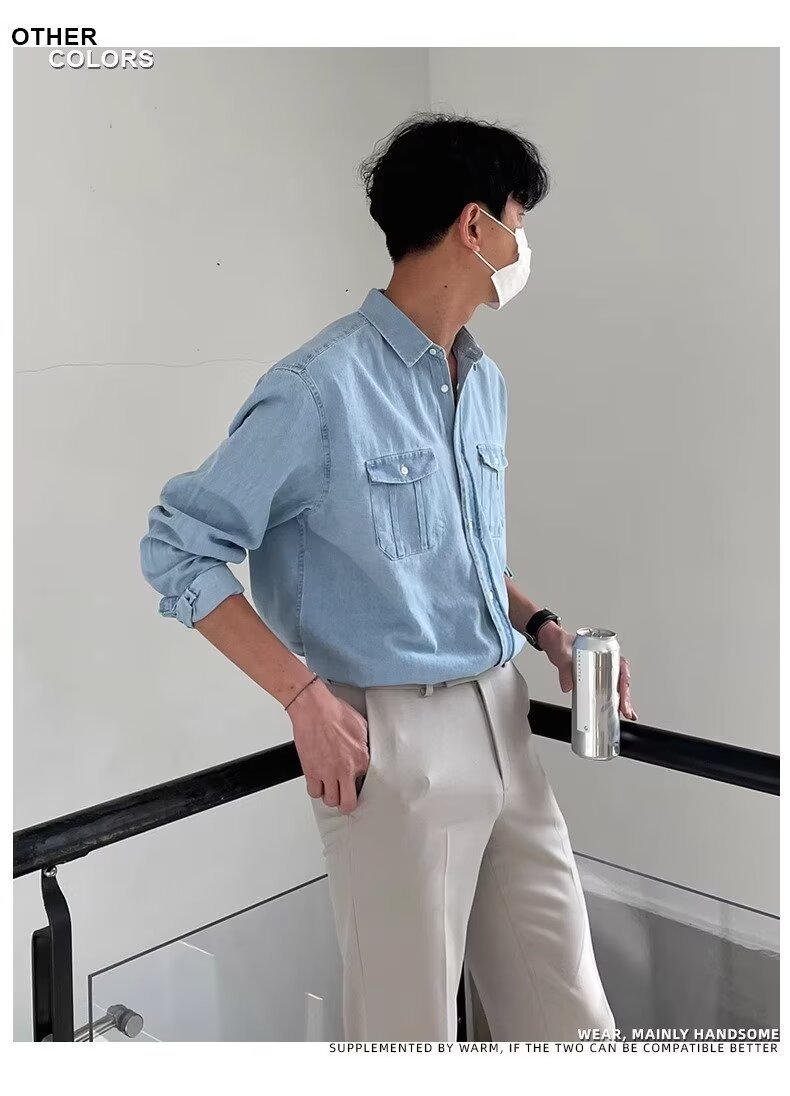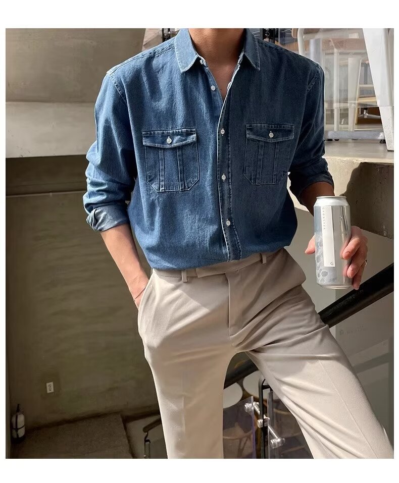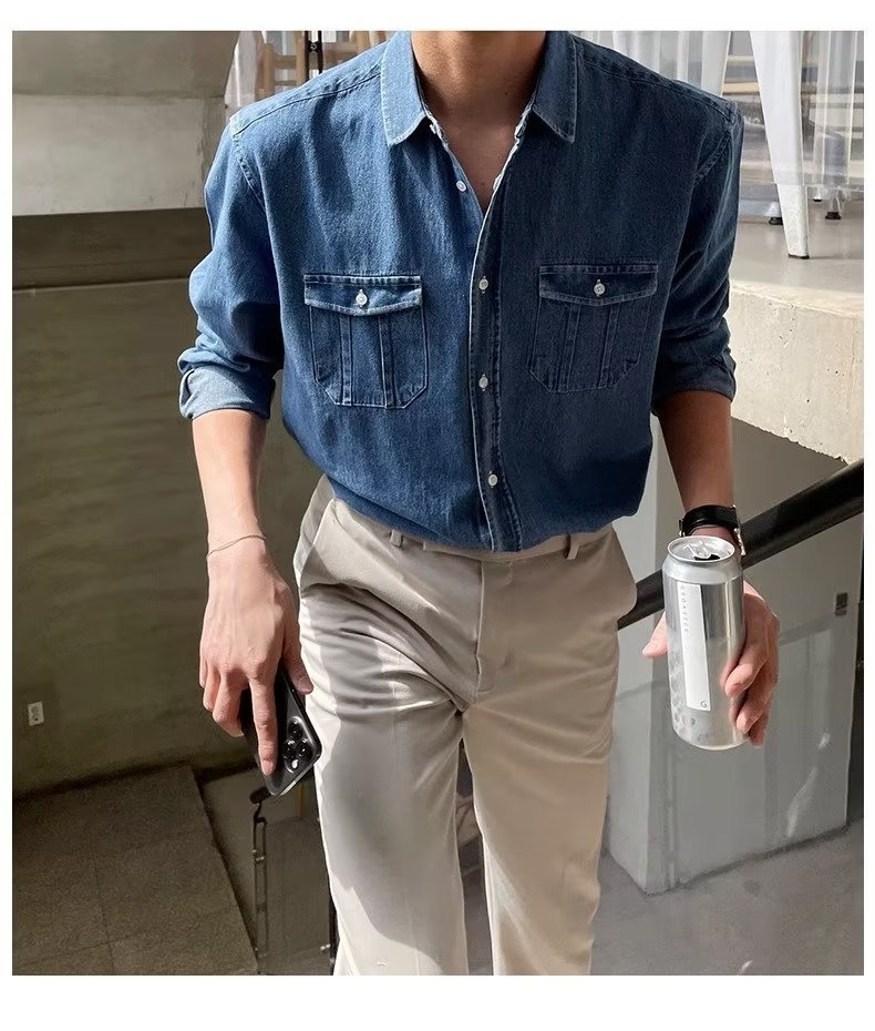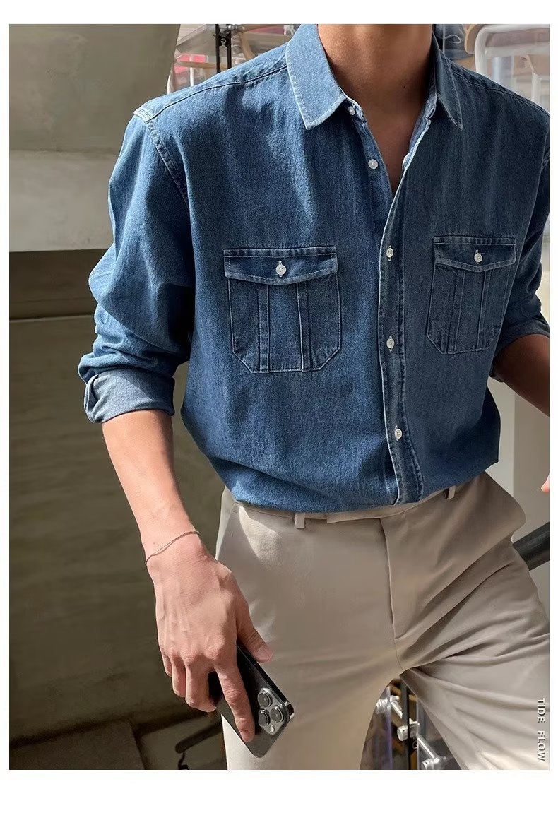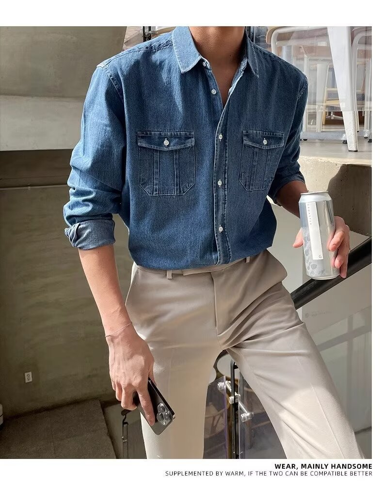 2024 년 씻은 올드 데님 셔츠 남자 봄 한국식 루즈 하이 엔드 긴팔 작품 셔츠 올매치스토어 가기
