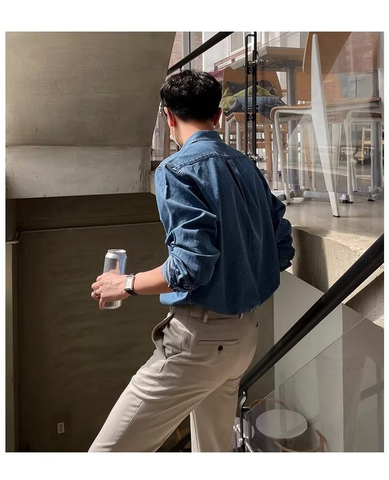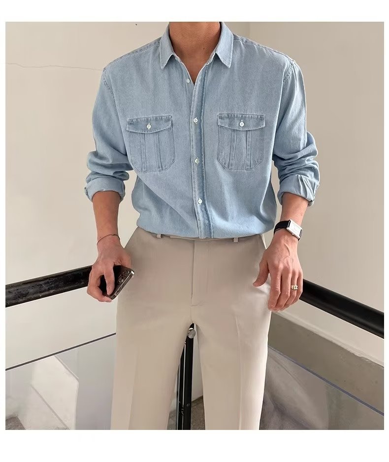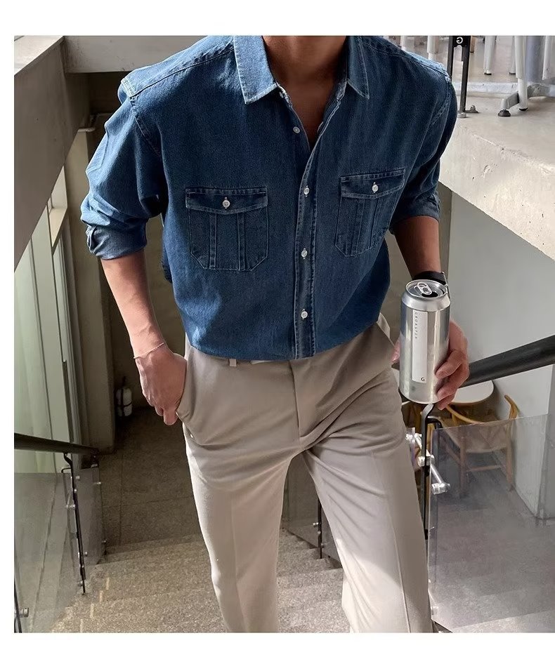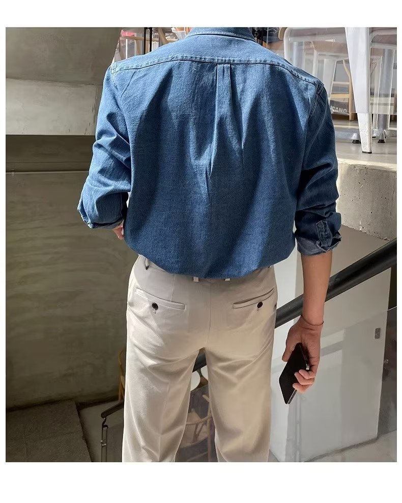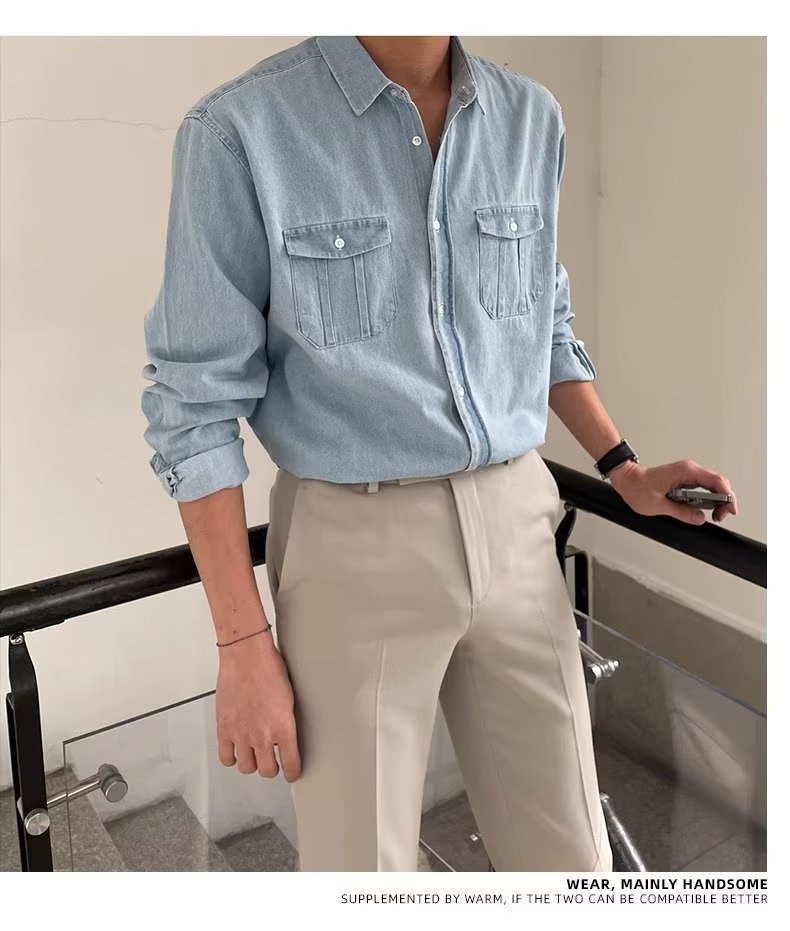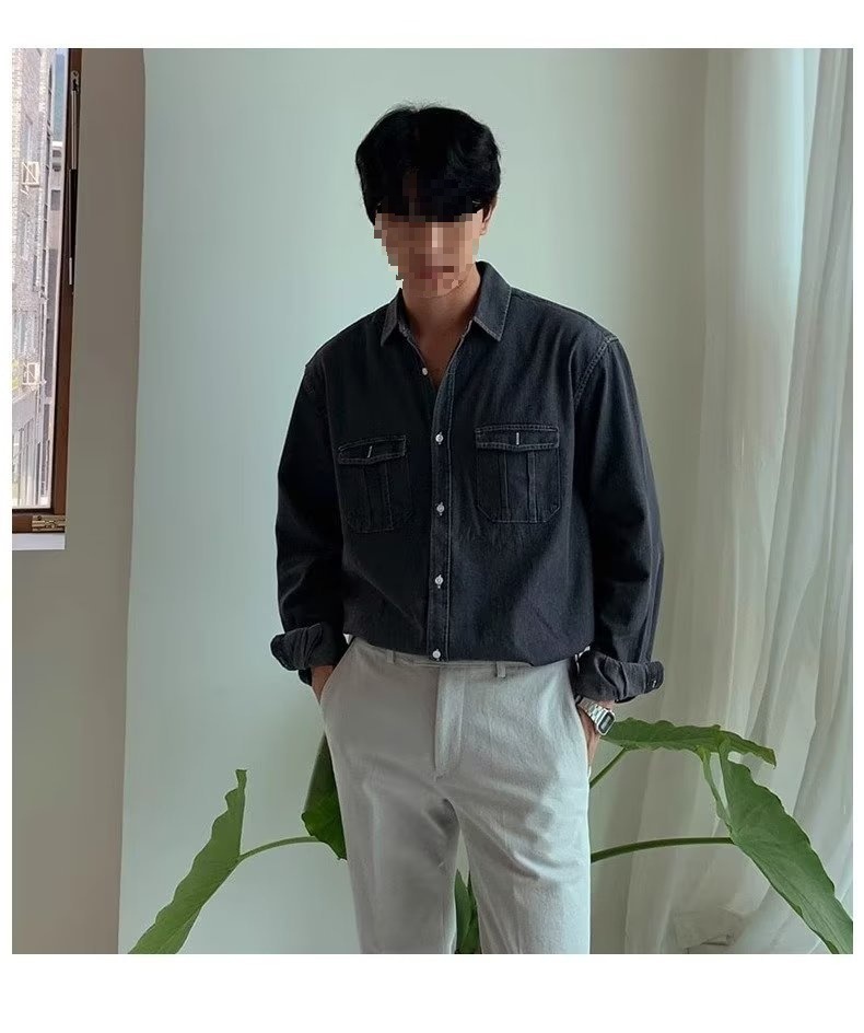 2024 년 씻은 올드 데님 셔츠 남자 봄 한국식 루즈 하이 엔드 긴팔 작품 셔츠 올매치스토어 가기