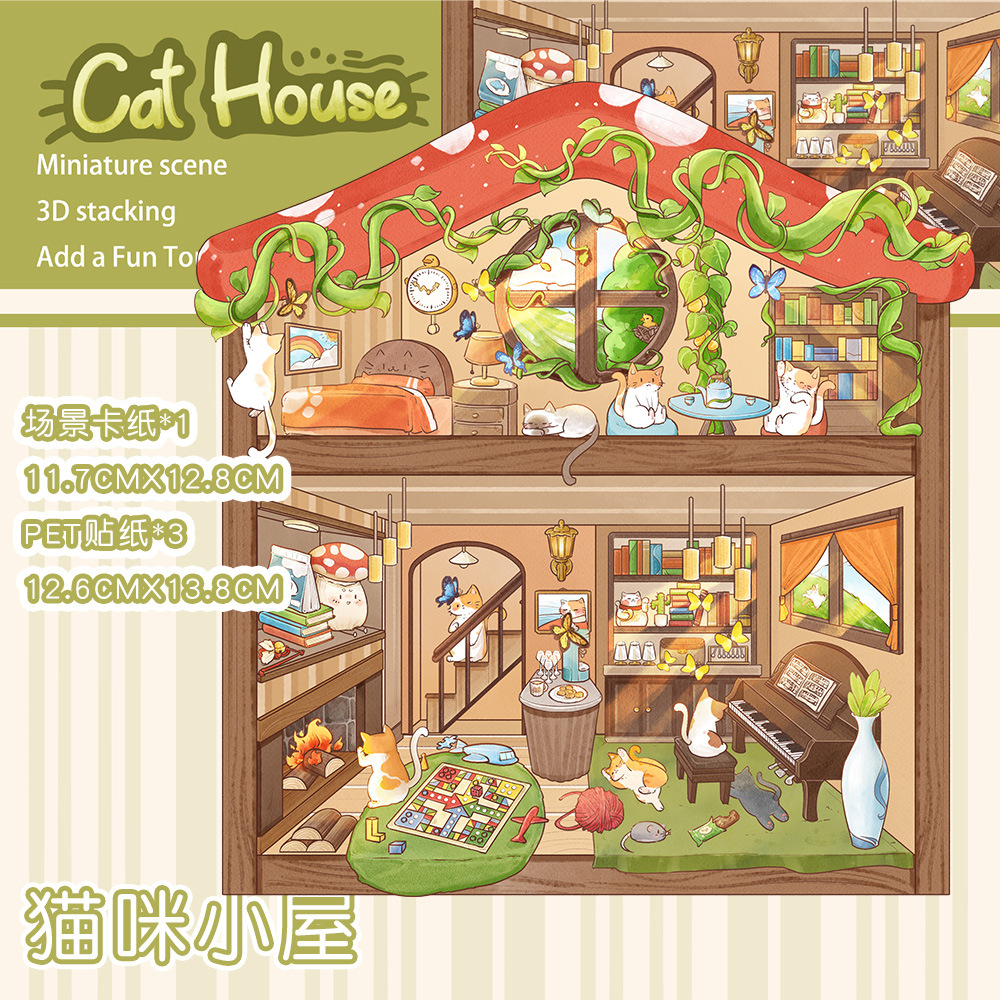같은 새로운 미니어처 장면 조경 스티커와 함께 작은 빨간 책 컷 프리 조경 장면 3D 스택 3 차원 오두막 손 계정