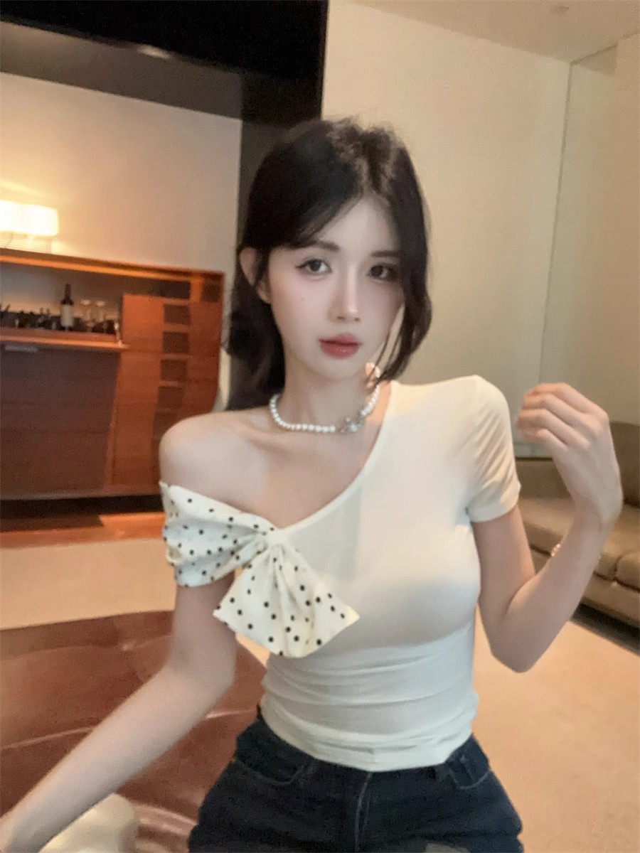 섹시한 프랑스 스타일 순수한 욕망 어깨 활 슬림 핏 반팔 티셔츠 여성용 여름 스파이스 걸스 슬림 핏 베이스 쇼트 탑 여성용 T스토어 가기