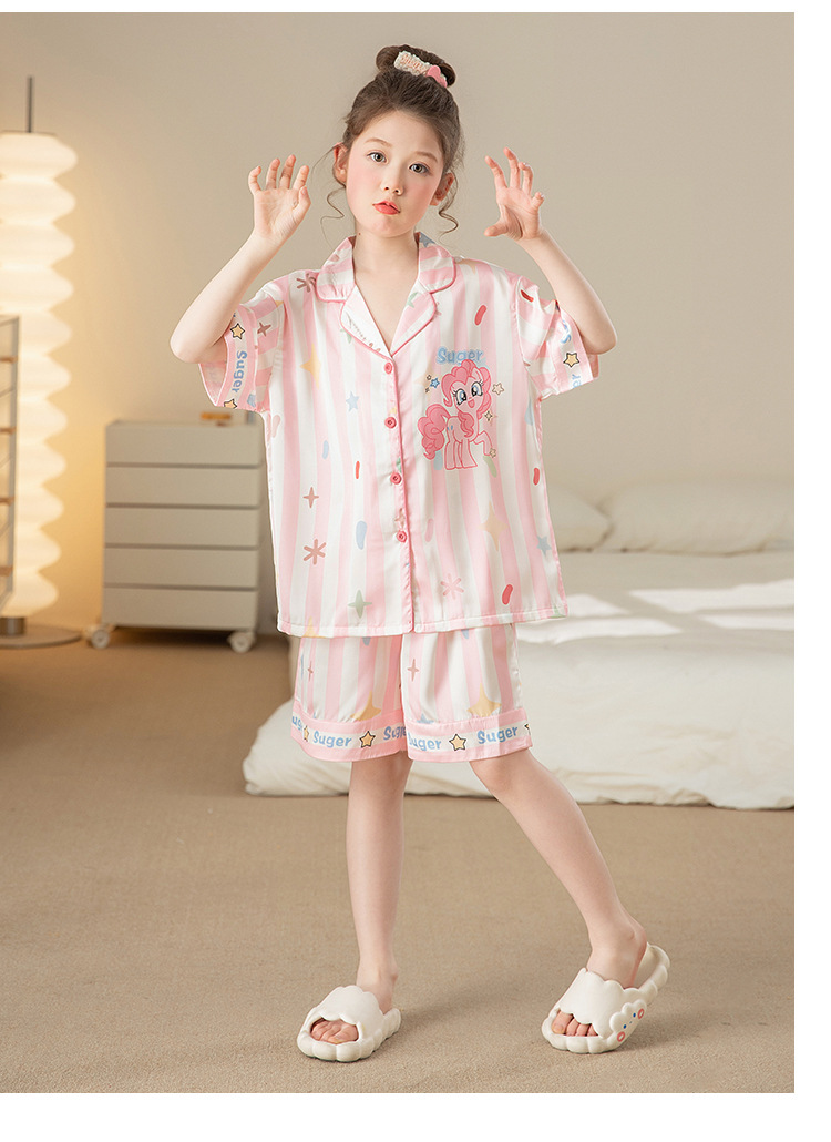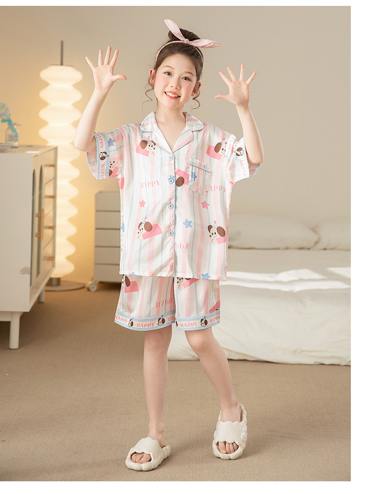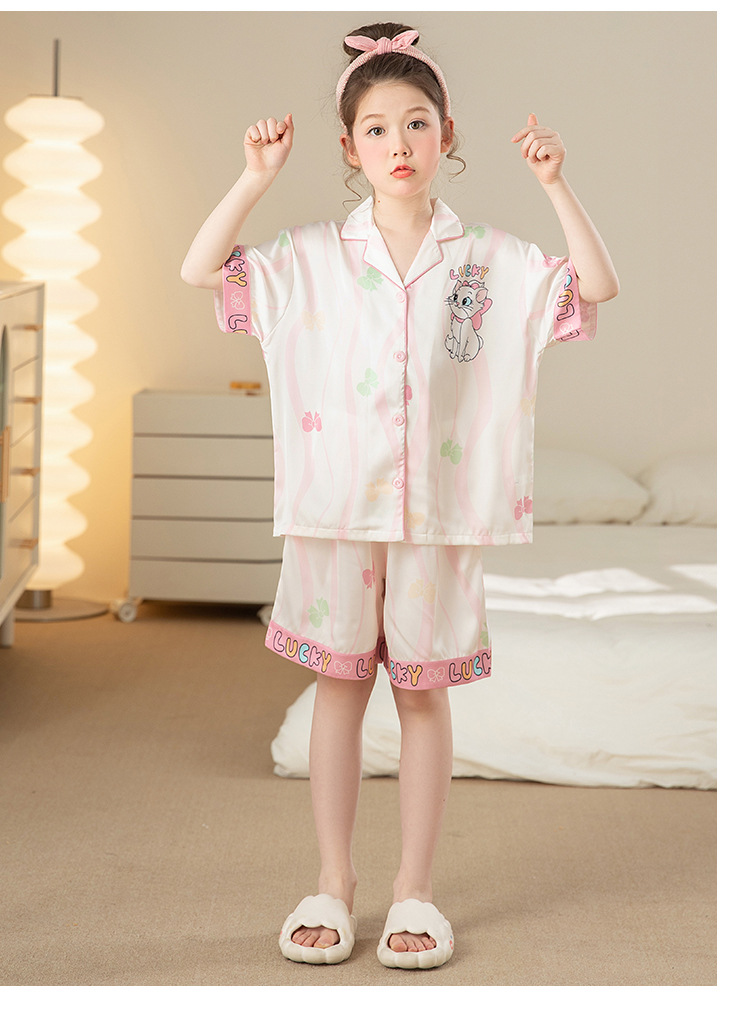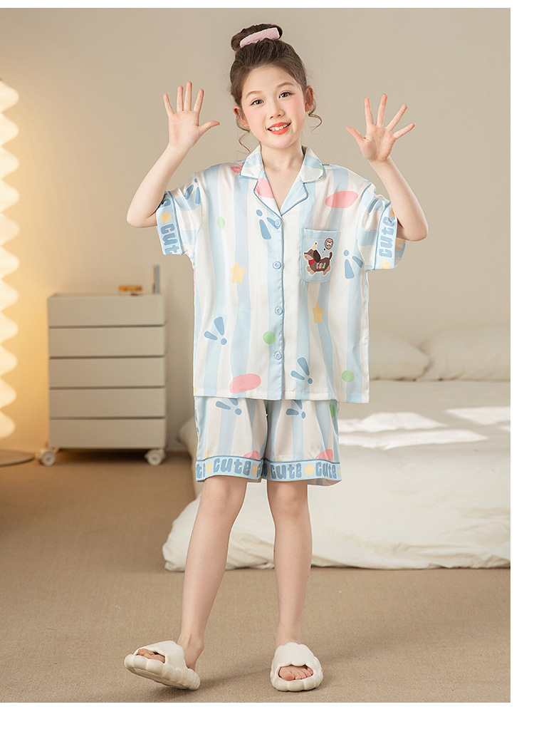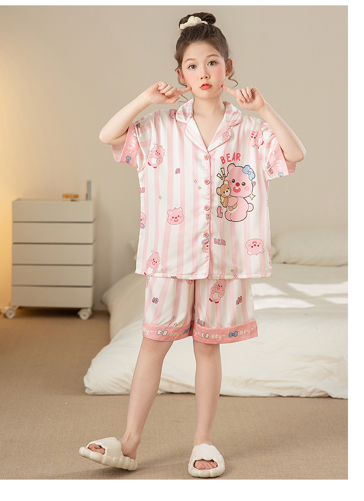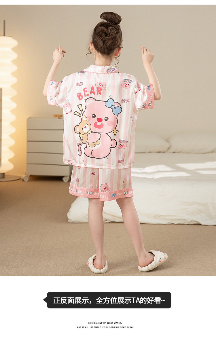 어린이 아이스 실크 잠옷 소녀 여름 반팔 얇은 귀여운 실크 홈 옷 아기 중 큰 어린이 소녀 세트