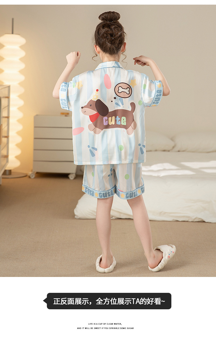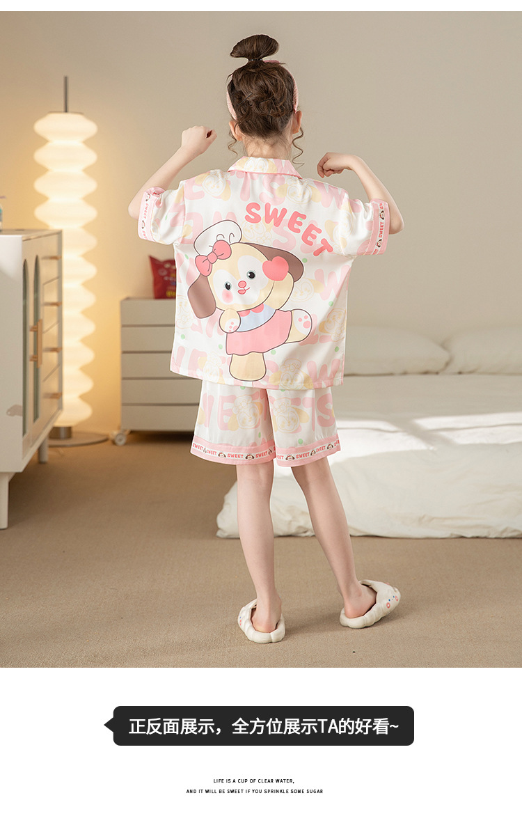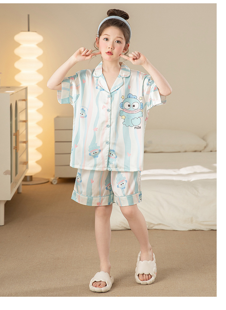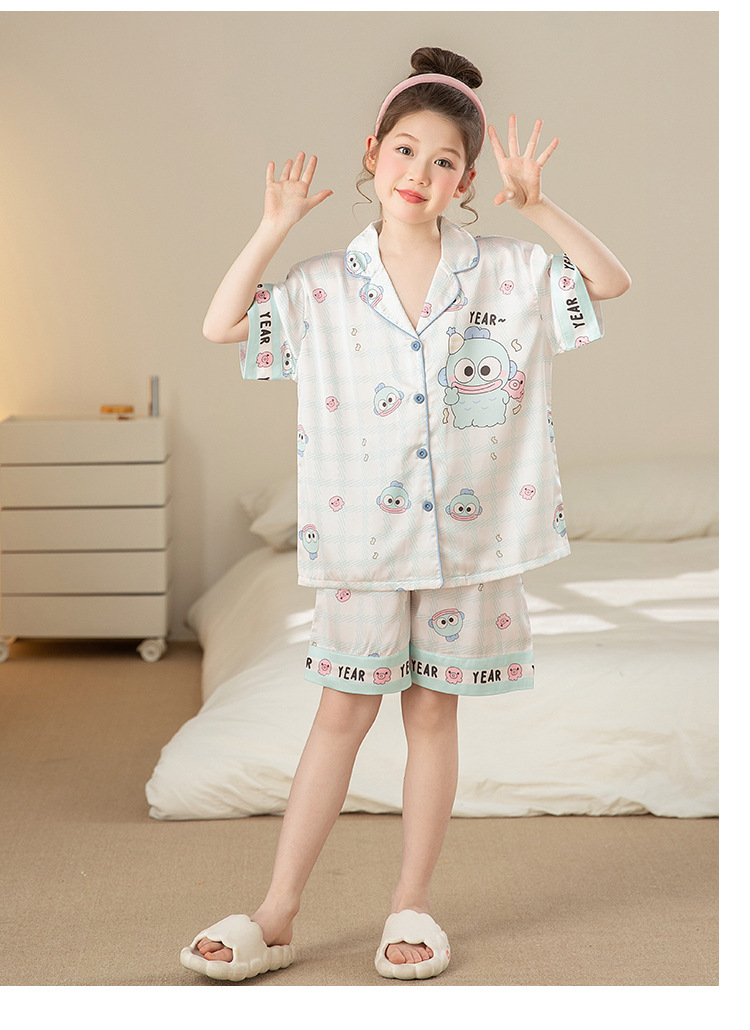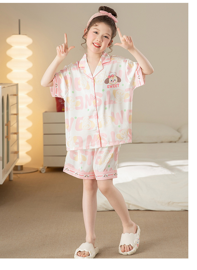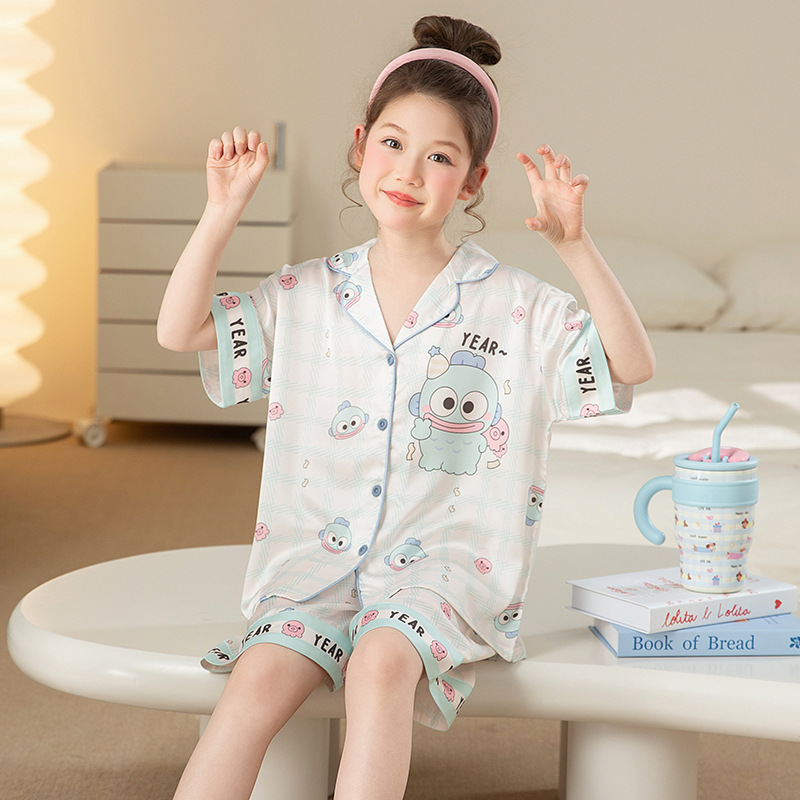 어린이 아이스 실크 잠옷 소녀 여름 반팔 얇은 귀여운 실크 홈 옷 아기 중 큰 어린이 소녀 세트