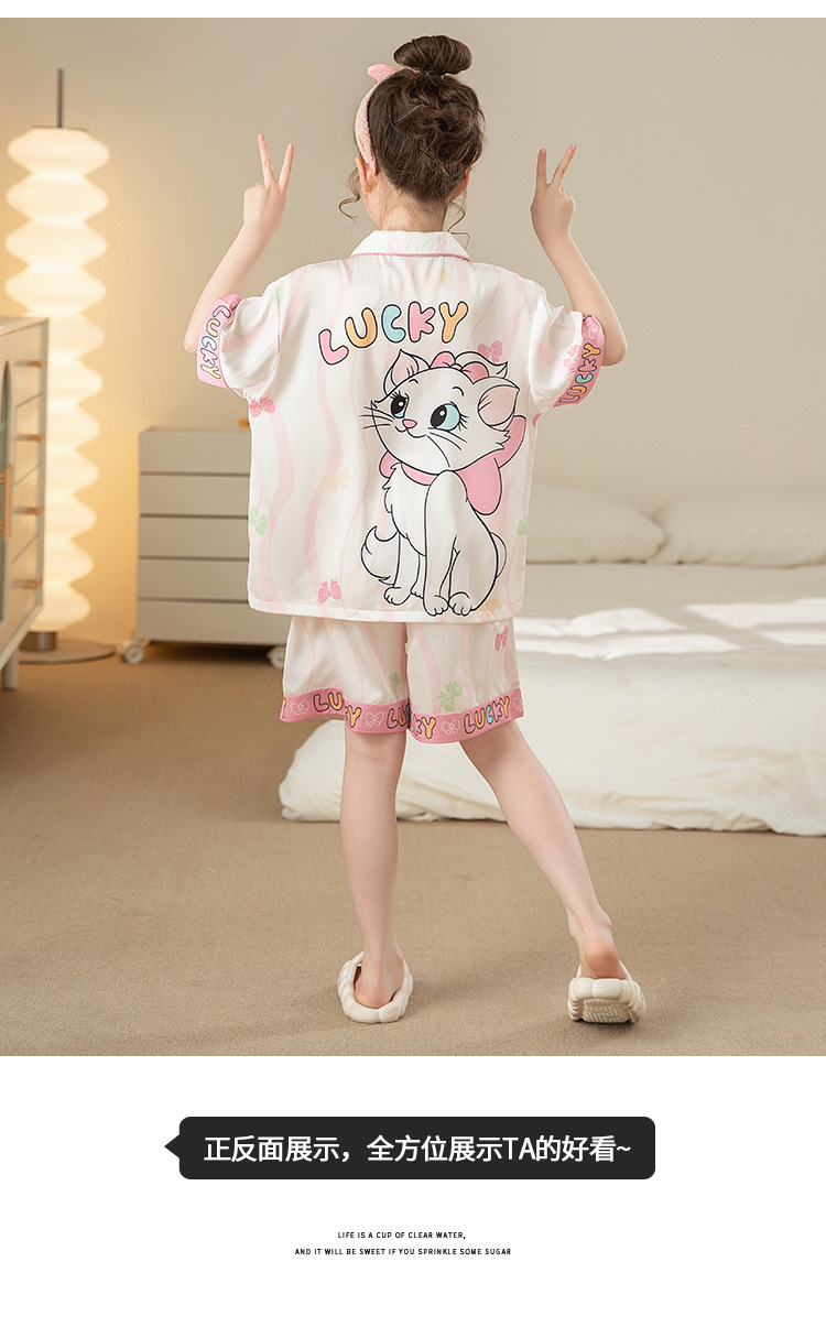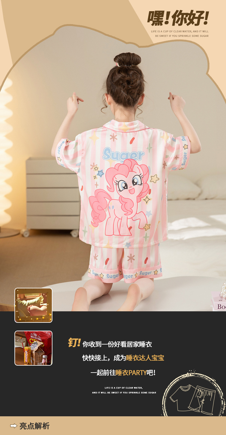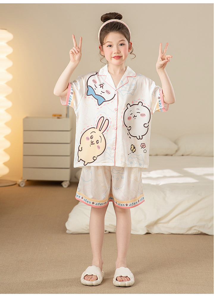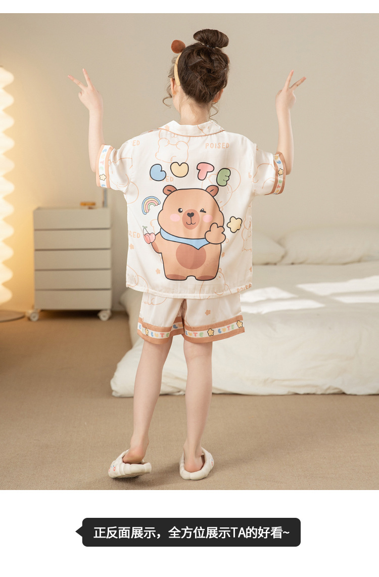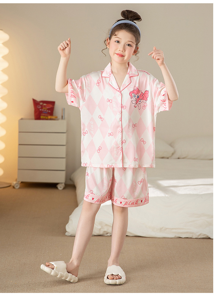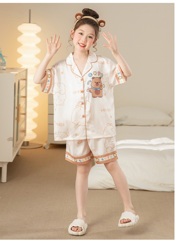 어린이 아이스 실크 잠옷 소녀 여름 반팔 얇은 귀여운 실크 홈 옷 아기 중 큰 어린이 소녀 세트