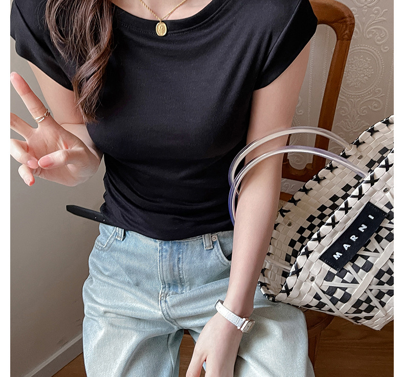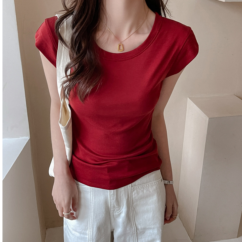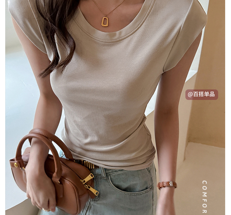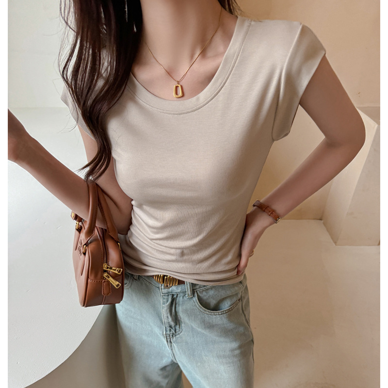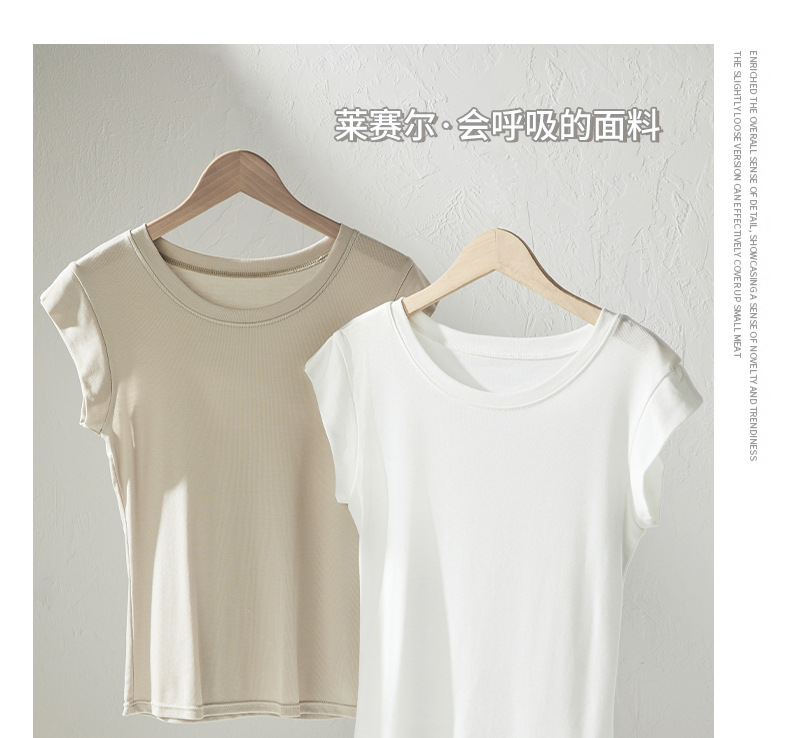Lyocell Tencel 새로운 어깨 반팔 티셔츠 여성용 어깨 와이드 슬림 핏 하이 엔드 디자인 센스 작은 플라잉 슬리브 탑