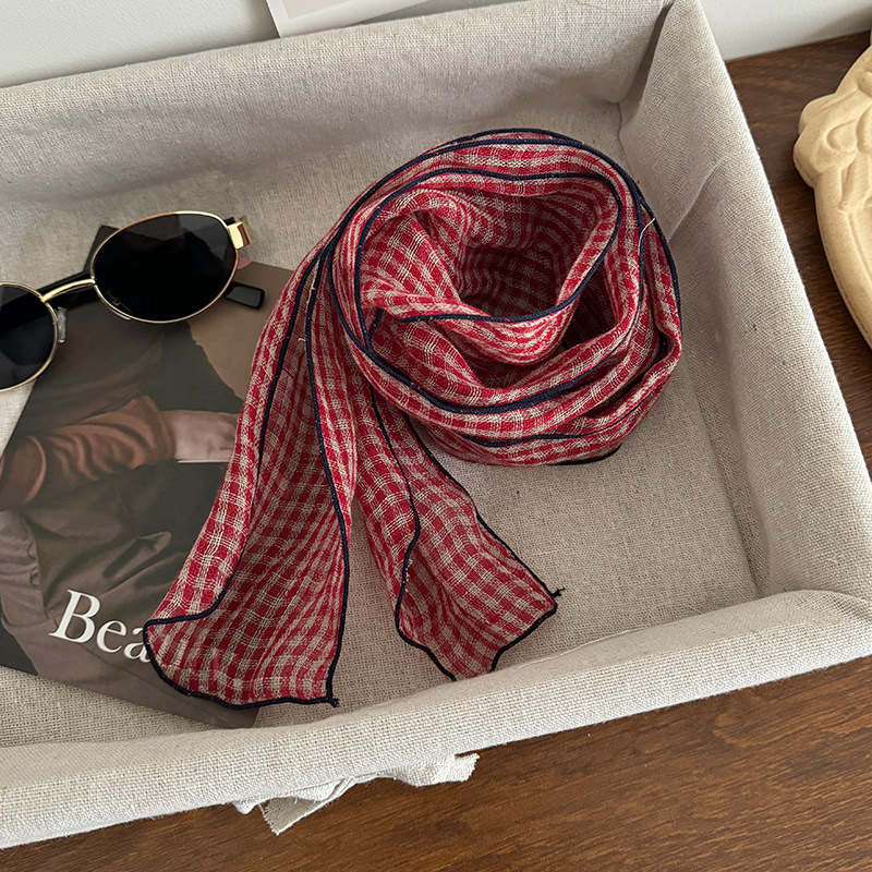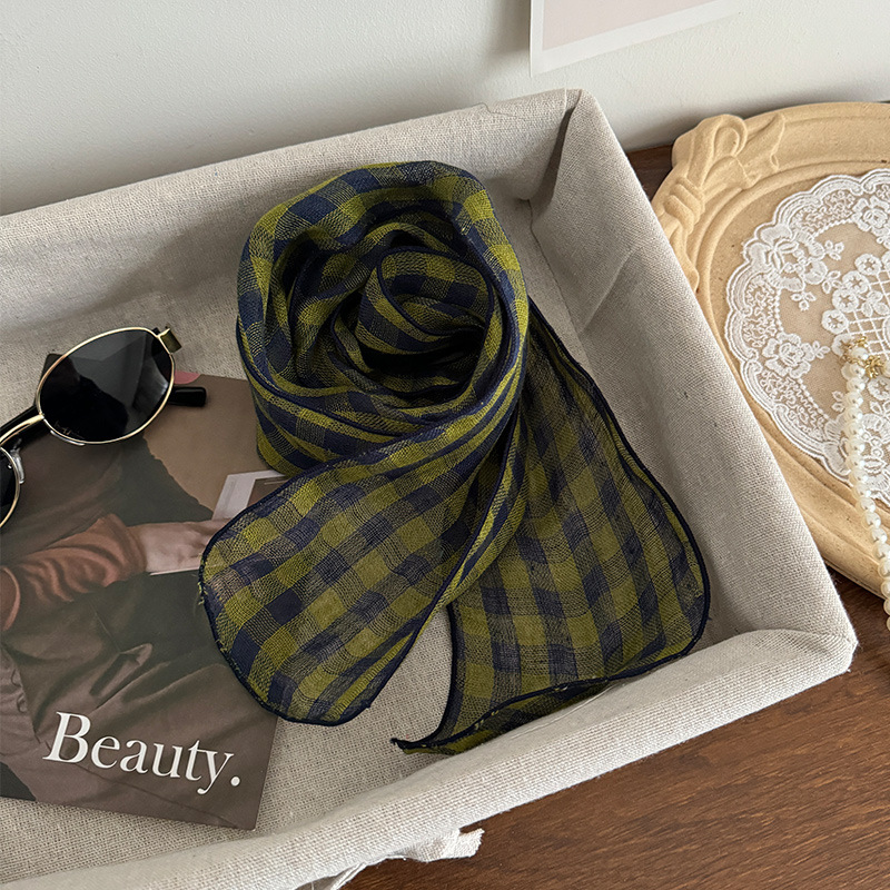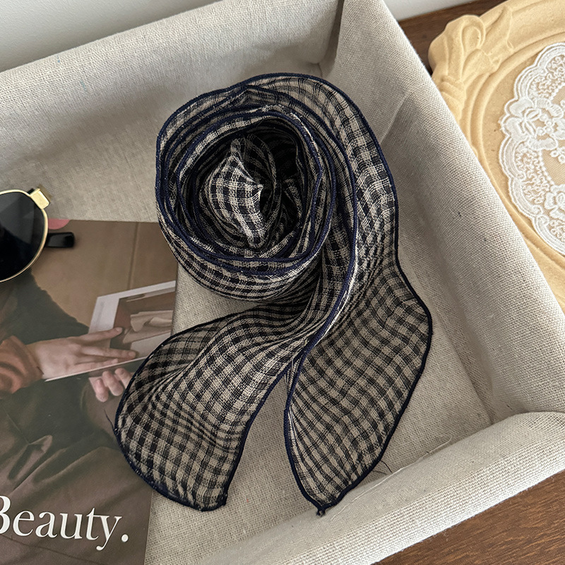 한국 리넨 실크 스카프 여성용 일본식 좁은 작은 긴 스카프 올 매치 아티스틱 레트로 리본 프렌치 체크 무늬 통근 액세서리