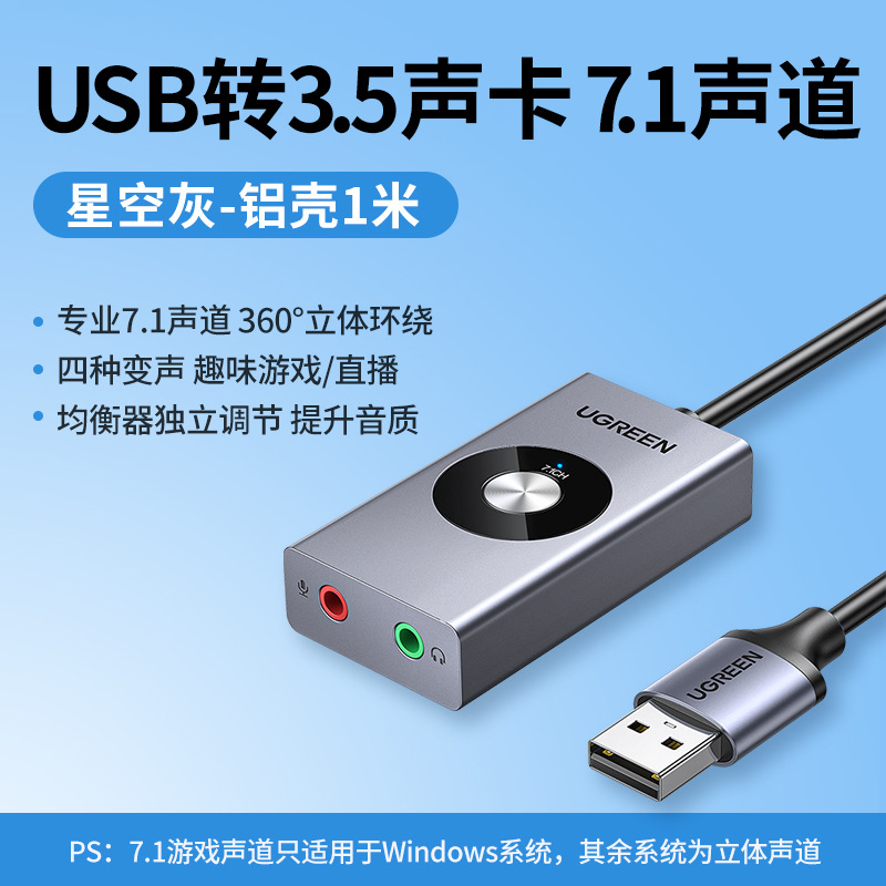 • [7.1 채널 업그레이드] USB to 3.5 헤드셋 사운드 카드 별이 빛나는 하늘 회색-알루미늄 쉘 1m