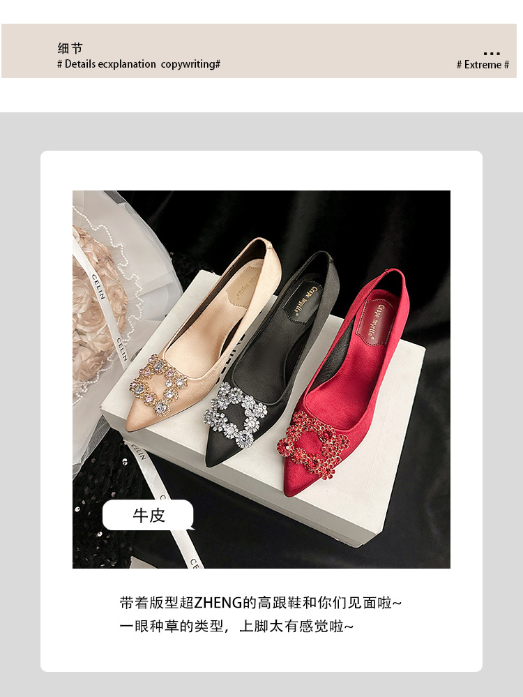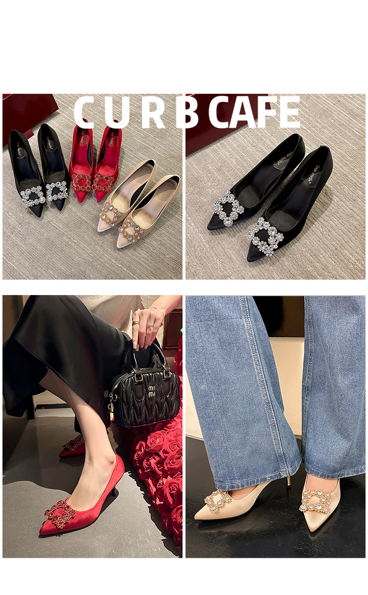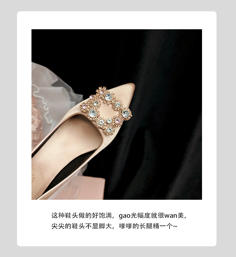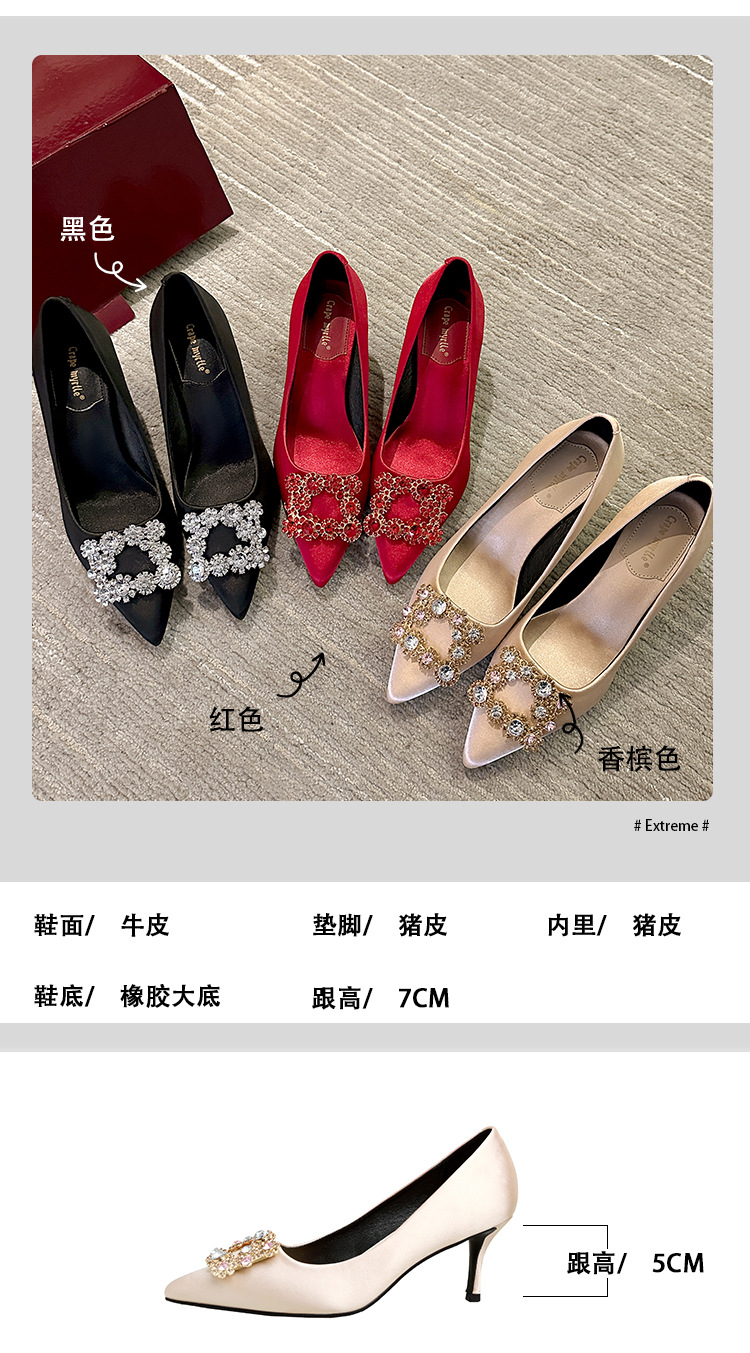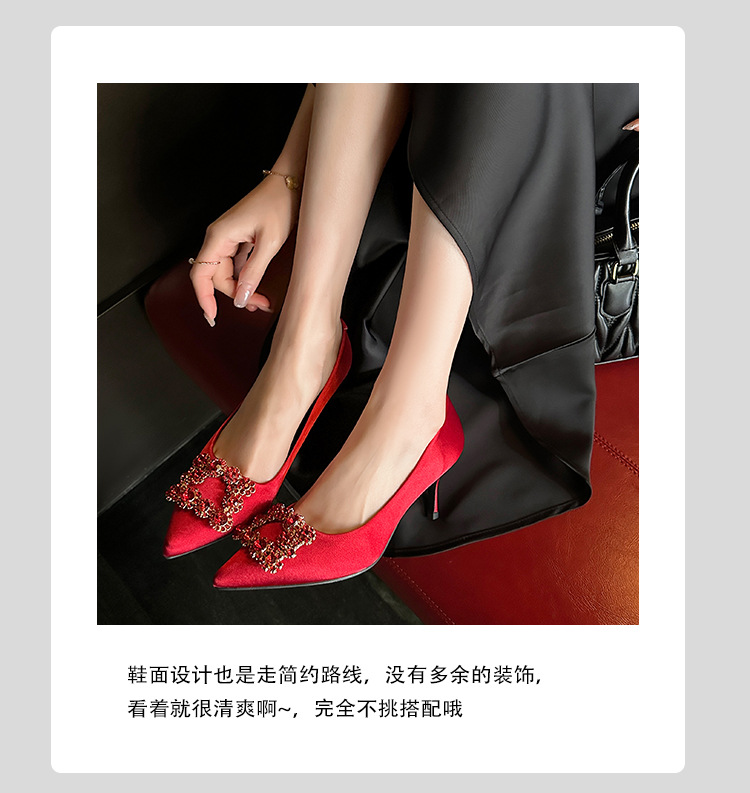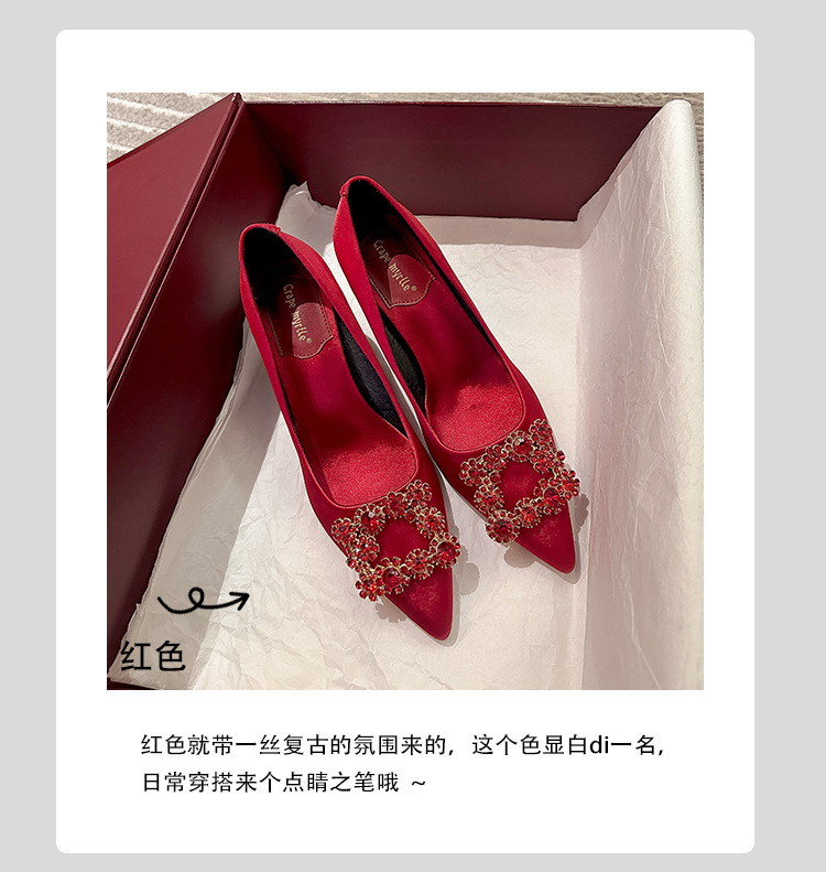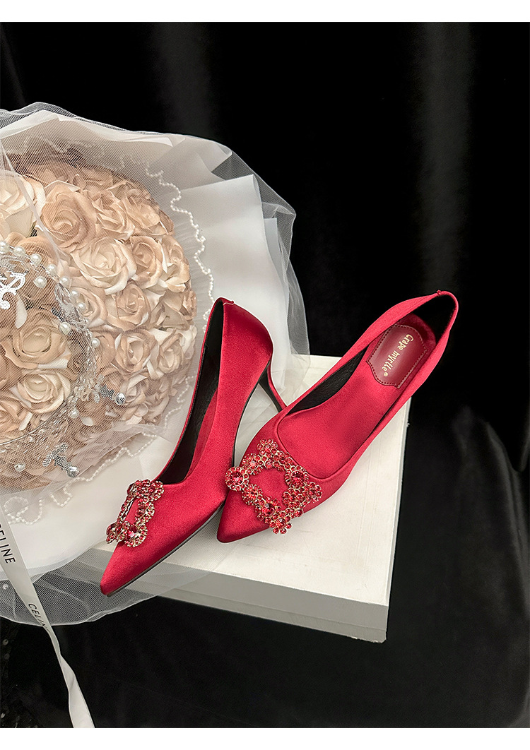 결혼 시즌~ 실크 새틴 얕은 굽 사각 버클 꽃 장식 다이아몬드 스틸레토 뾰족코 여성용 레드 웨딩 슈즈스토어 가기