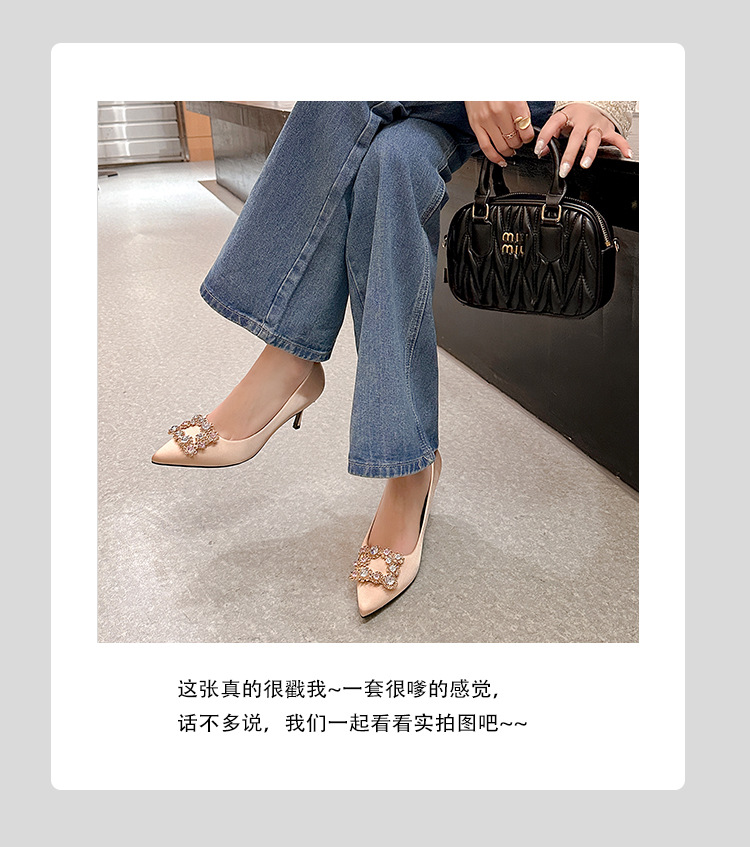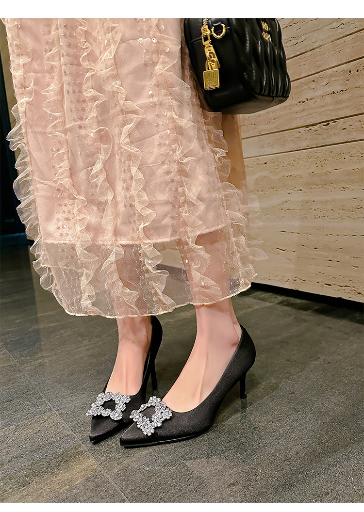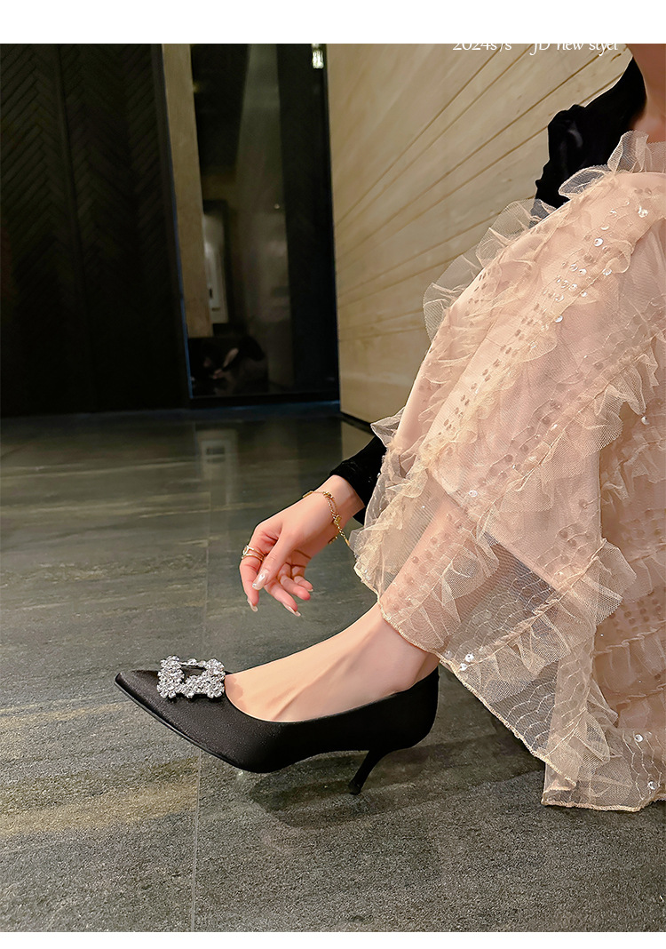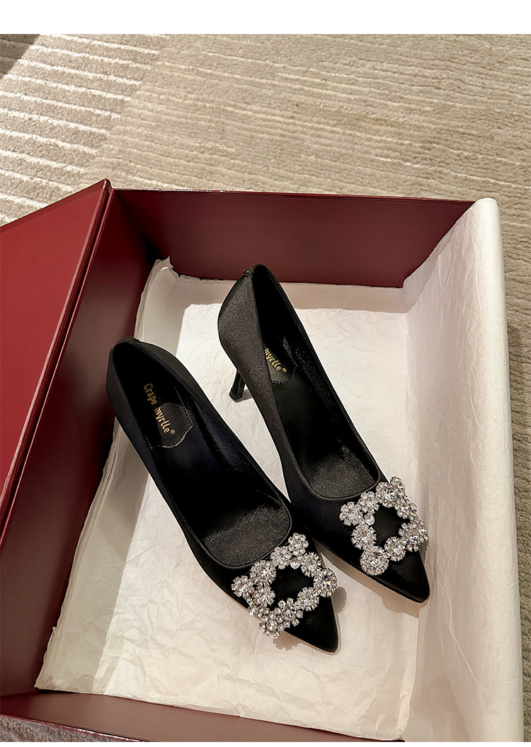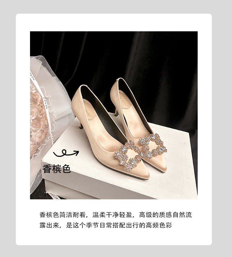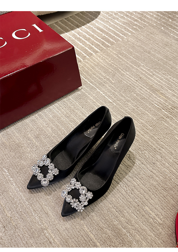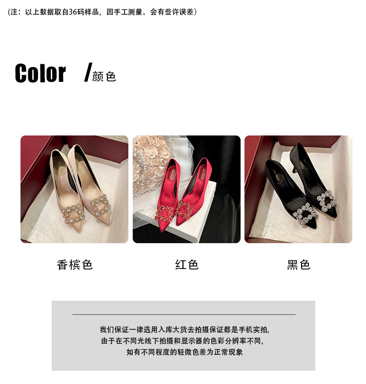 결혼 시즌~ 실크 새틴 얕은 굽 사각 버클 꽃 장식 다이아몬드 스틸레토 뾰족코 여성용 레드 웨딩 슈즈스토어 가기
