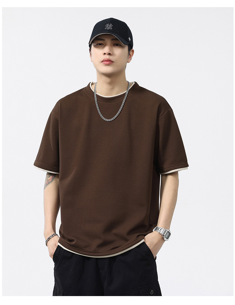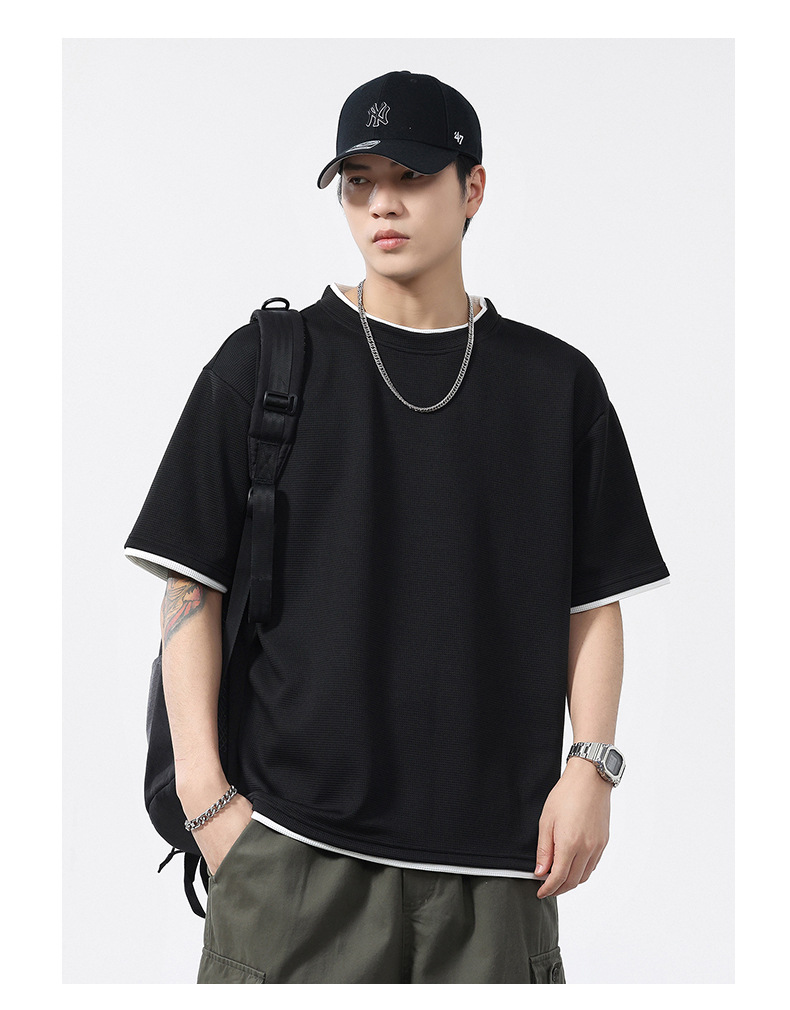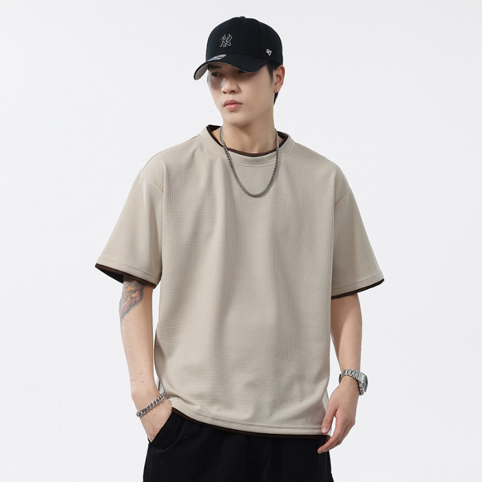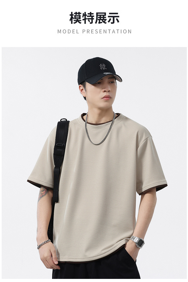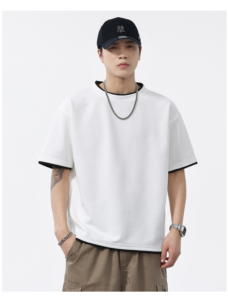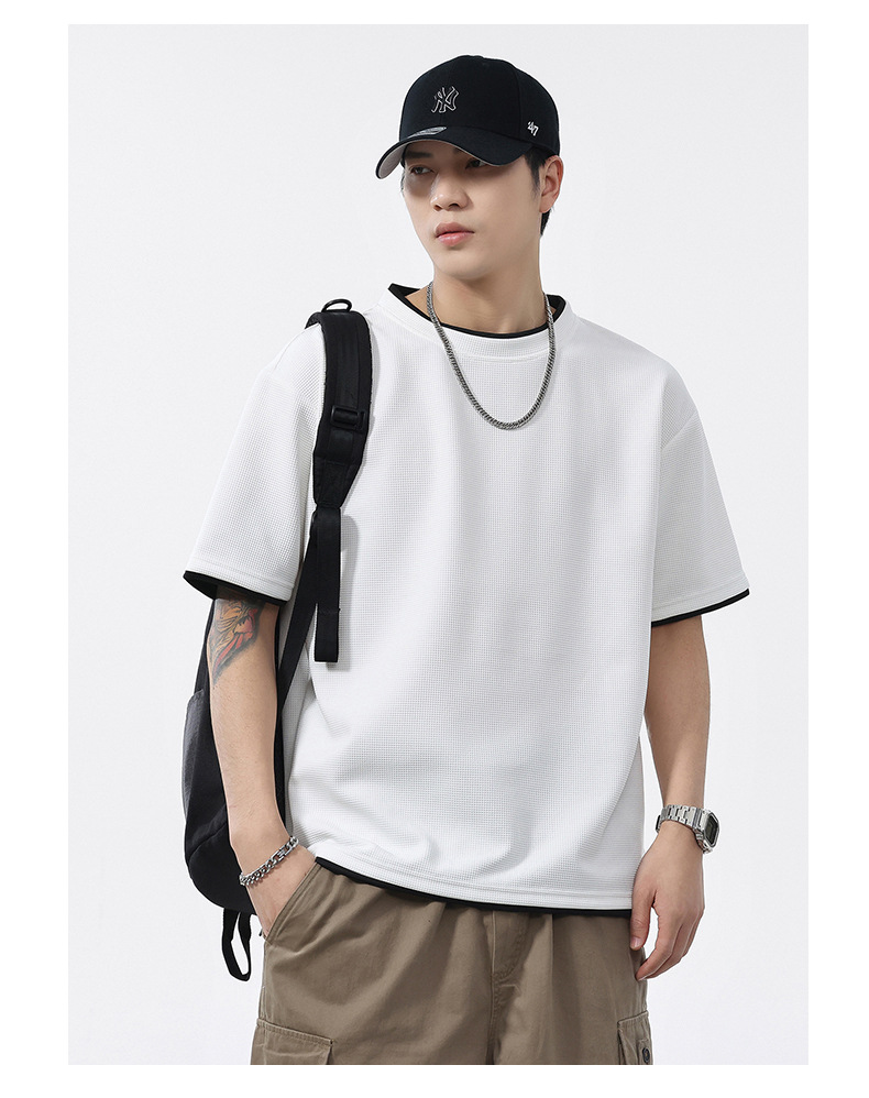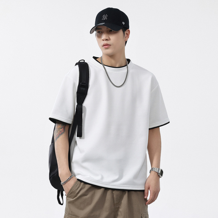 쿨코튼 아메리칸 스타일 와플 러 스타일 여름 반팔 남성 티셔츠 일본식 가짜 투피스 반소매 한국식 캐주얼 루즈 티셔츠