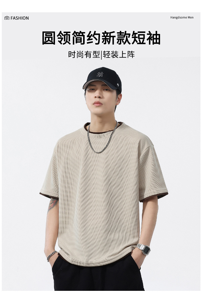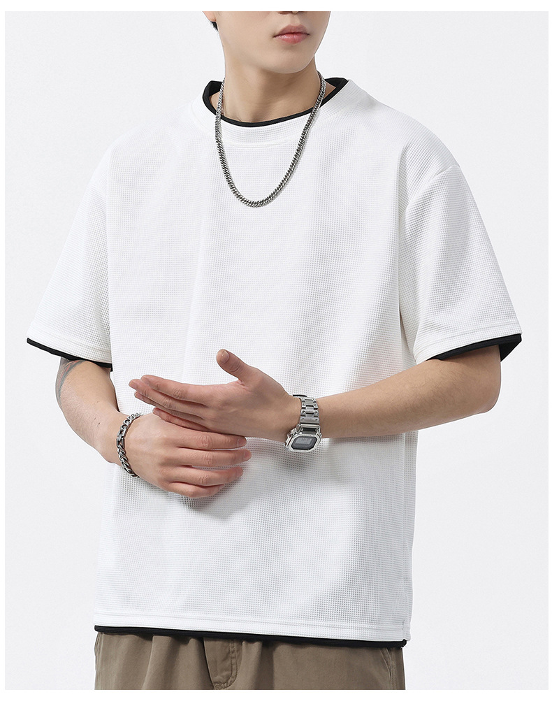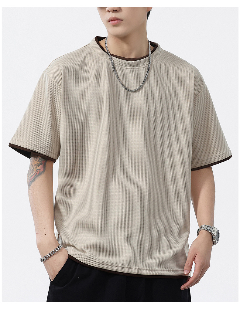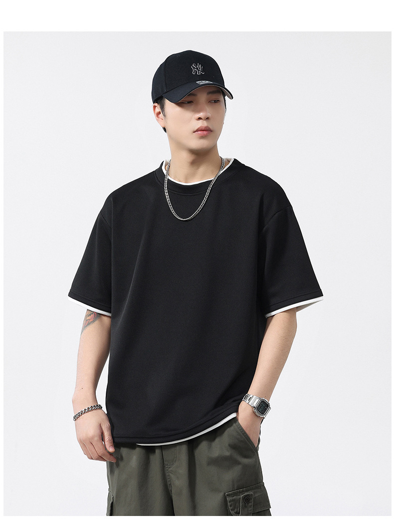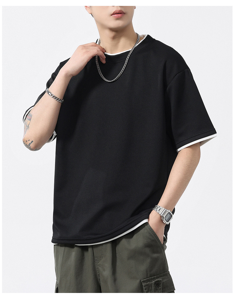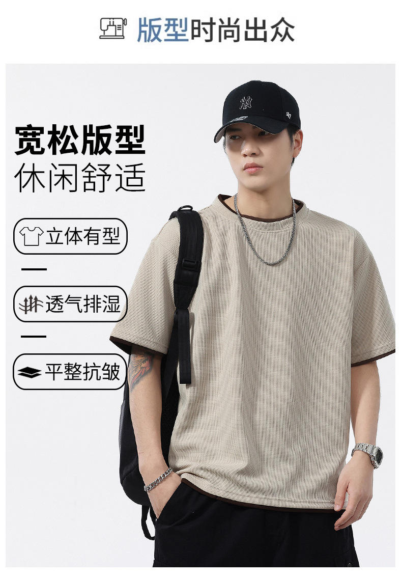 쿨코튼 아메리칸 스타일 와플 러 스타일 여름 반팔 남성 티셔츠 일본식 가짜 투피스 반소매 한국식 캐주얼 루즈 티셔츠