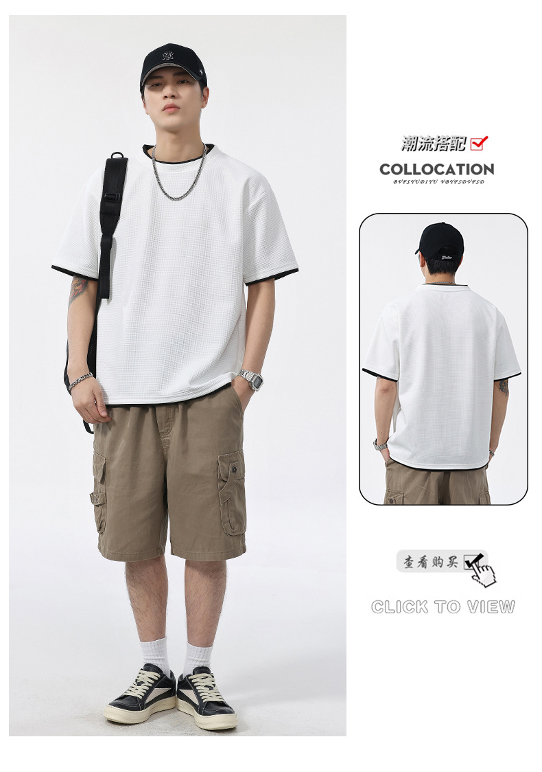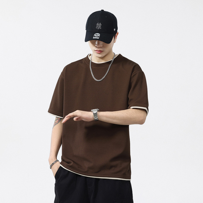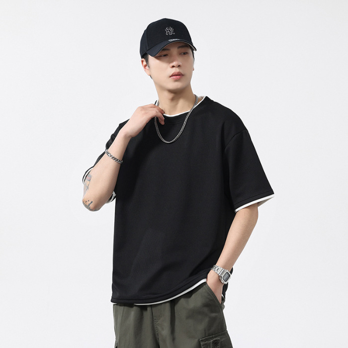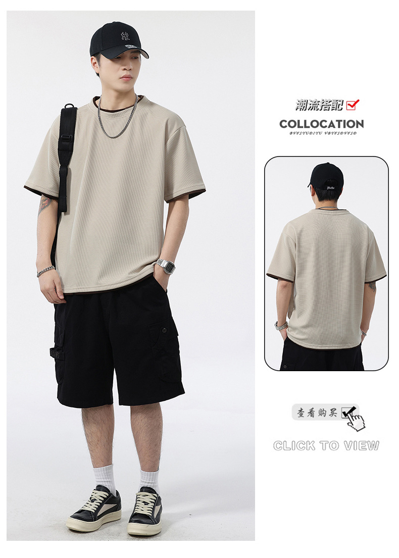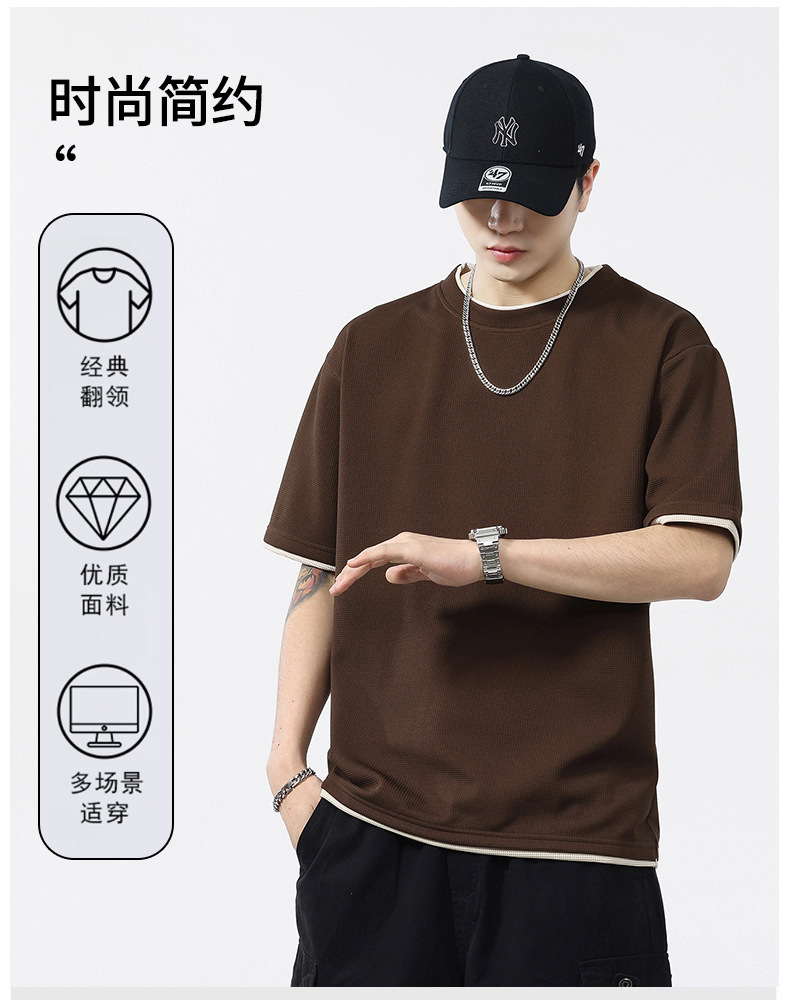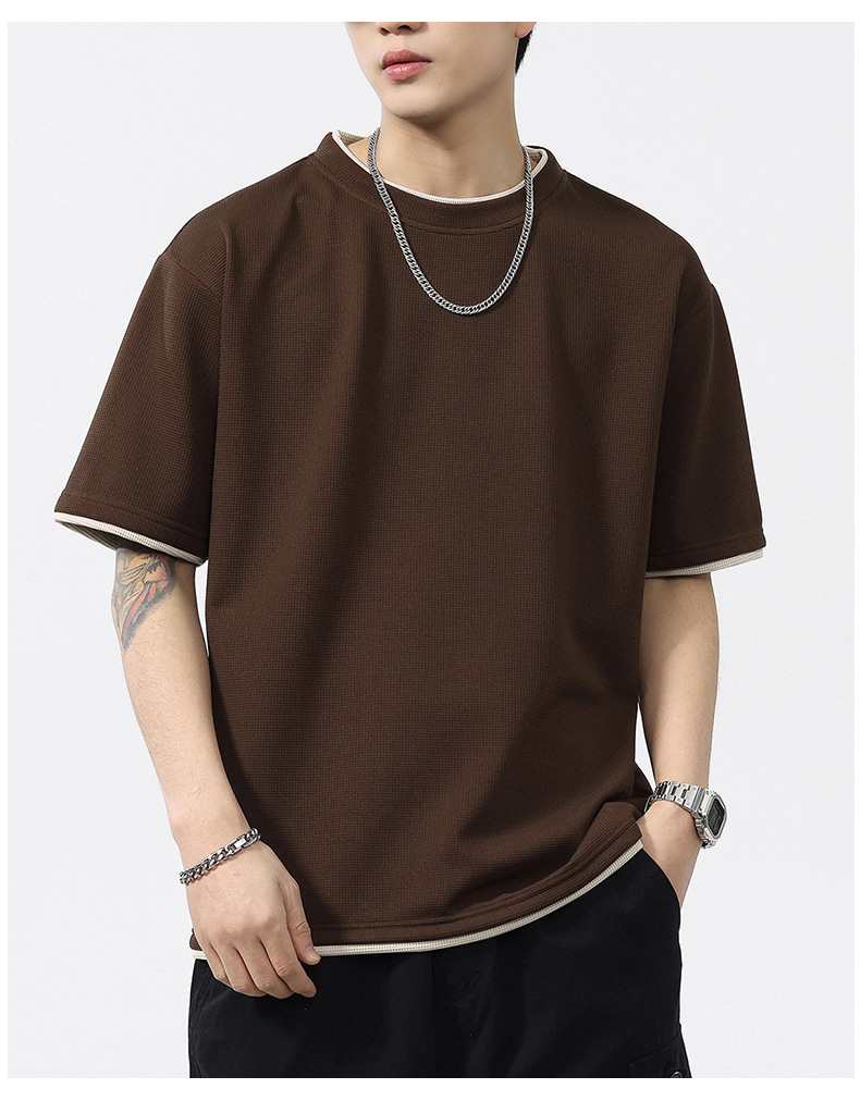 쿨코튼 아메리칸 스타일 와플 러 스타일 여름 반팔 남성 티셔츠 일본식 가짜 투피스 반소매 한국식 캐주얼 루즈 티셔츠