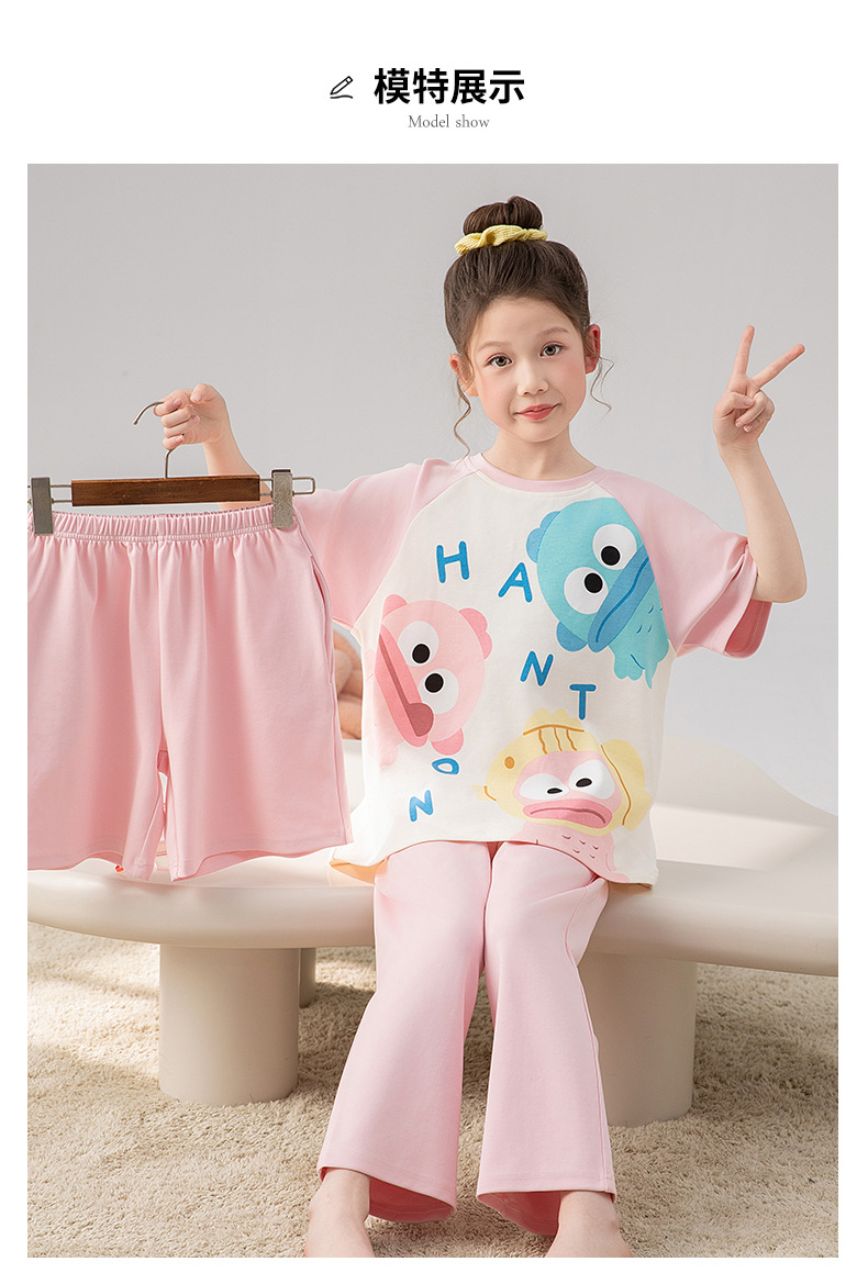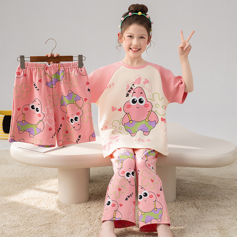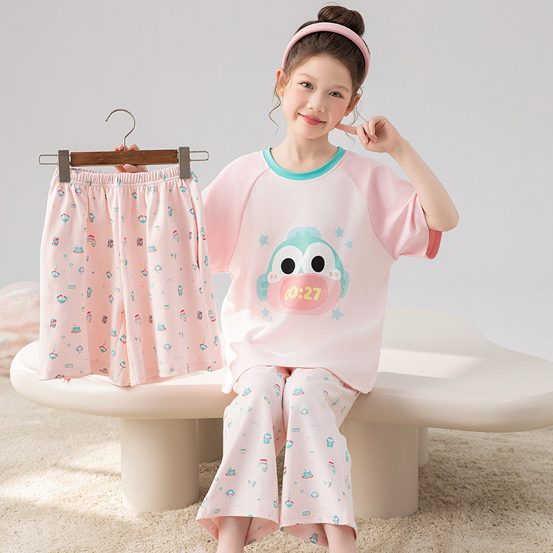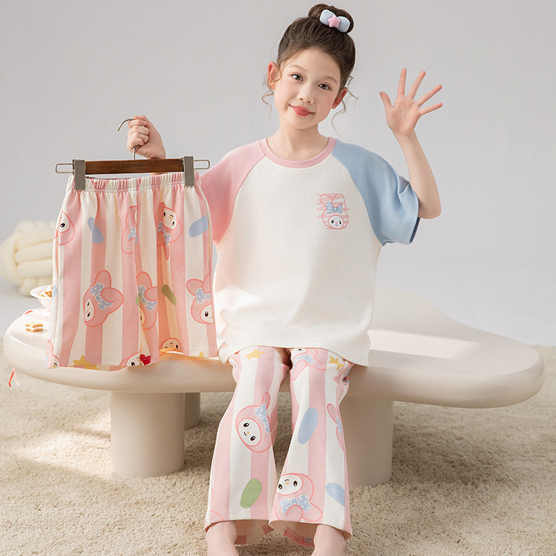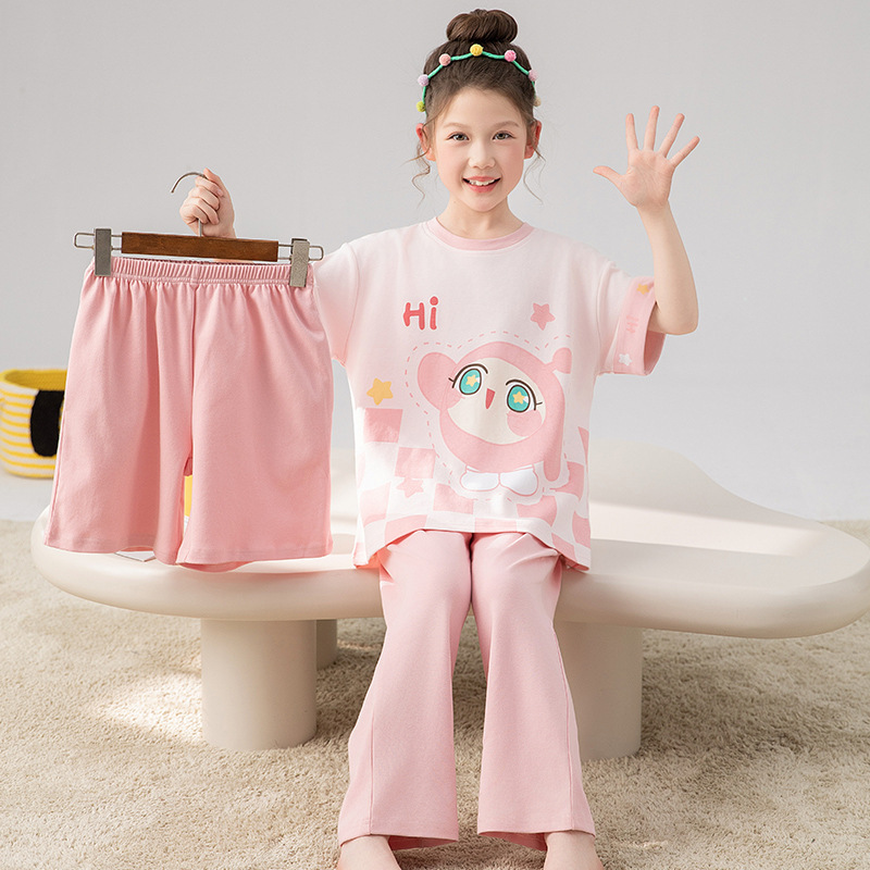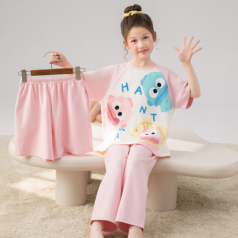 여름 여름 얇은 면화 반팔 바지 어린이 만화 소녀 봄과 가을 가정 의류를위한 새로운 3 피스 잠옷