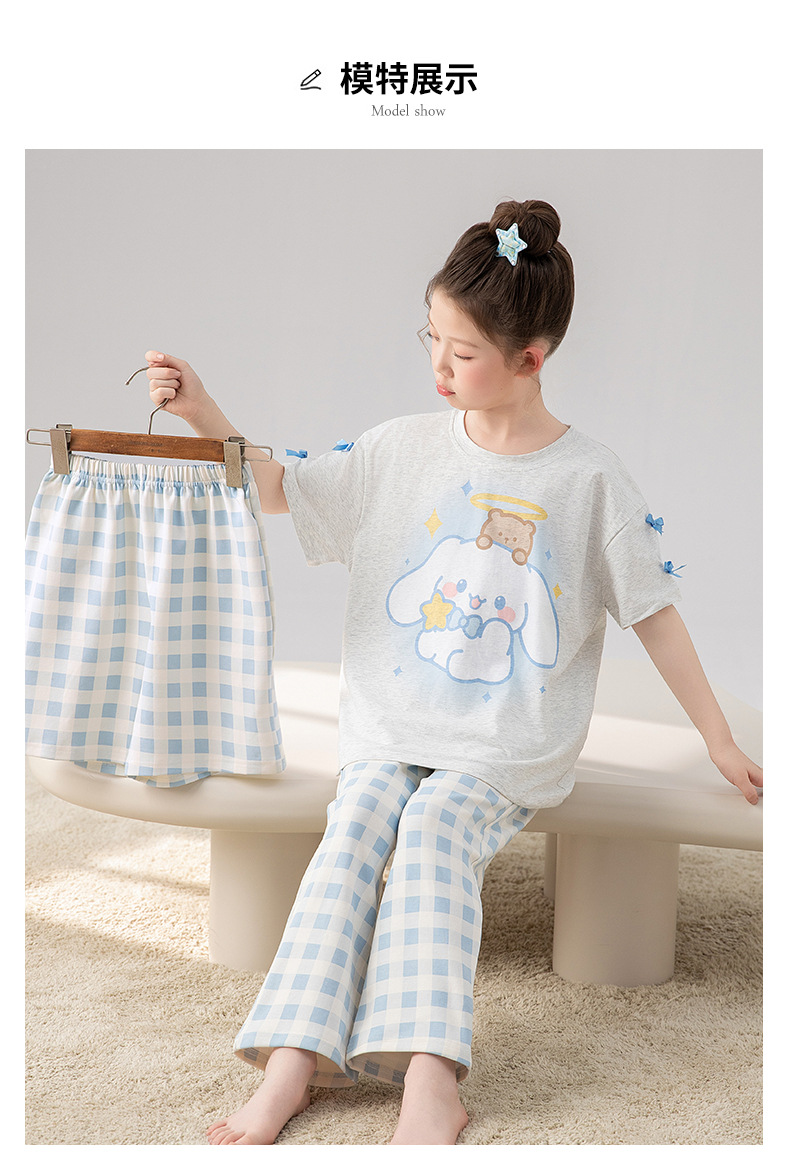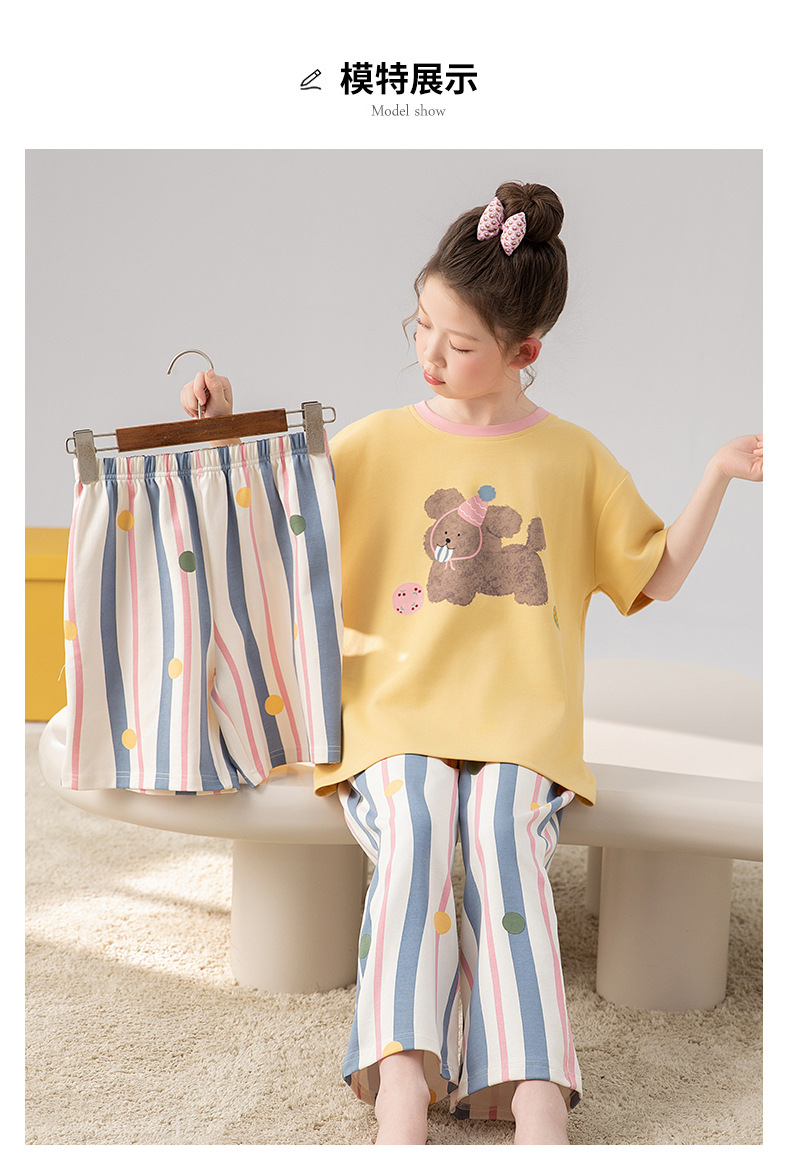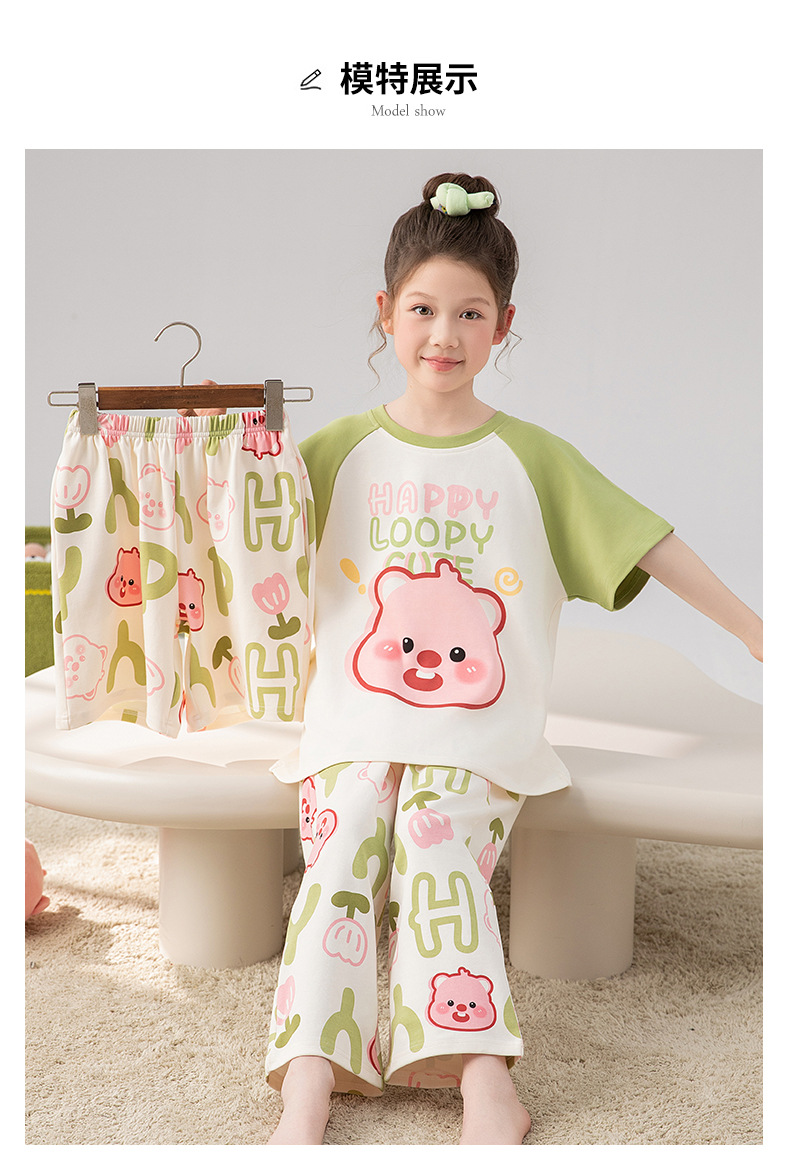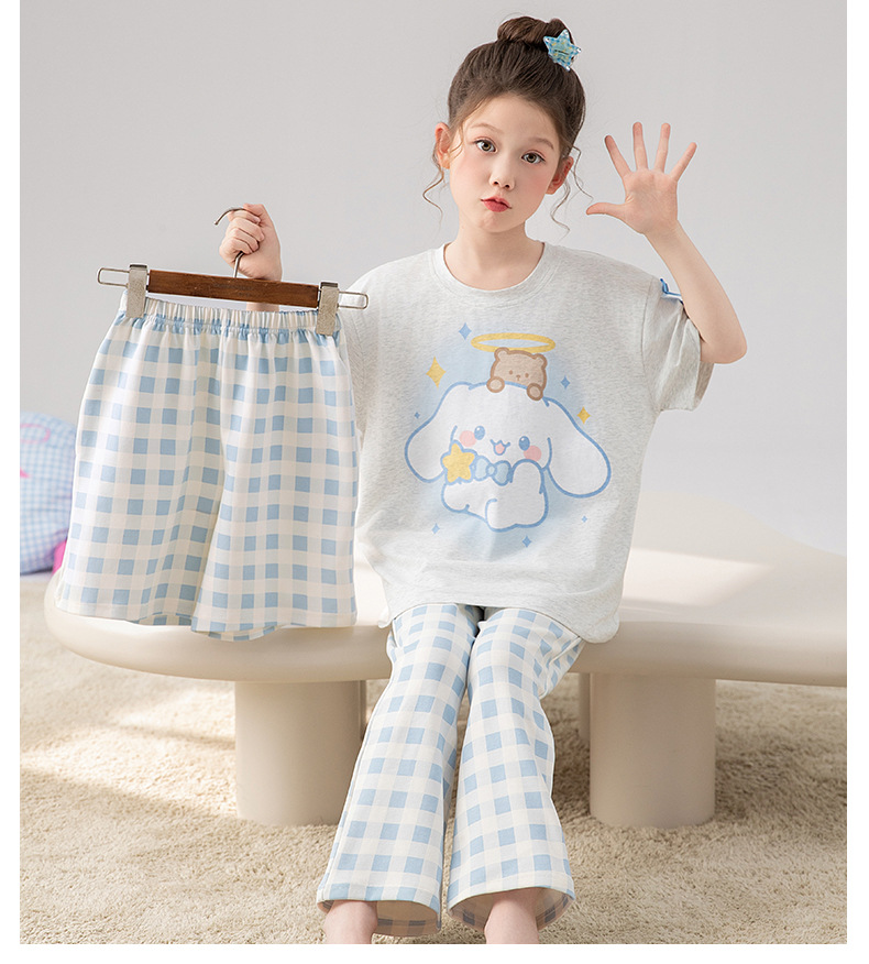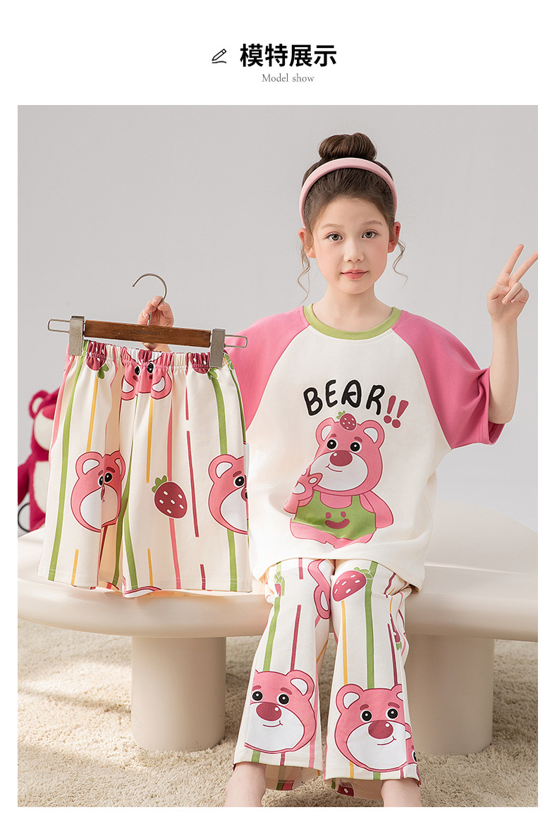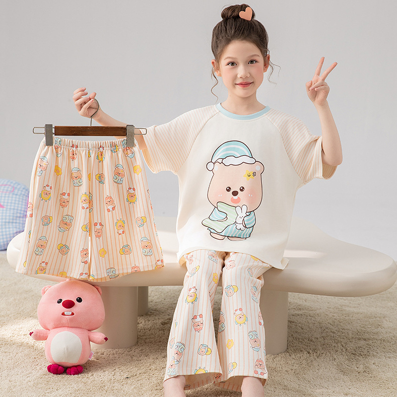 여름 여름 얇은 면화 반팔 바지 어린이 만화 소녀 봄과 가을 가정 의류를위한 새로운 3 피스 잠옷스토어 가기