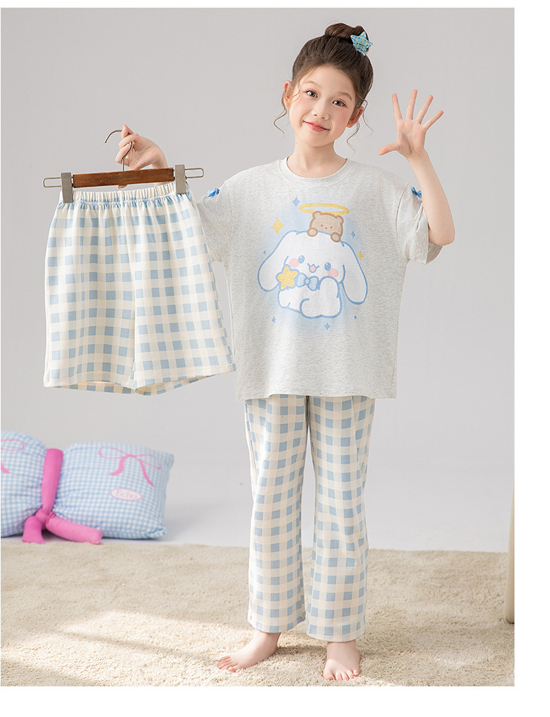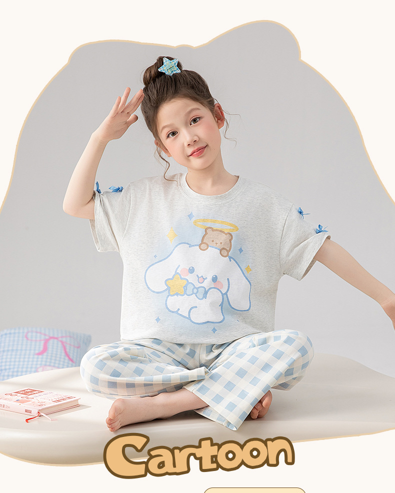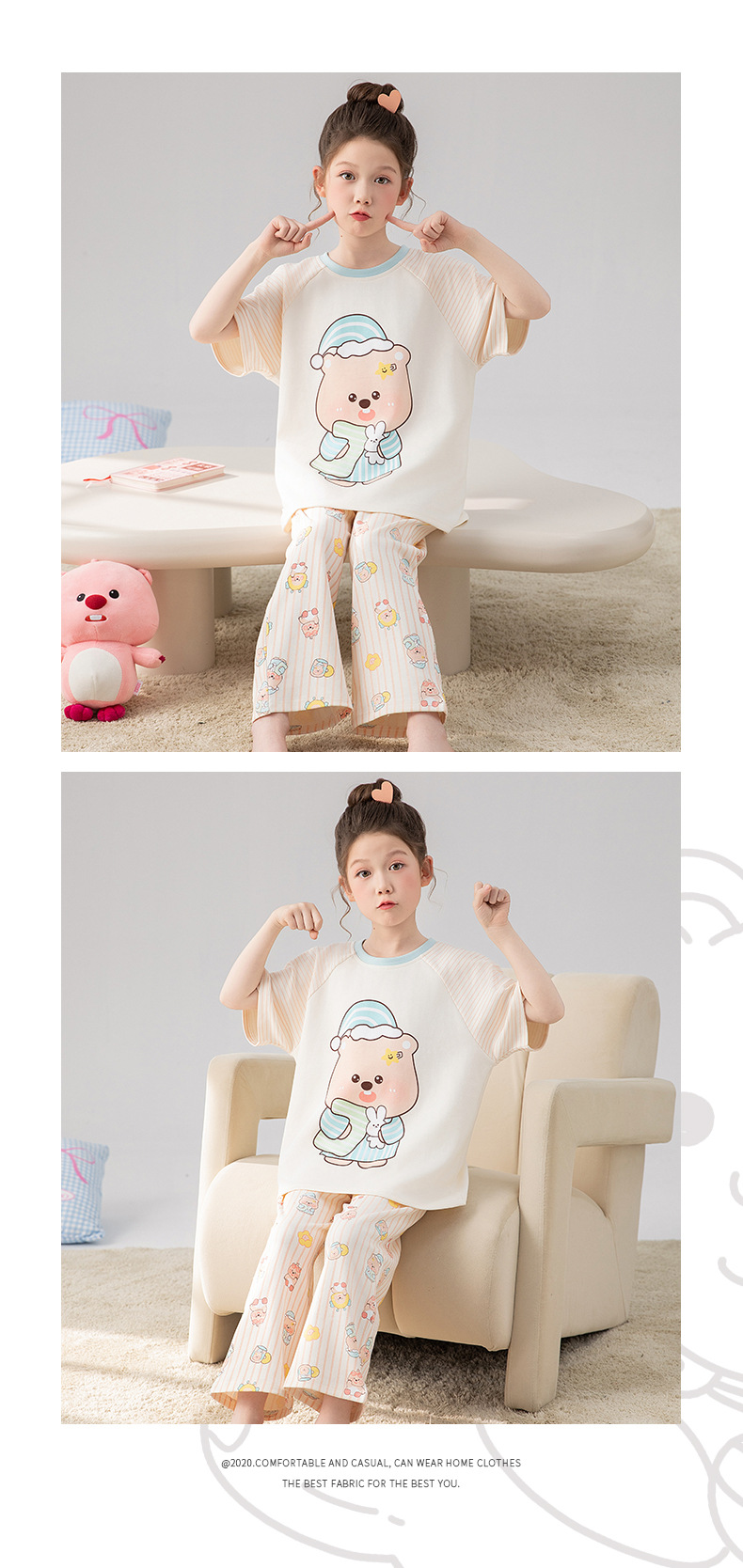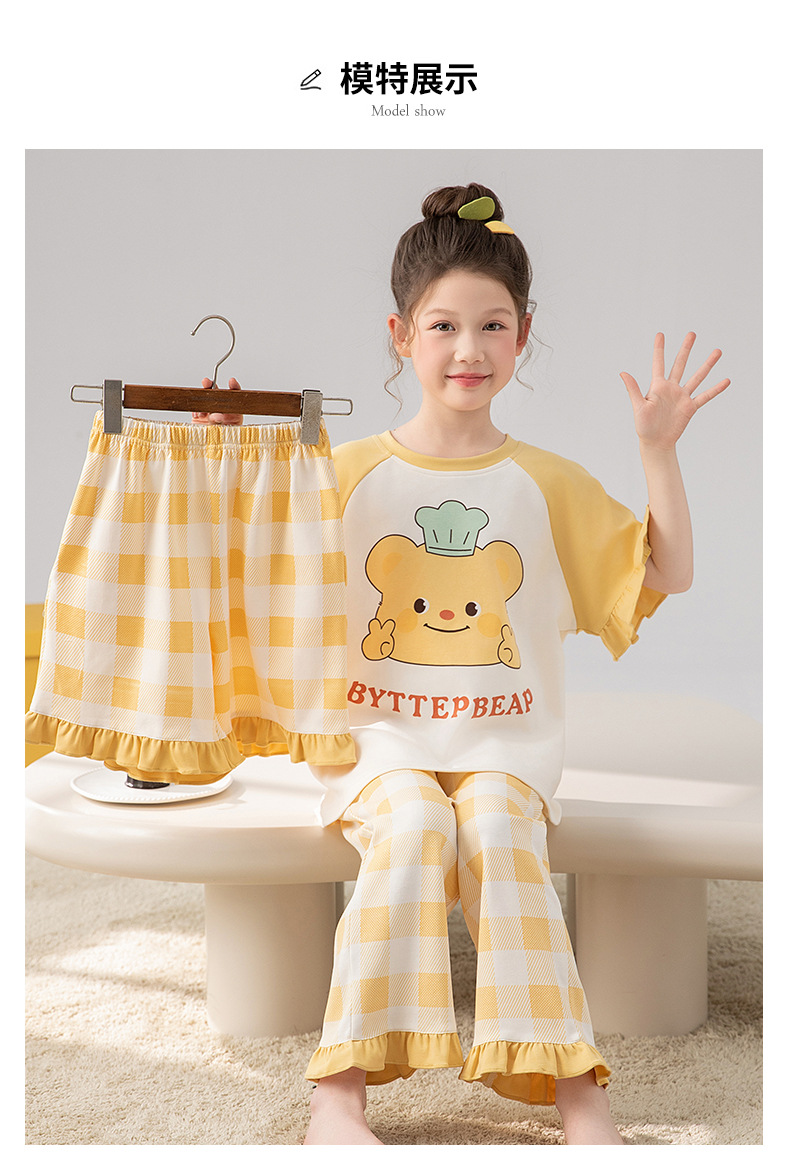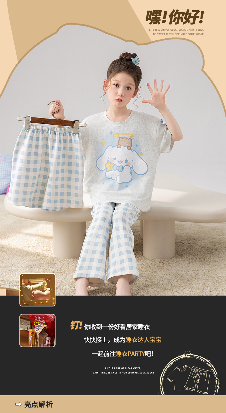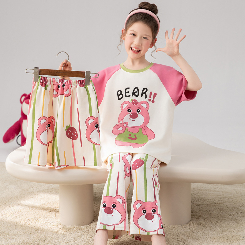 여름 여름 얇은 면화 반팔 바지 어린이 만화 소녀 봄과 가을 가정 의류를위한 새로운 3 피스 잠옷스토어 가기