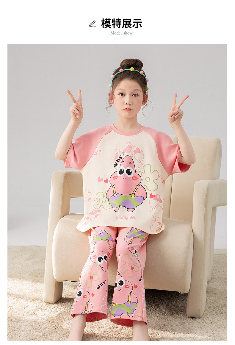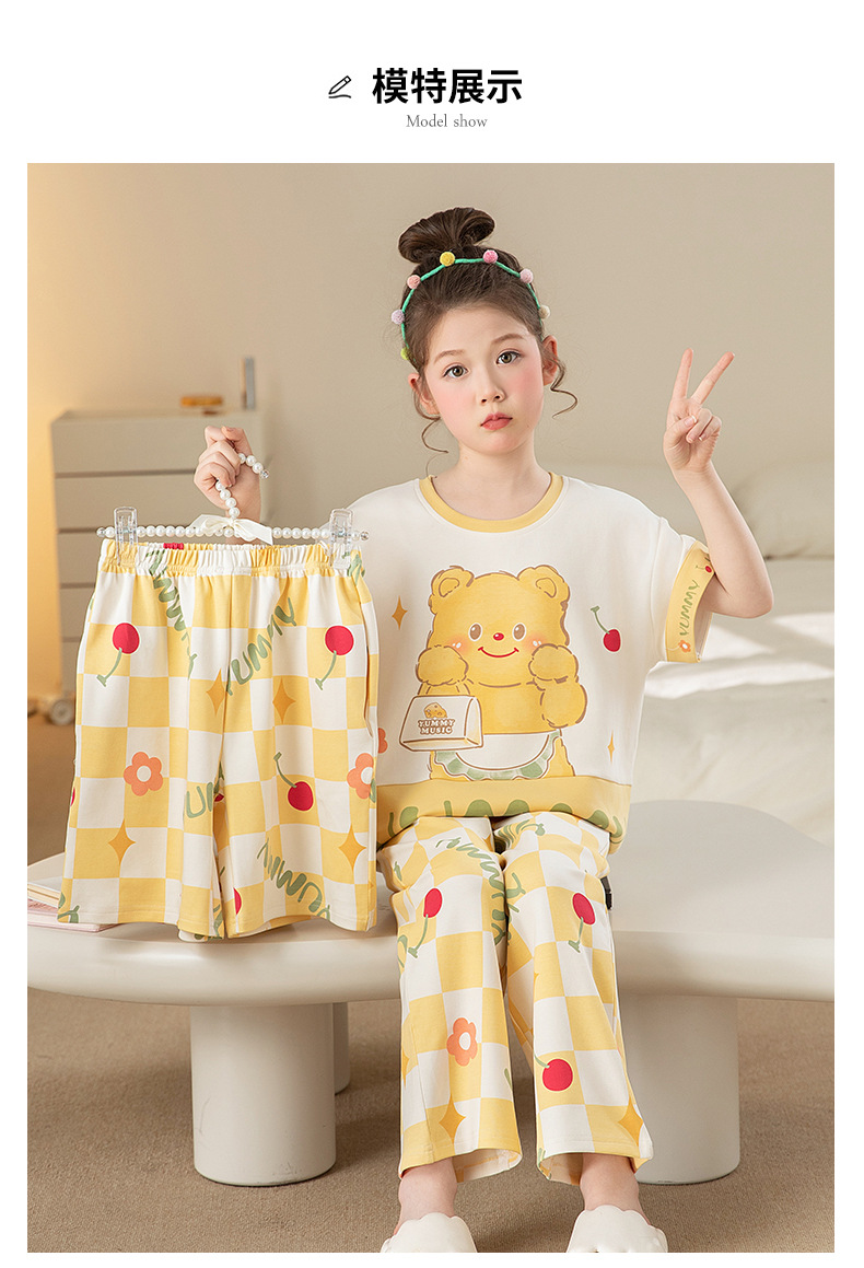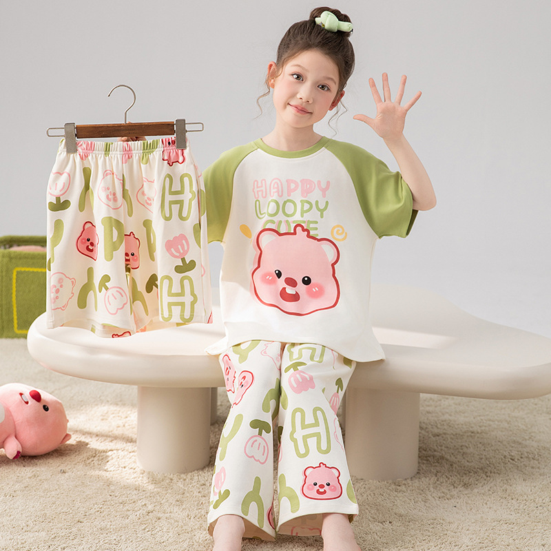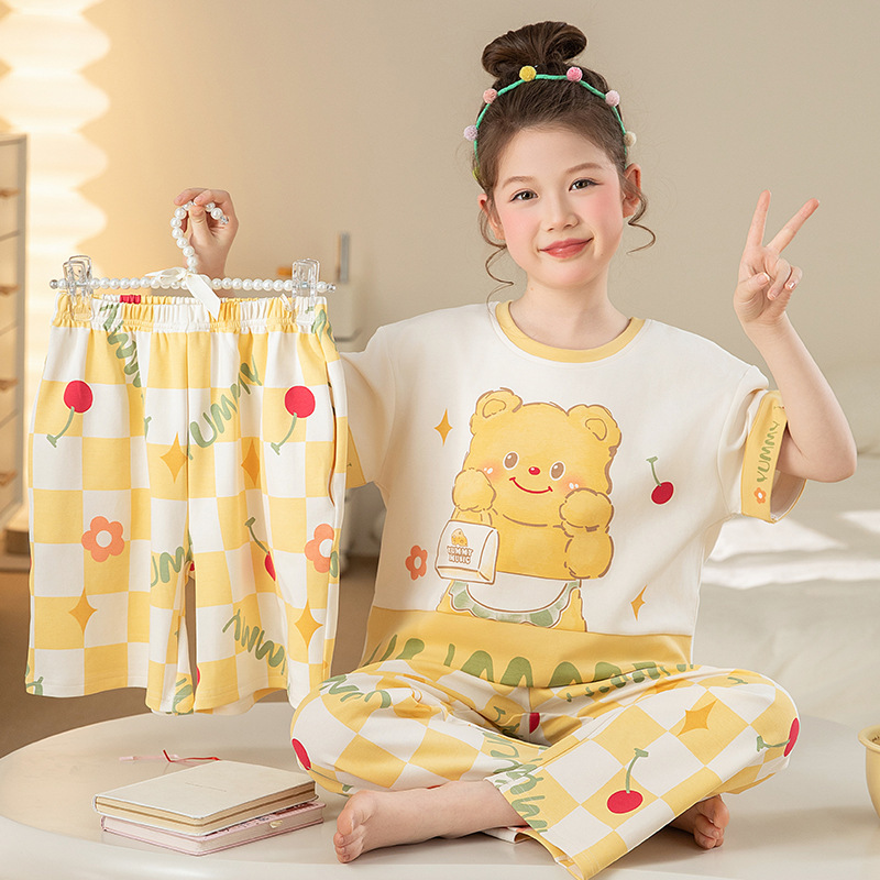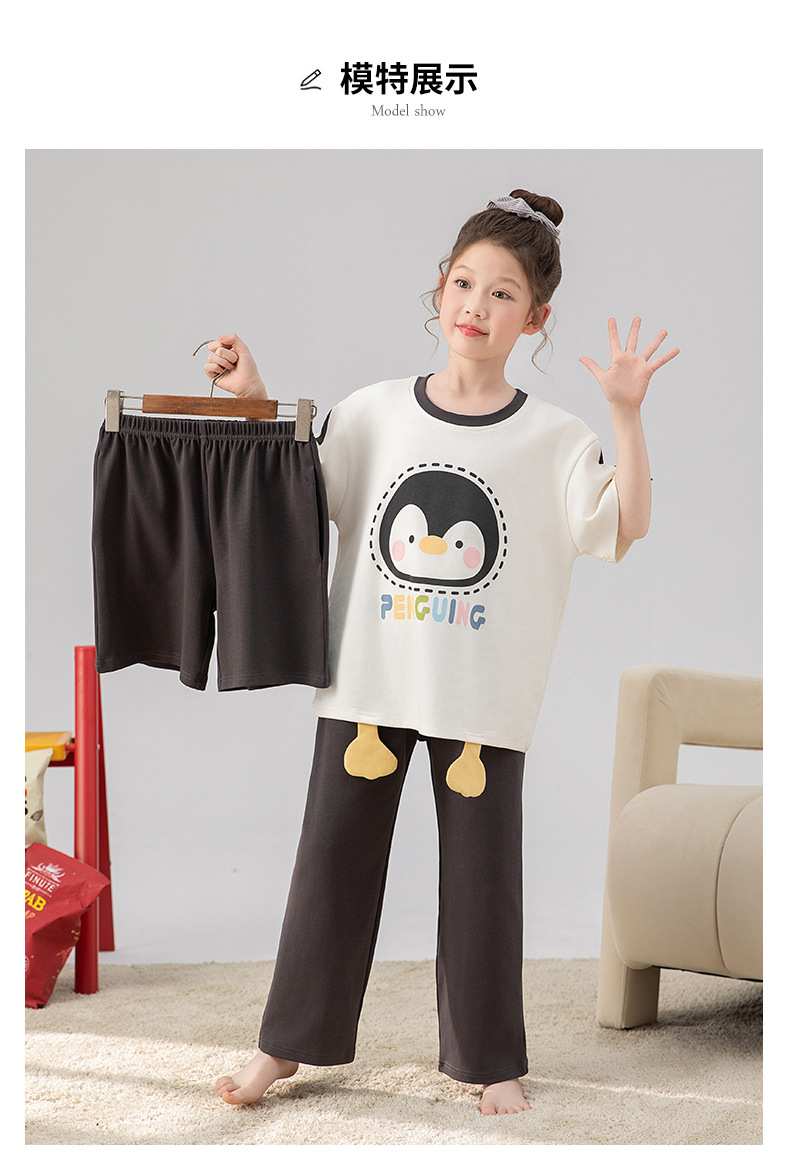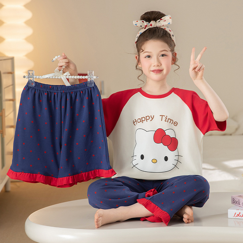 여름 여름 얇은 면화 반팔 바지 어린이 만화 소녀 봄과 가을 가정 의류를위한 새로운 3 피스 잠옷스토어 가기