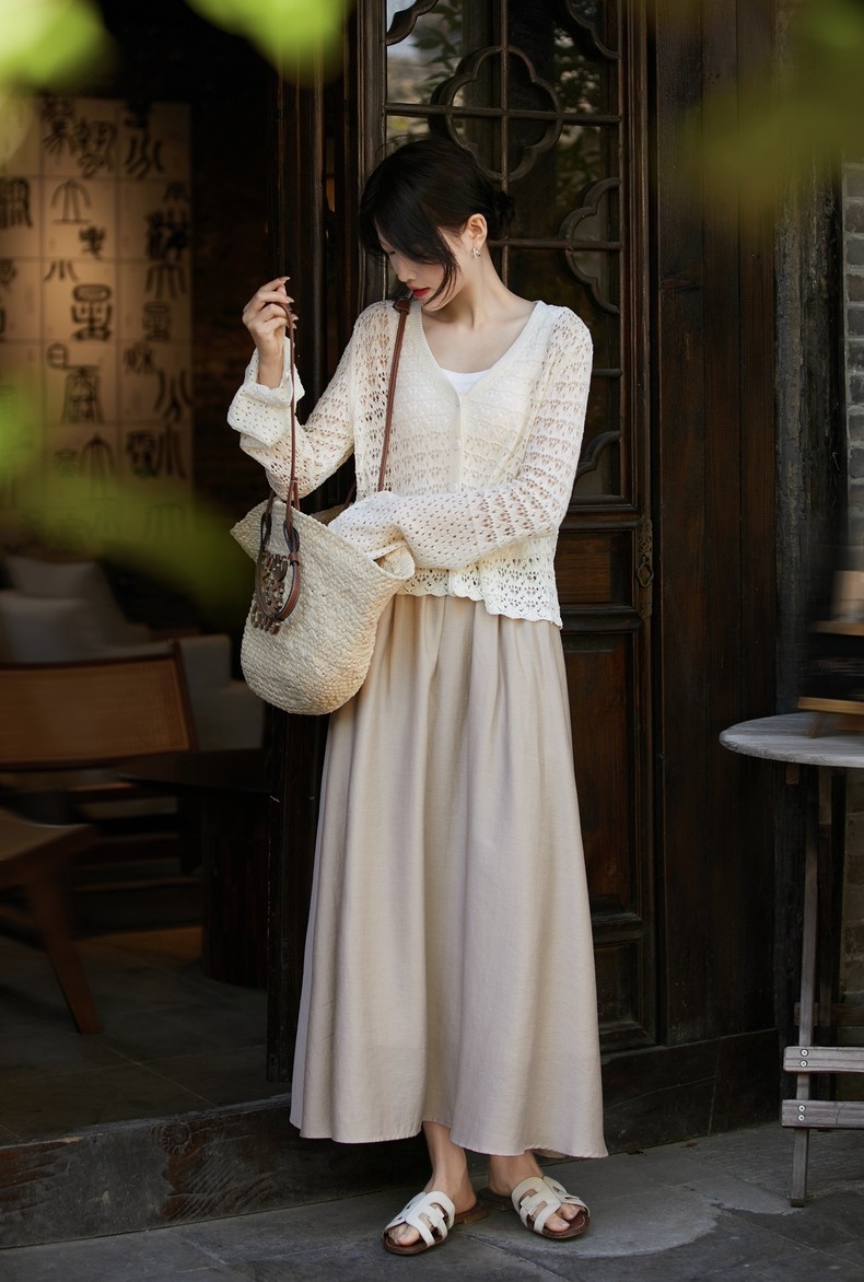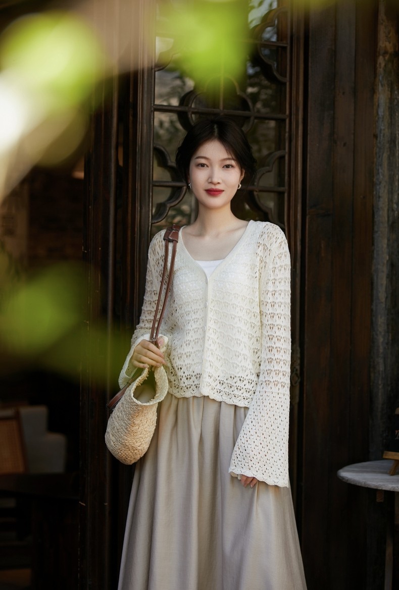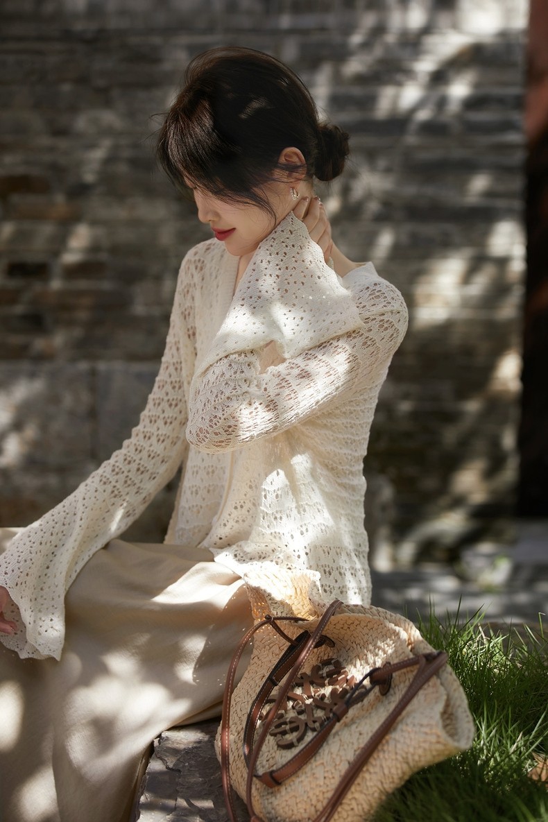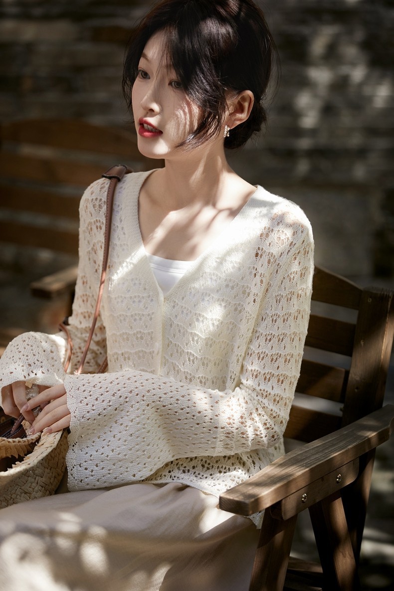 여름 할로우 프랑스 로맨틱 스웨터 여성의 새로운 V 넥 긴팔 태양 보호 의류 유행 캐주얼 간단한 자카드 쿨스토어 가기