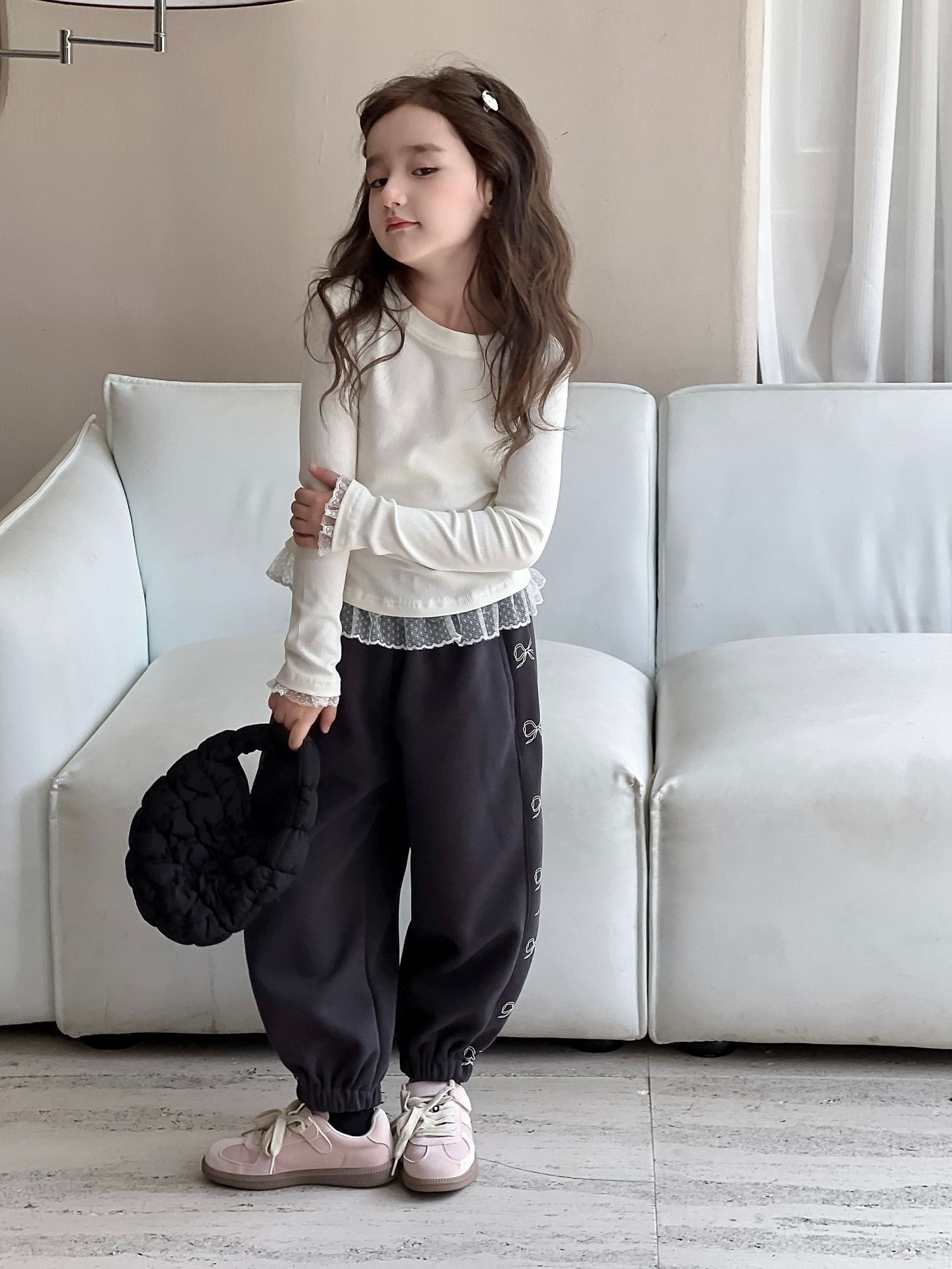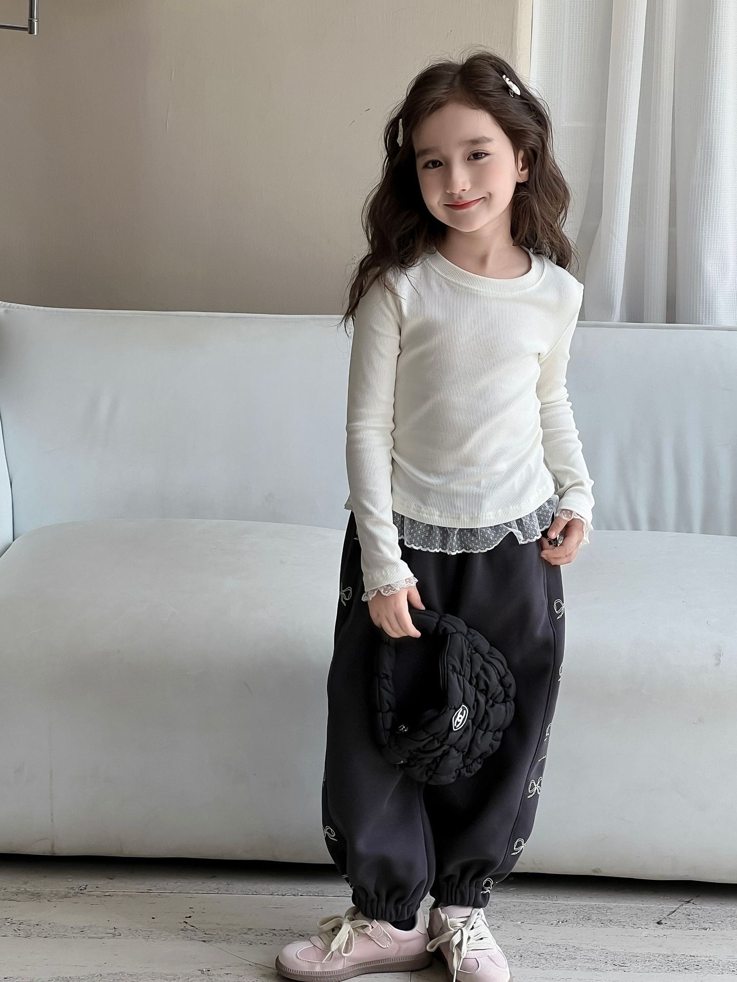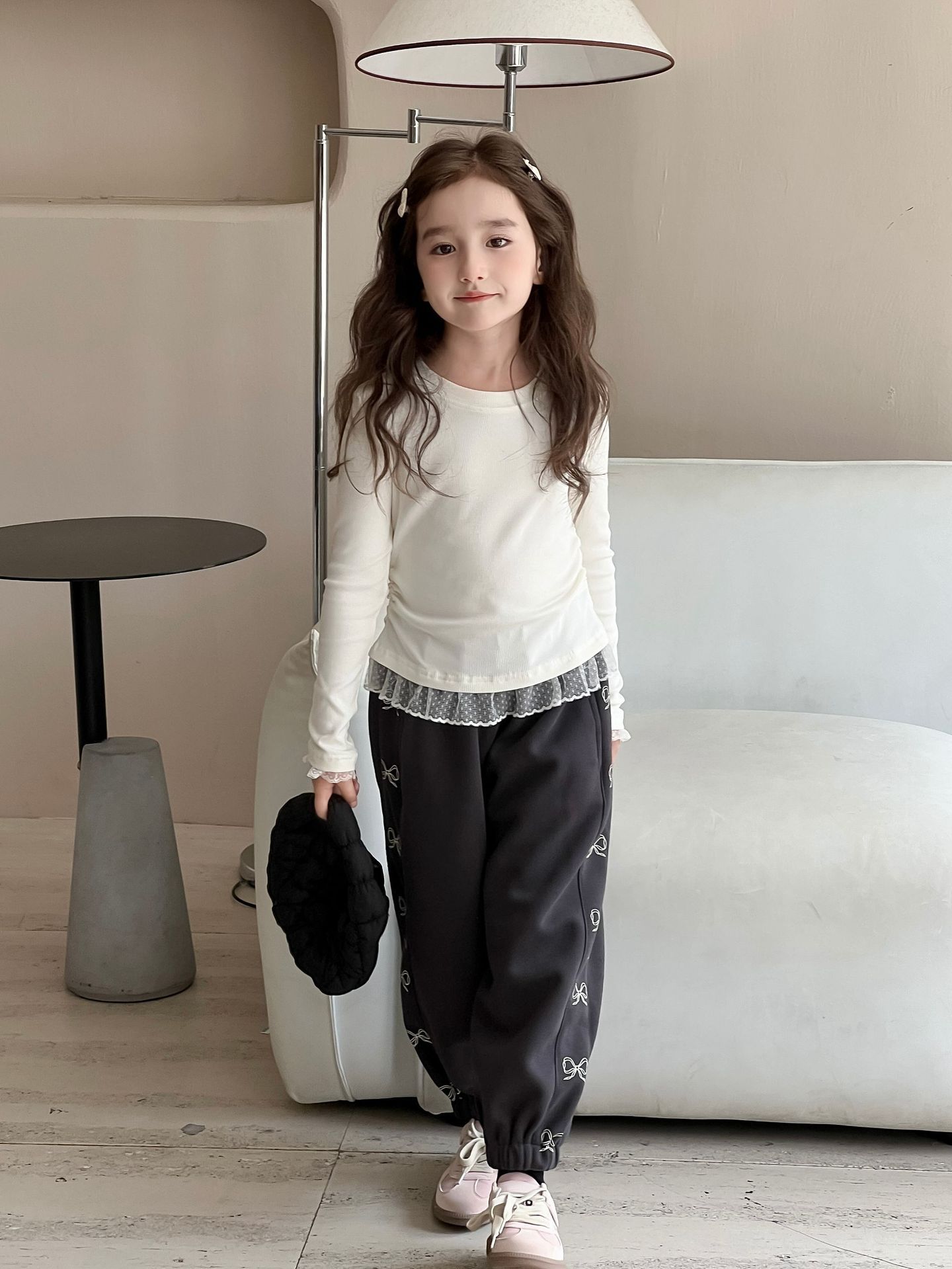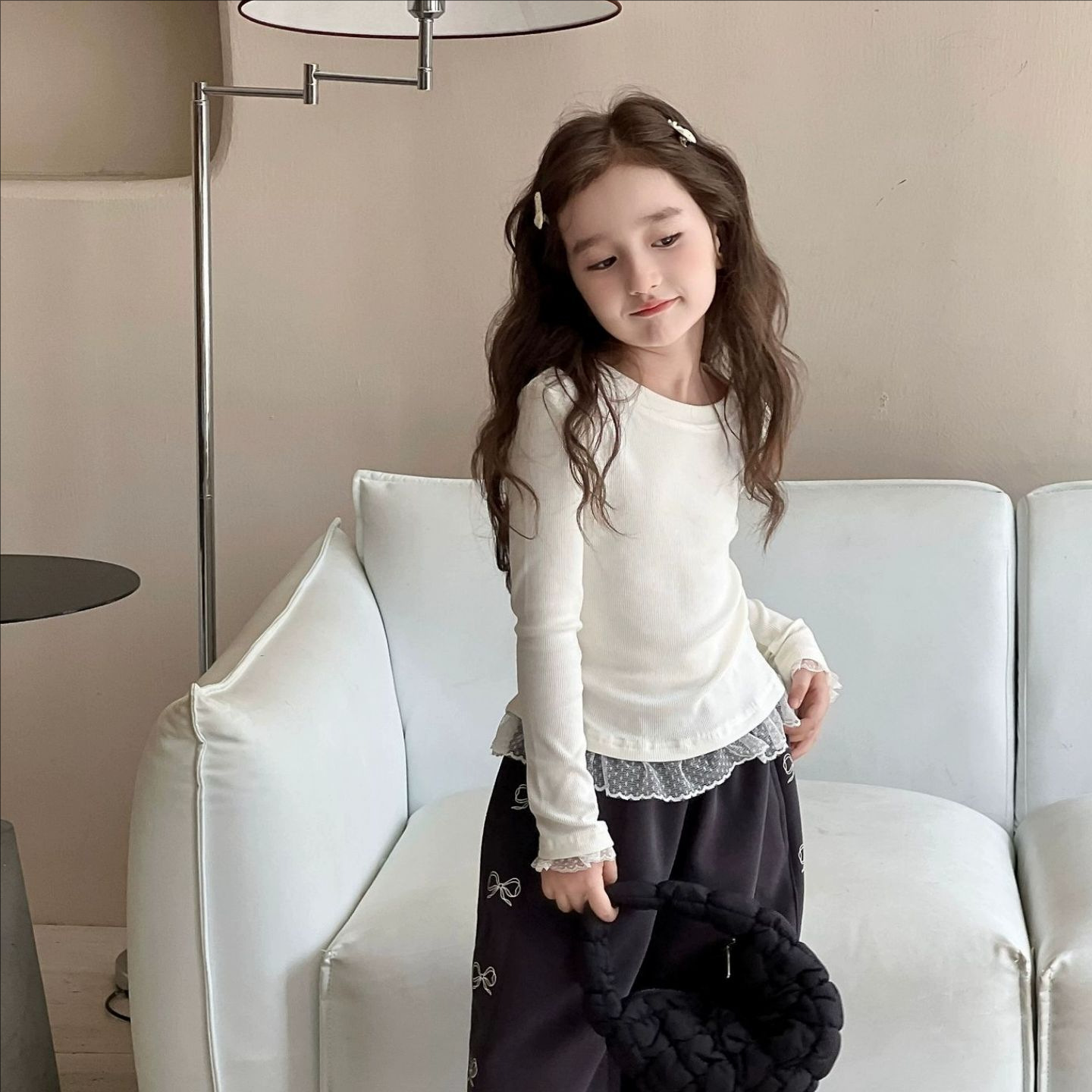 여아용 베이스 레이어 셔츠 2026 봄/가을 여아용 레이스 패치워크 긴팔 티셔츠 화이트 이너탑