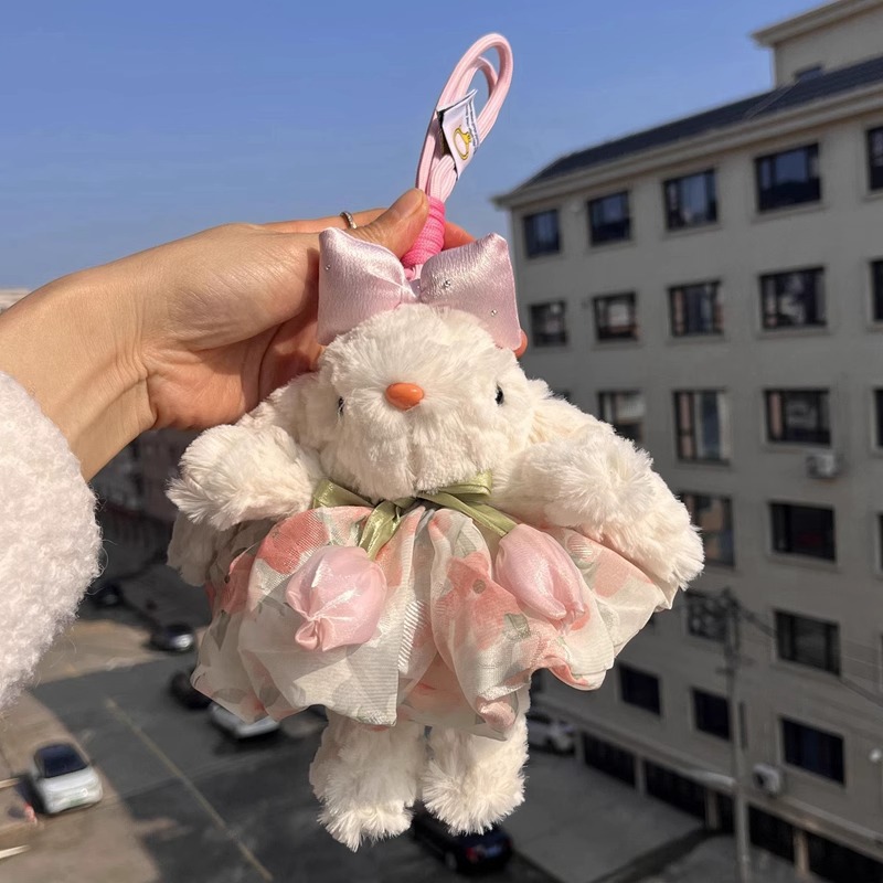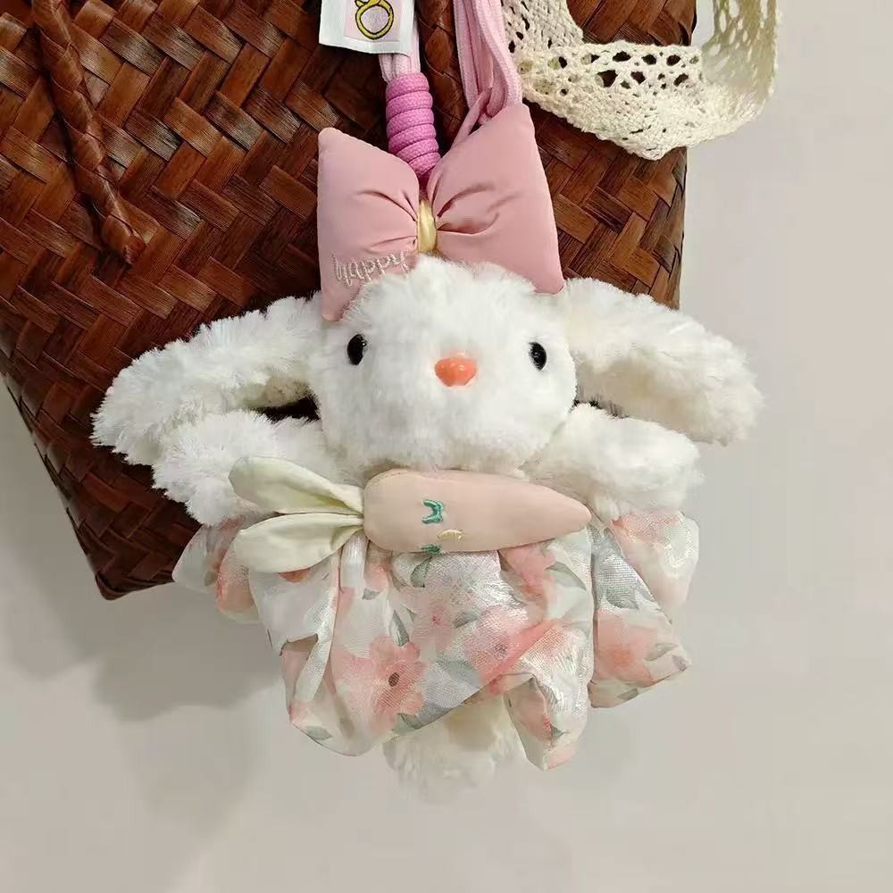 • 봉제 귀가 늘어진 토끼 + 핑크 꽃다발 진주 스커트 + 핑크 팔찌 열쇠고리