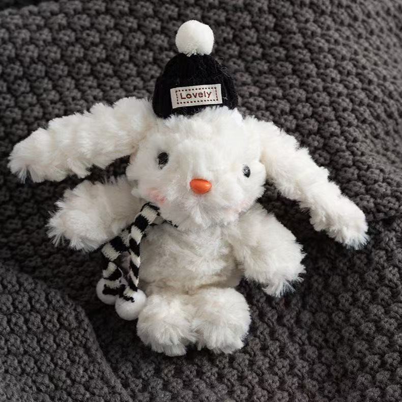 • 봉제 귀가 늘어진 토끼 - 흑백 스카프와 검은 모자
