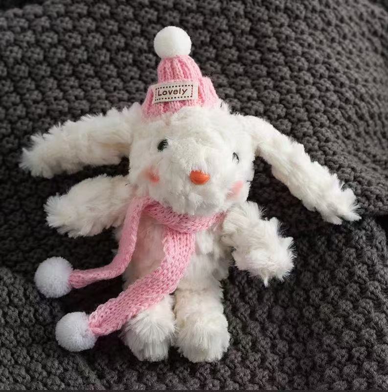 • 봉제 귀가 늘어진 토끼—분홍색 스카프 모자
