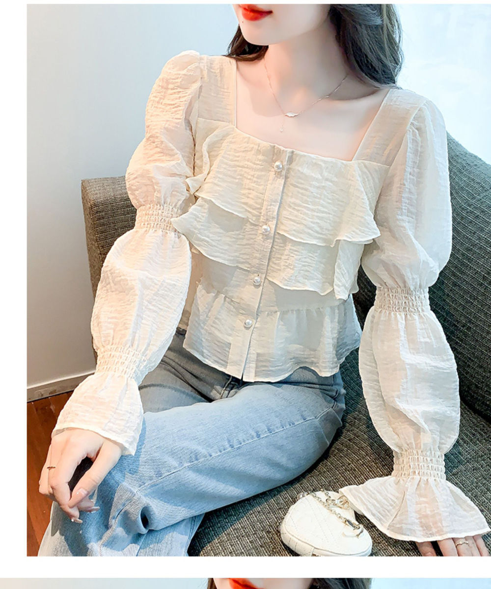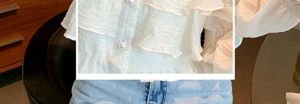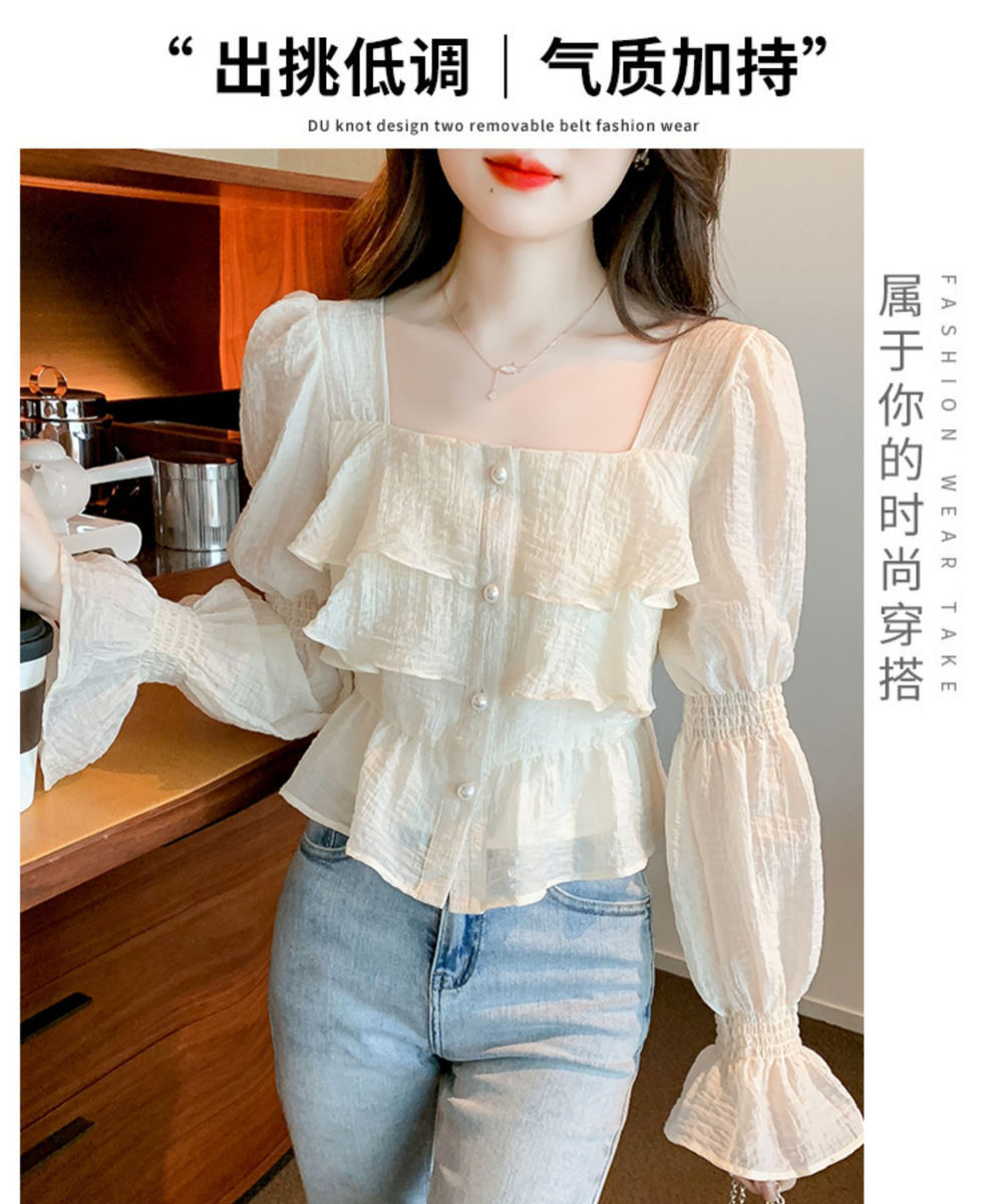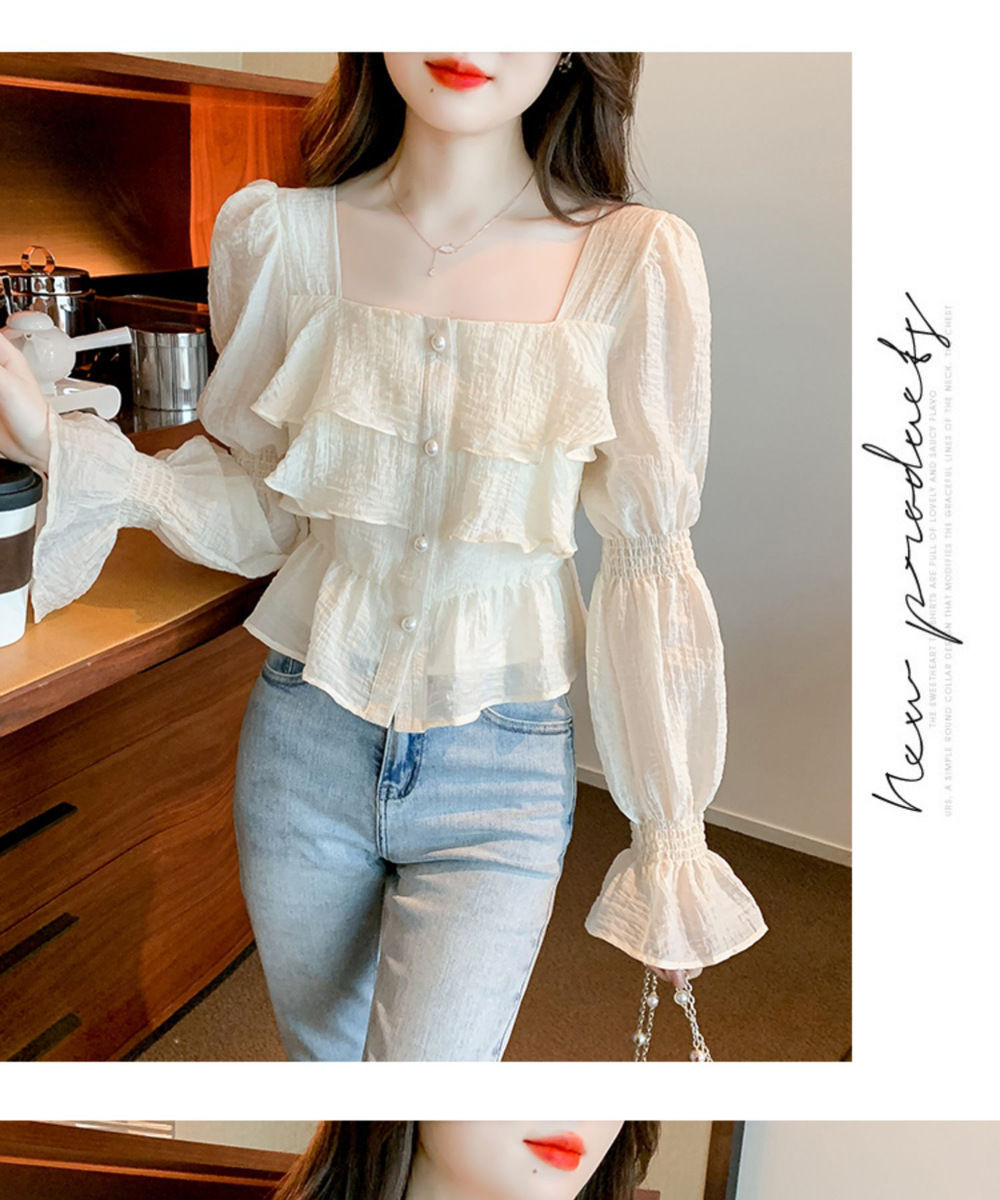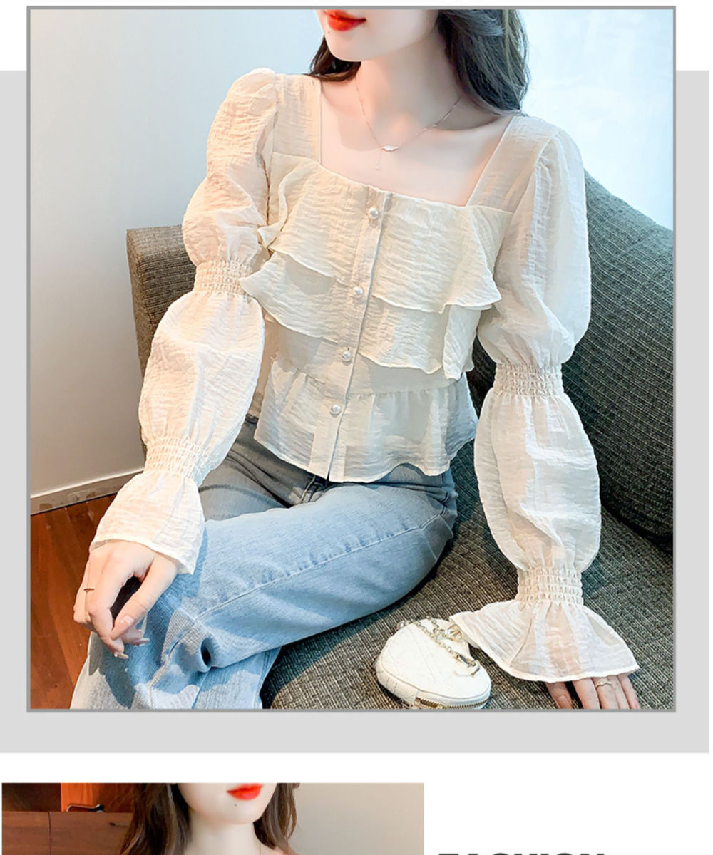 2025 봄 새로운 달콤한 프랑스 디자인 센스 짧은 러플 쉬폰 셔츠 여성용 슬리밍 우아한 랜턴 슬리브 탑스토어 가기