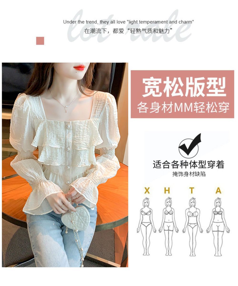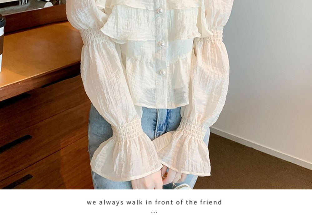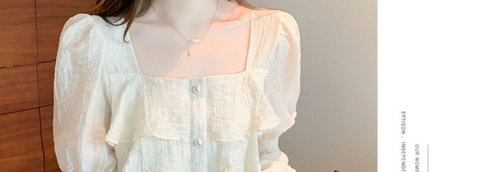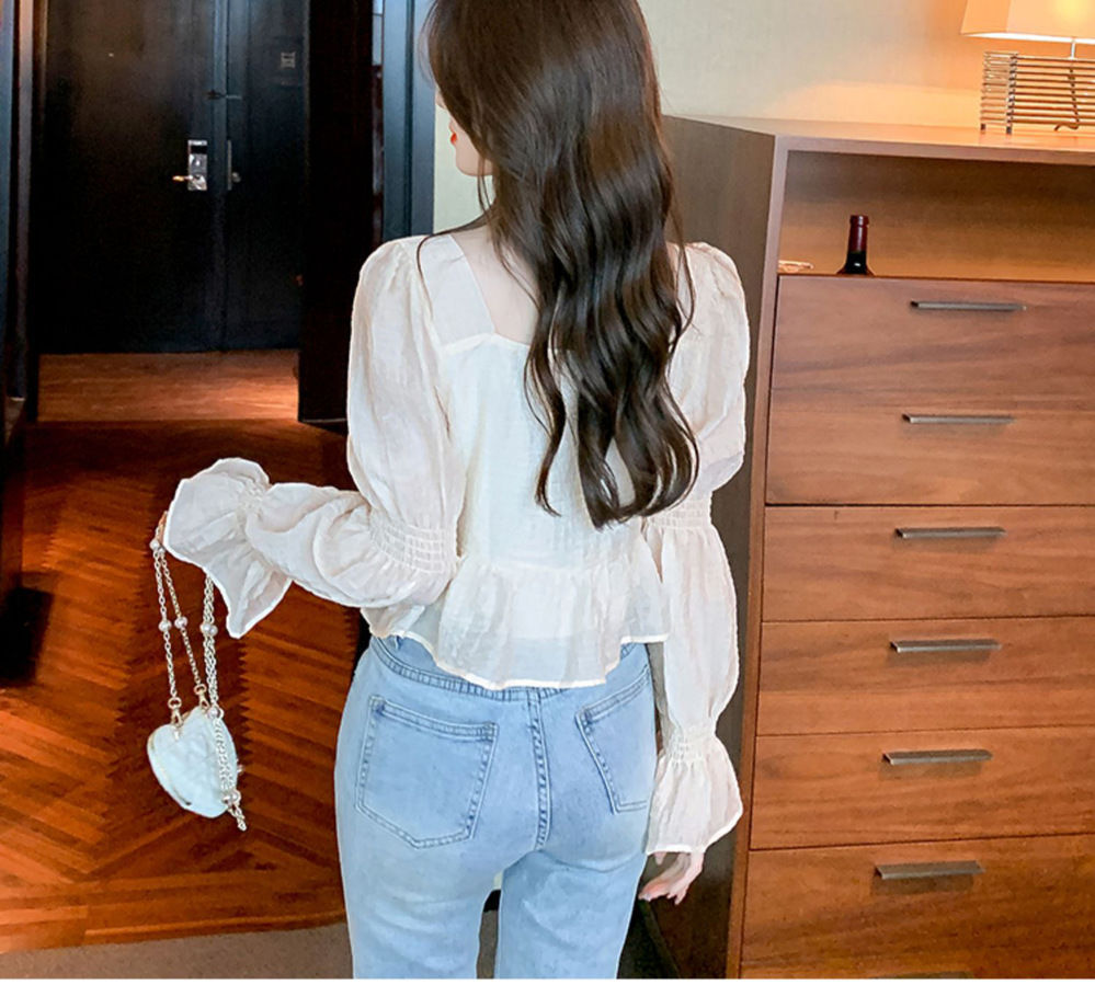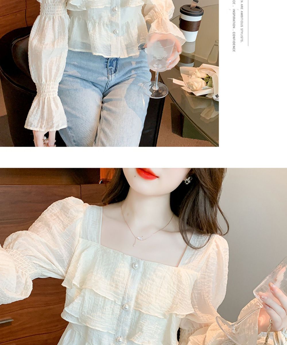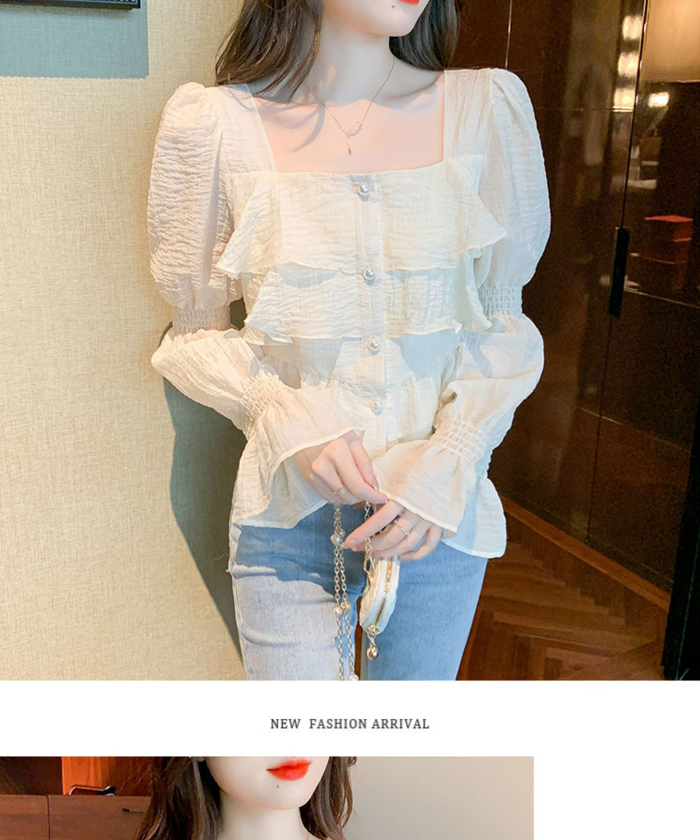 2025 봄 새로운 달콤한 프랑스 디자인 센스 짧은 러플 쉬폰 셔츠 여성용 슬리밍 우아한 랜턴 슬리브 탑스토어 가기