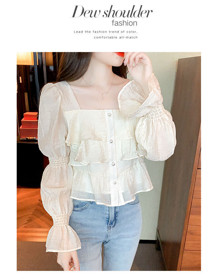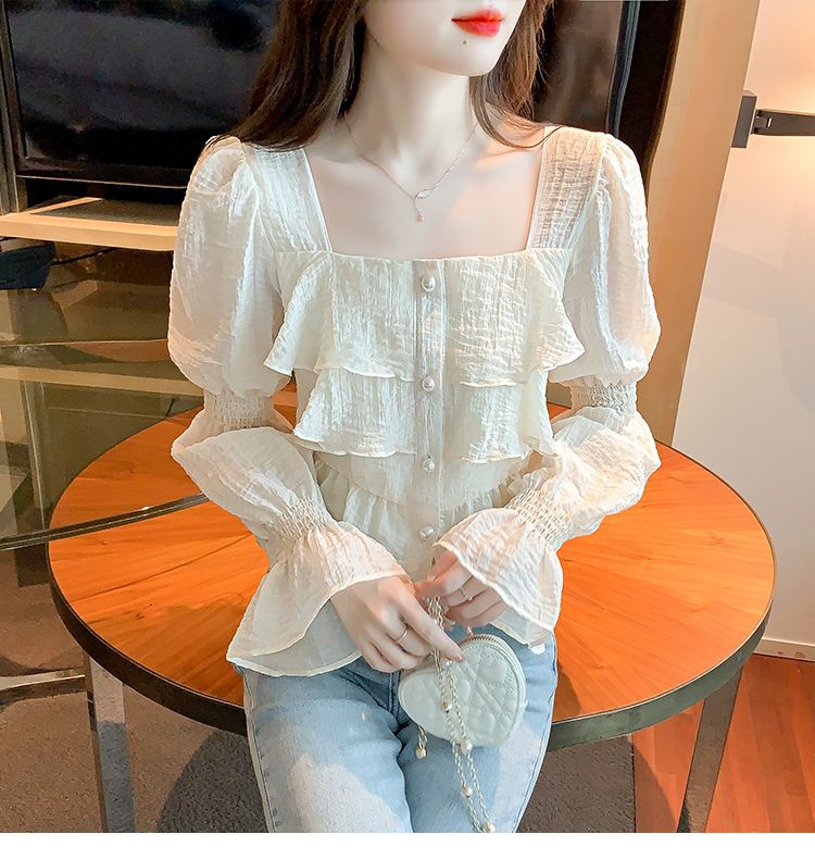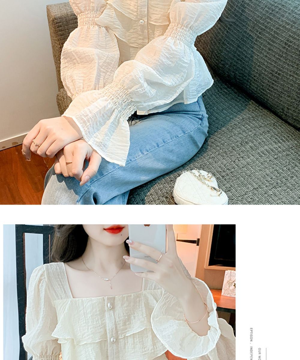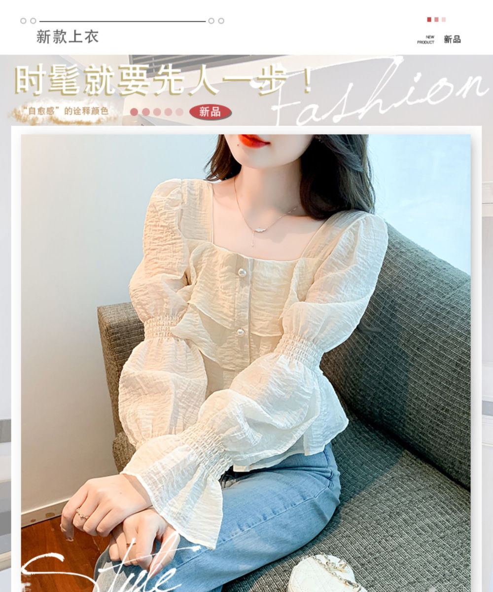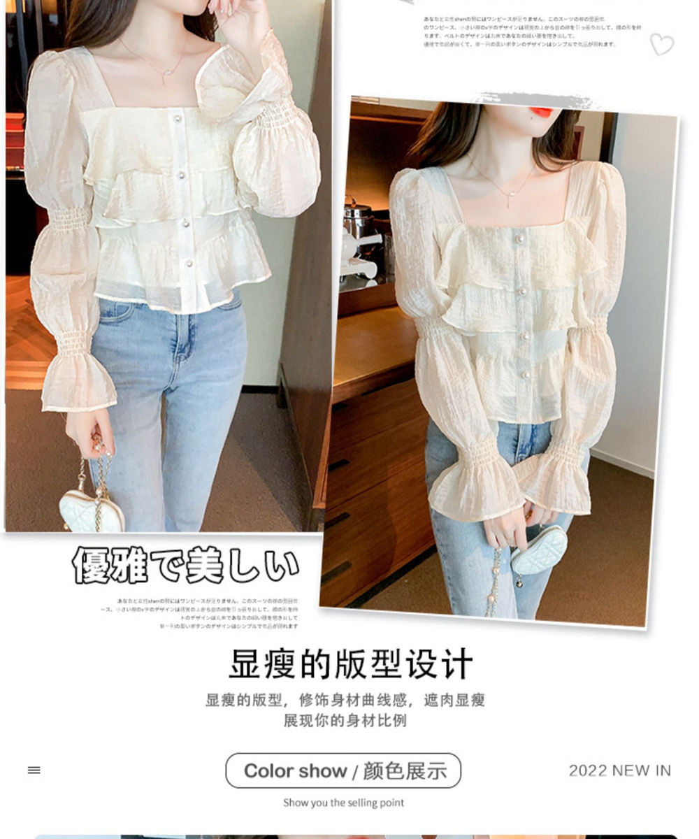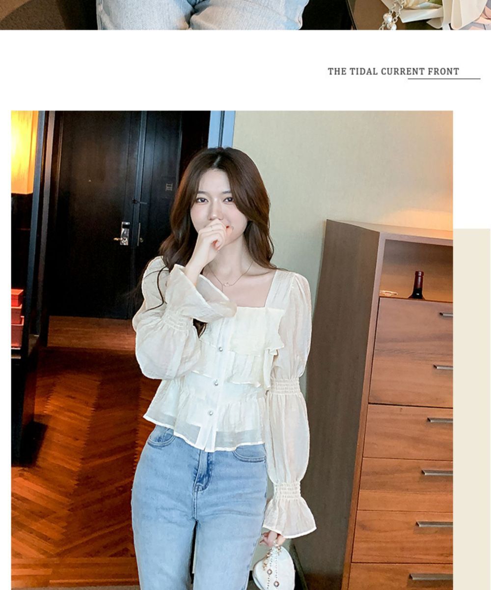 2025 봄 새로운 달콤한 프랑스 디자인 센스 짧은 러플 쉬폰 셔츠 여성용 슬리밍 우아한 랜턴 슬리브 탑스토어 가기