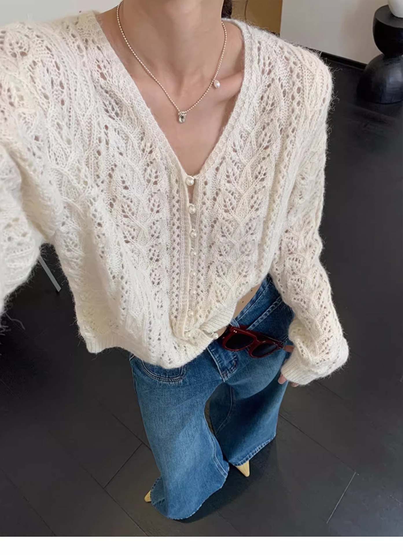 화이트 V-넥 할로우 니트 카디건 재킷 스웨터 여성용 얇은 아우터 작은 봄과 가을을위한 한국식 세련된 탑