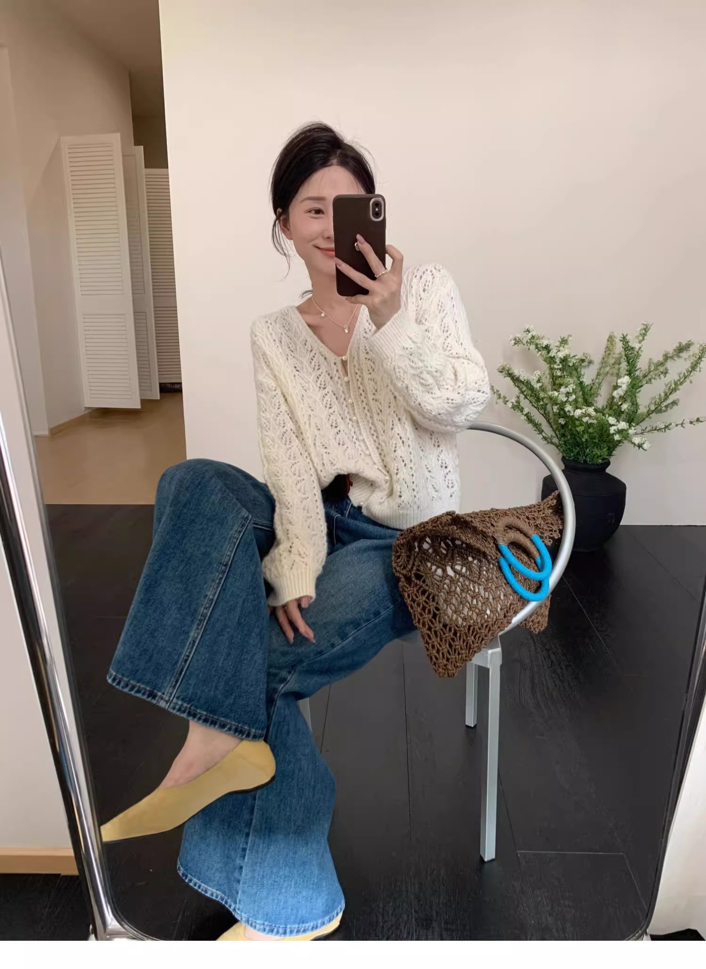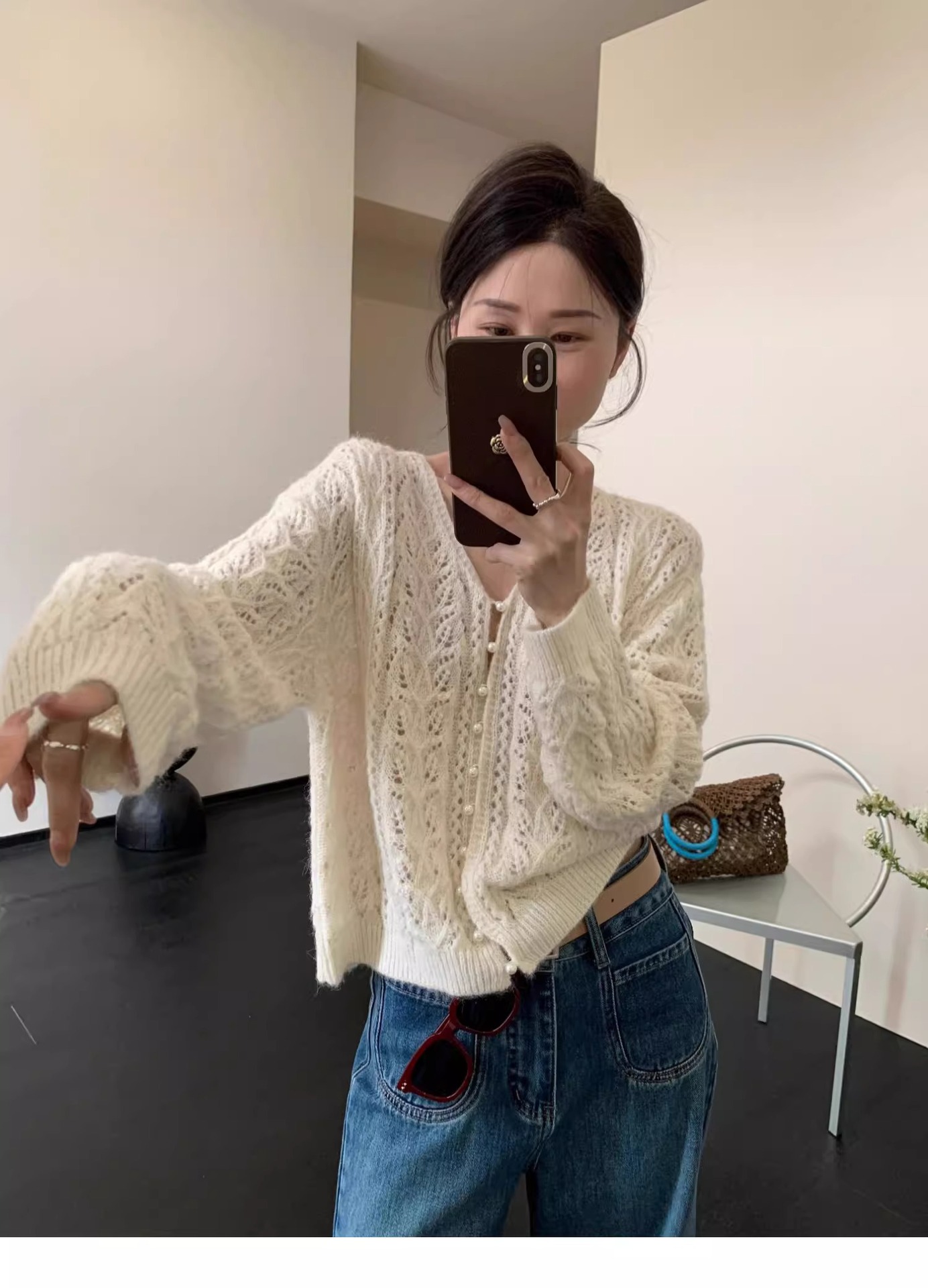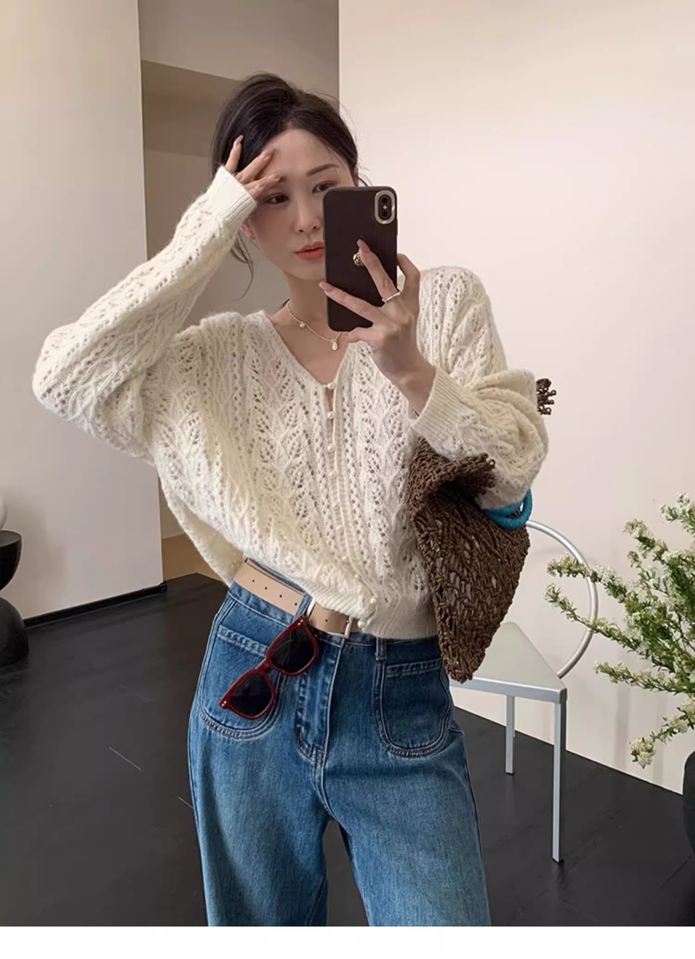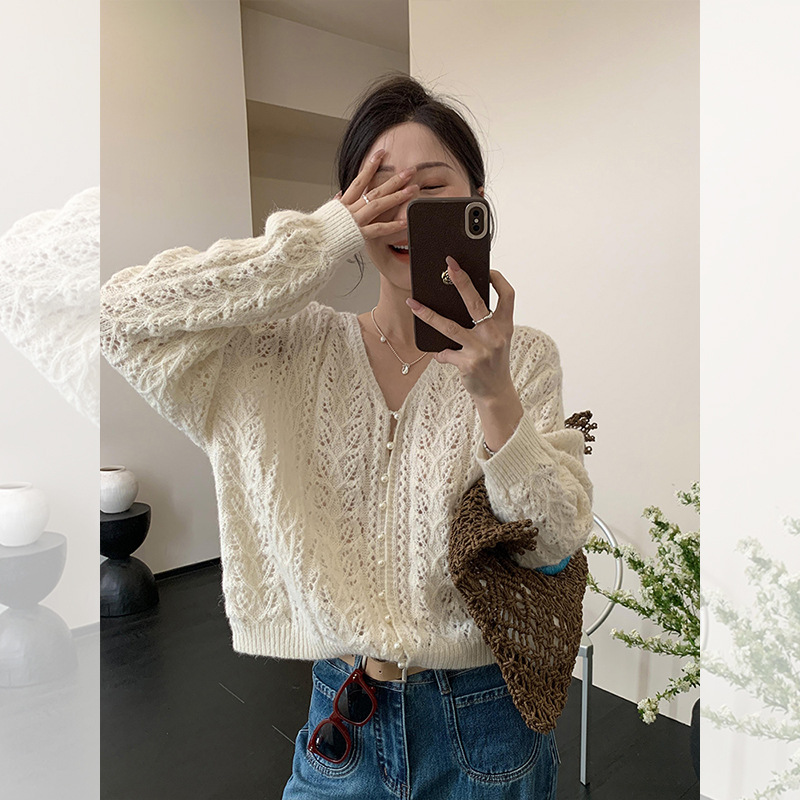 화이트 V-넥 할로우 니트 카디건 재킷 스웨터 여성용 얇은 아우터 작은 봄과 가을을위한 한국식 세련된 탑스토어 가기