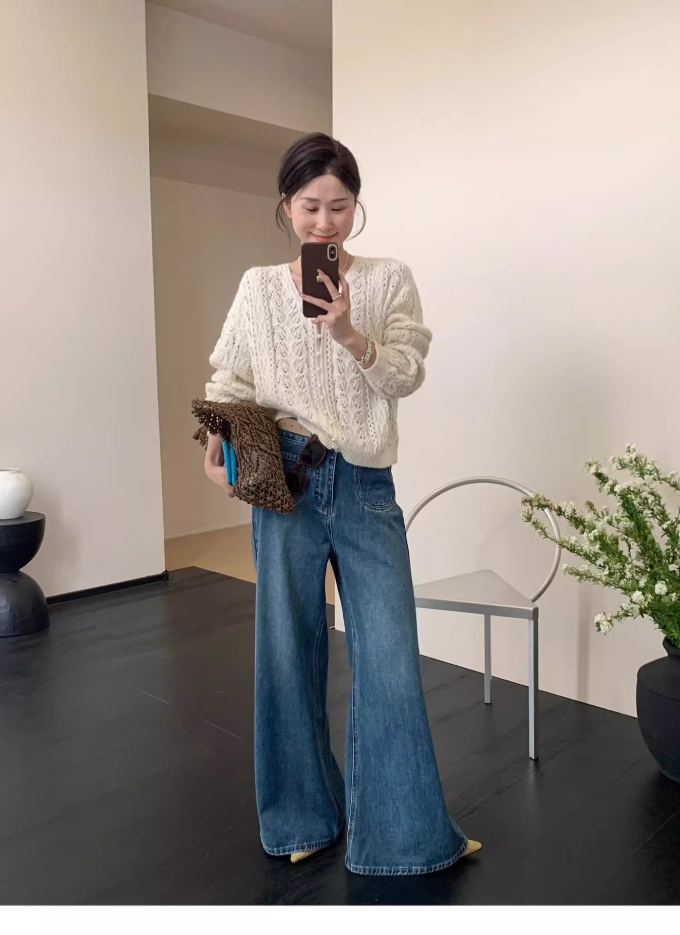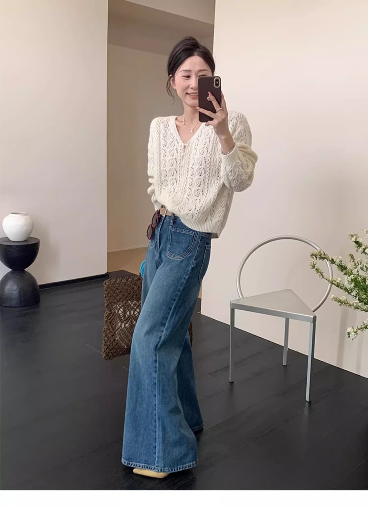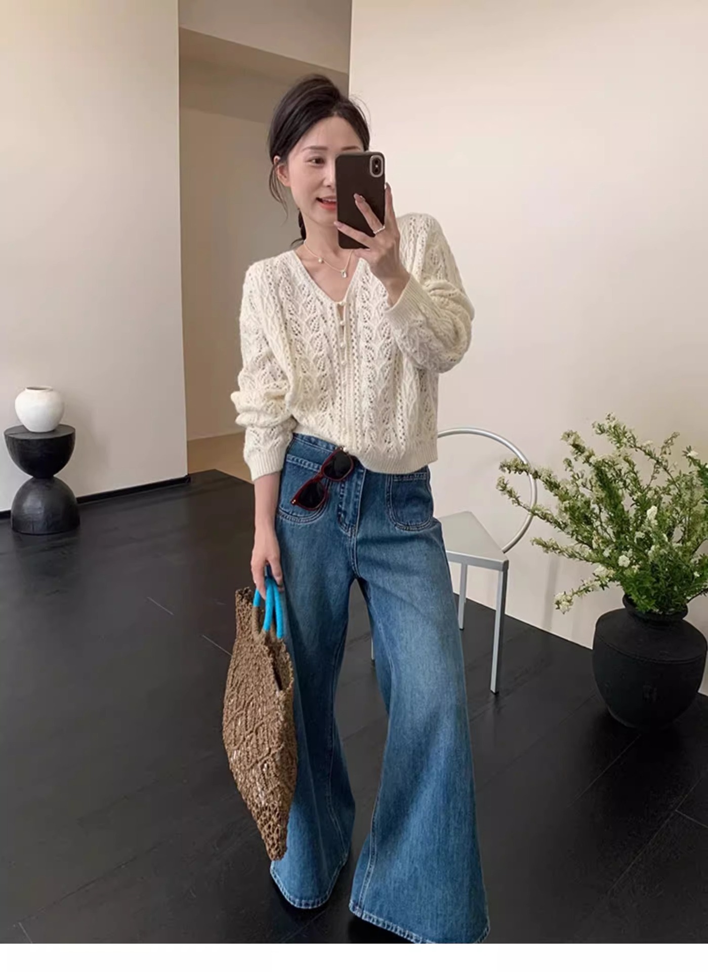 화이트 V-넥 할로우 니트 카디건 재킷 스웨터 여성용 얇은 아우터 작은 봄과 가을을위한 한국식 세련된 탑스토어 가기