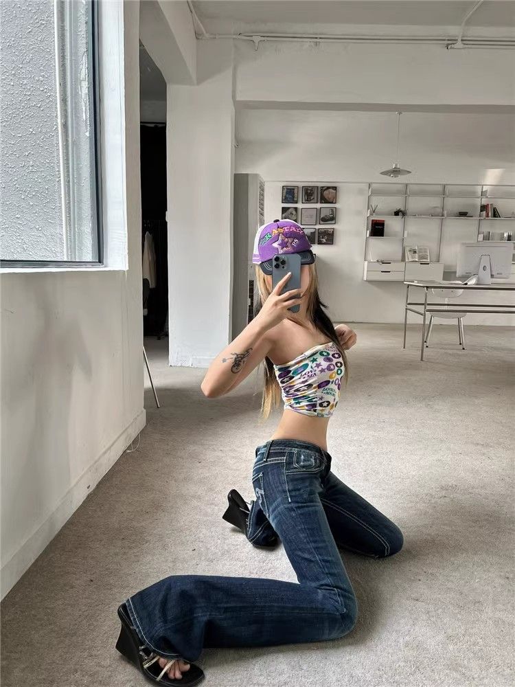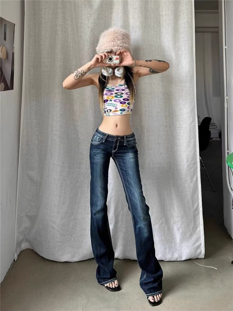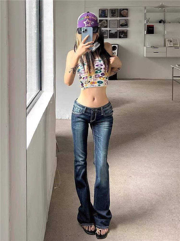 아메리칸 스타일 레트로 하이 스트리트 로우 허리 마이크로 플레어 청바지 여성의 봄과 가을 2025 새로운 슬림 핏 스트레치 트렌디 걸레 바지스토어 가기